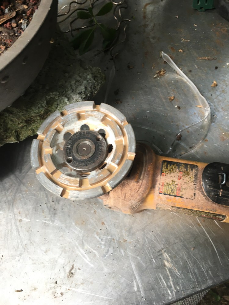 I know how to work my tool. That, my friends, is a DEWALT 4 1/2 Inch Compact Small Angle Grinder – 11 Amp, 11,000 RPM, Paddle Switch, Model DWE402 sporting a 4″ diamond impregnated stone/concrete grinding cup wheel. Do not use while consuming alcoholic beverage or without ear, eye, and breathing protection!!! Jeans or leather pants are a must as well. I prefer leather cuz I’m a rockstar. Ride the snake, baby. To the lake.
