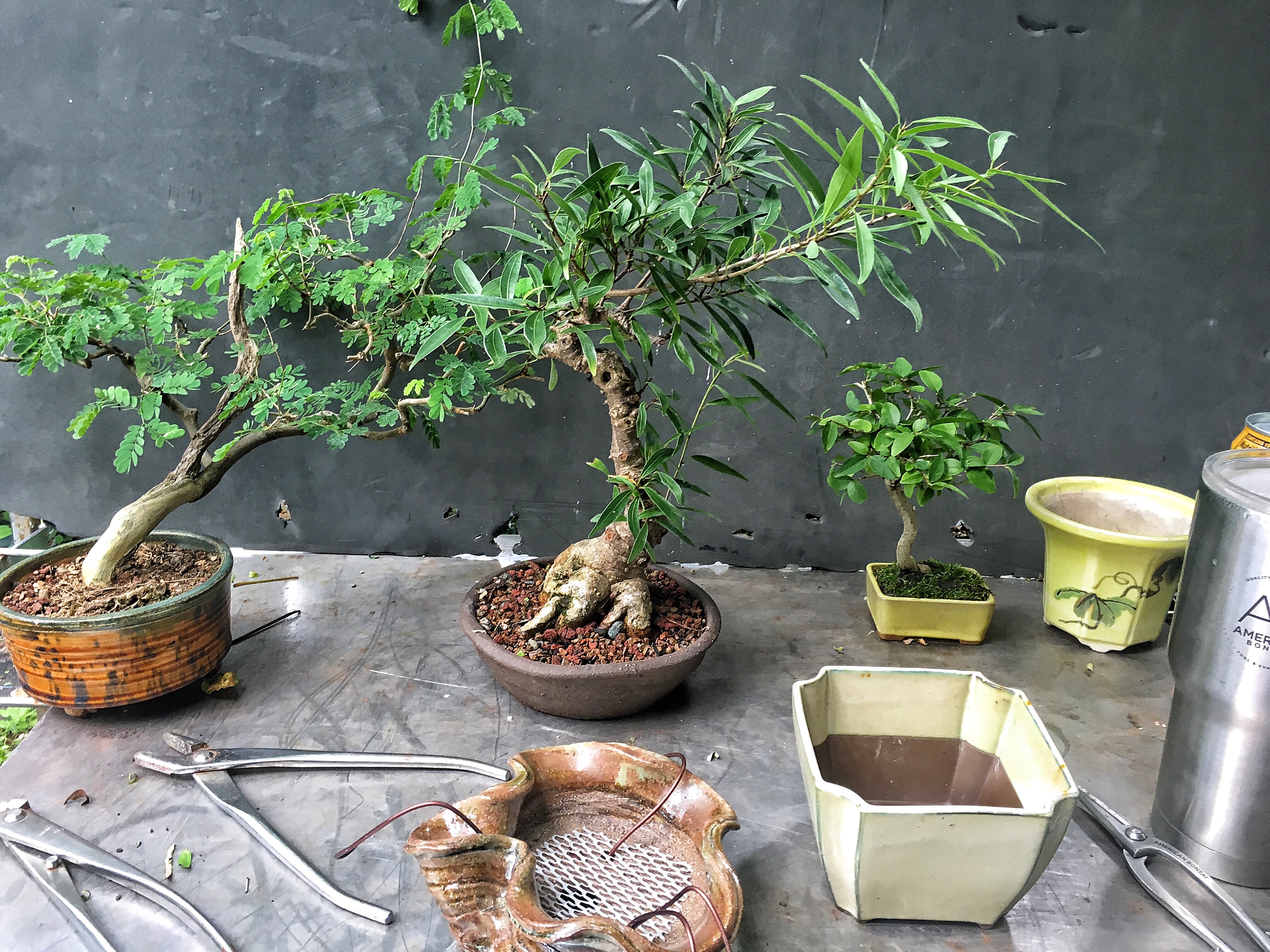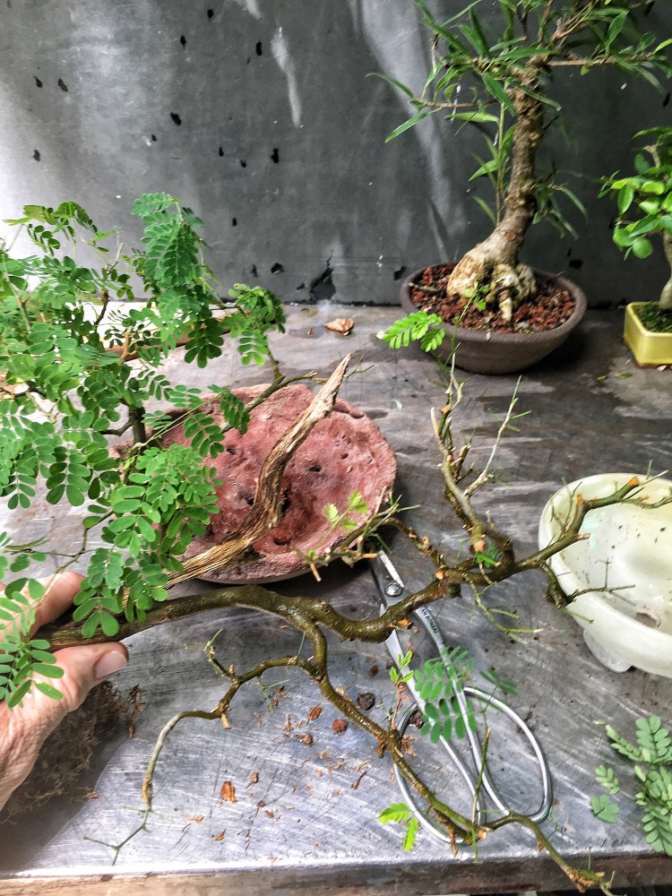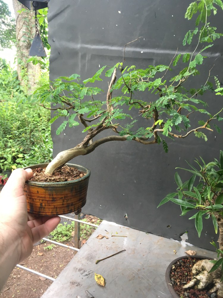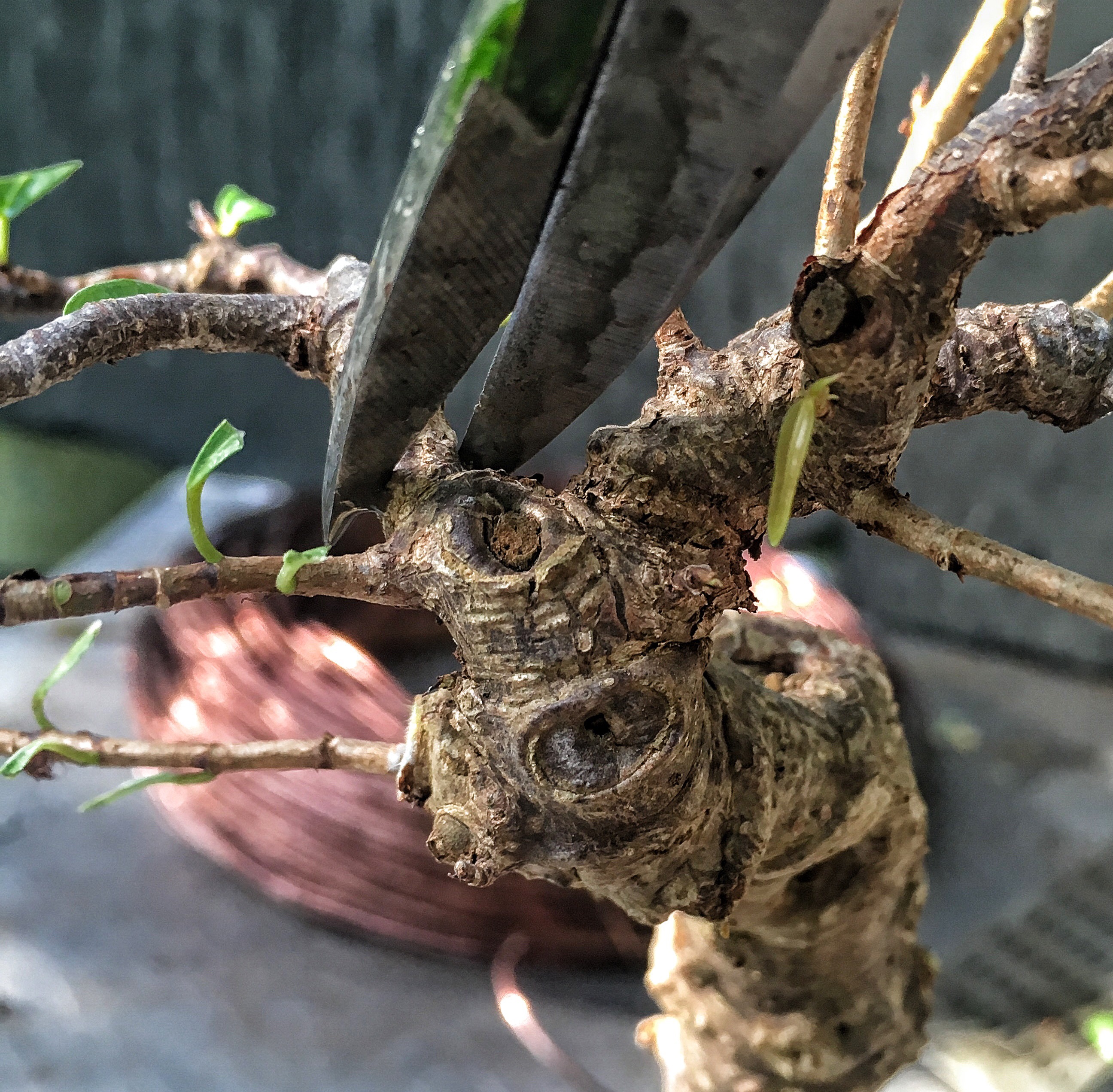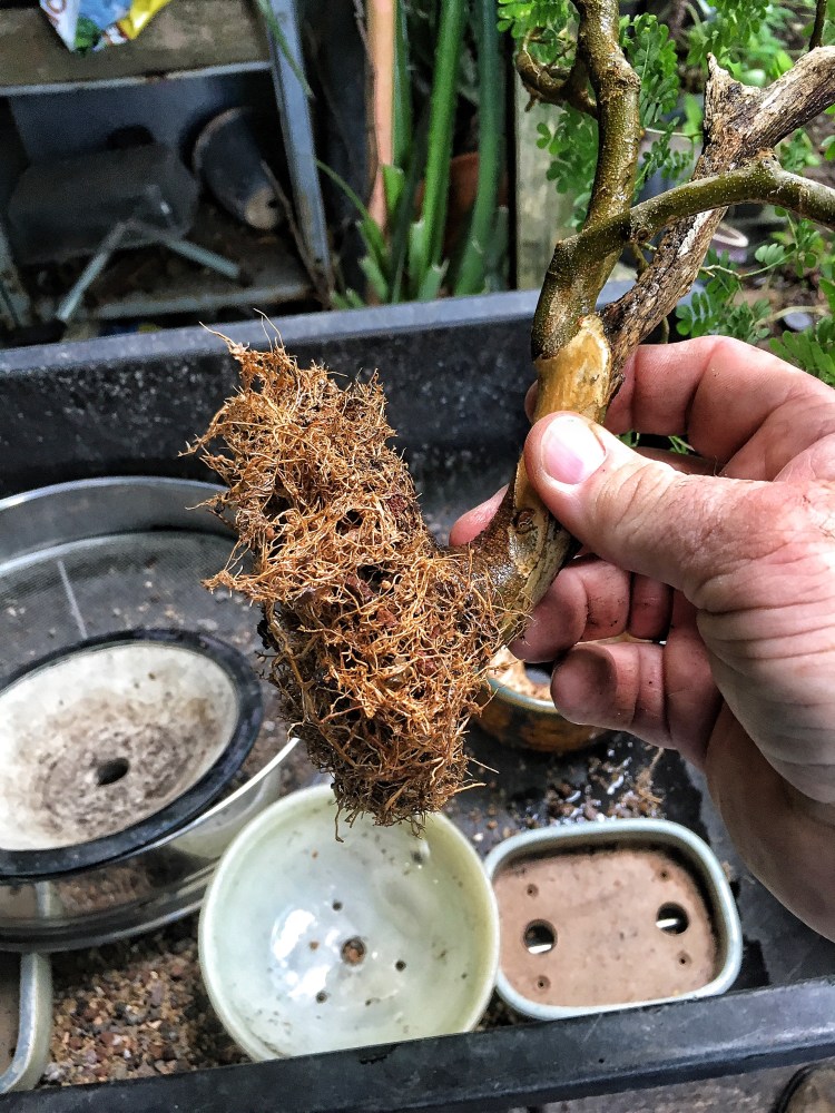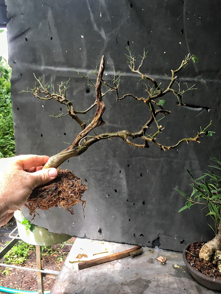 Aftercare. A good application of fertilizer on all three. The raintree will go into the full sun, as well as the water jasmine (I didn’t touch the roots much on it. It went into a bigger pot). But the ficus will go into the shade. That’ll help the fine twigs (thinner than usual for this tree) from getting sunburn. Like this one just did: