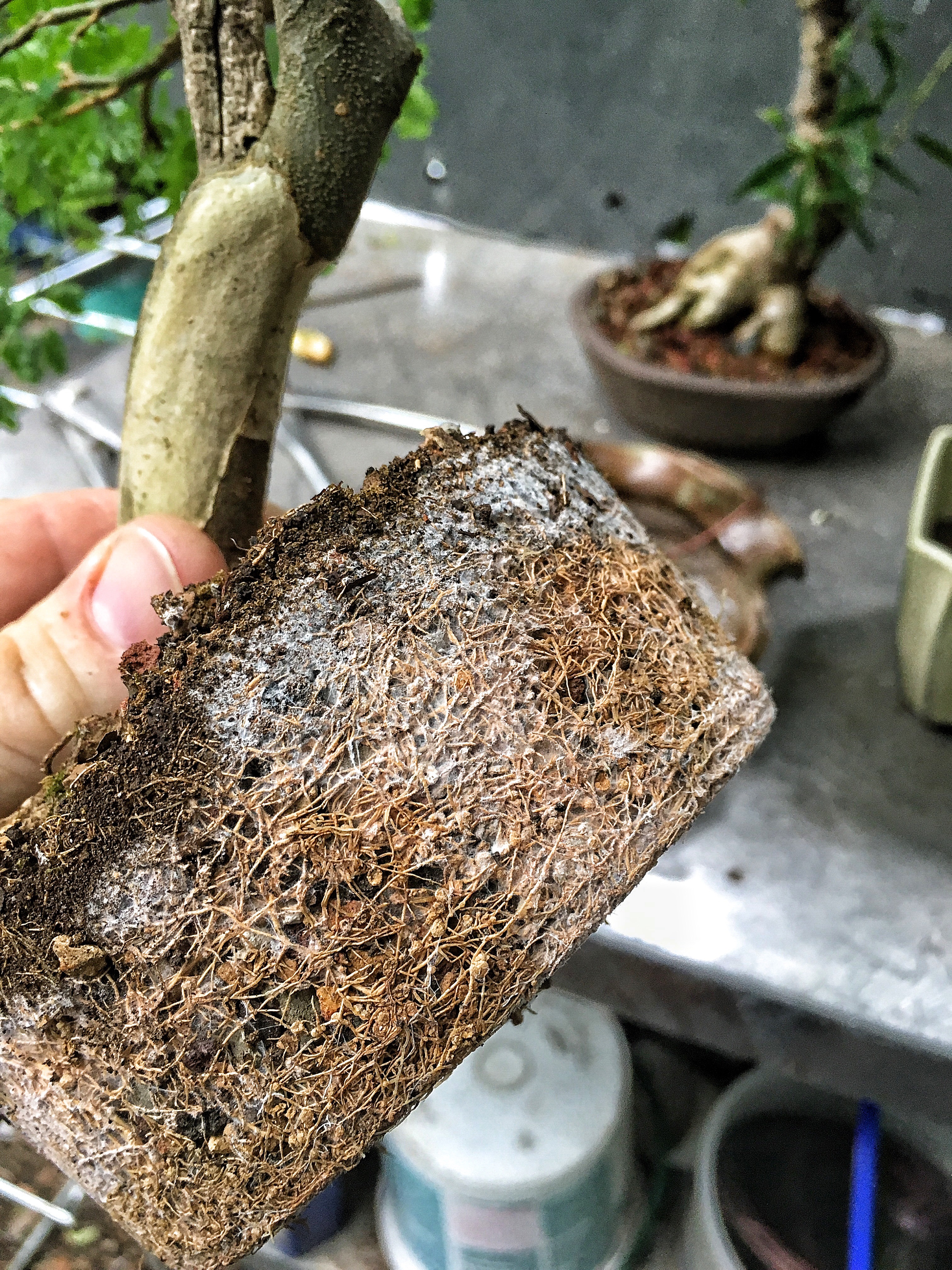 That’s the white fungus. The round balls are the nodules (you can read about them a little more in this post). It’s adapted to my neglect, the nodules feed nitrogen to the mycchorizae and the mycchorizae feeds it (and helps with water uptake) to the tree. Or something like that. The roots are so thick that even removing half of them, there’s still a thick mass left.