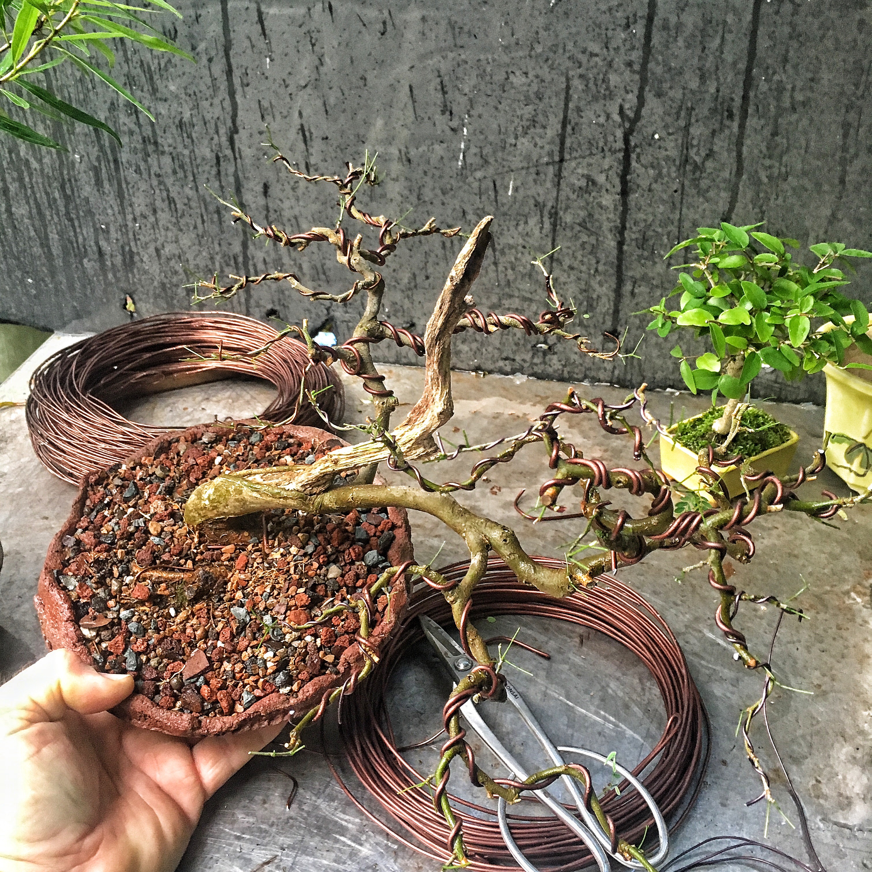Well, first, I do it so you all out there in the ether can see the branch structure in my photographs. Scroll back up to the after pic of the wrightia…..can’t see much except leaves there, can you? You can’t really see how I applied the wire or how I placed the branches, can you? Not really instructive that way. Just kind of a before and after.