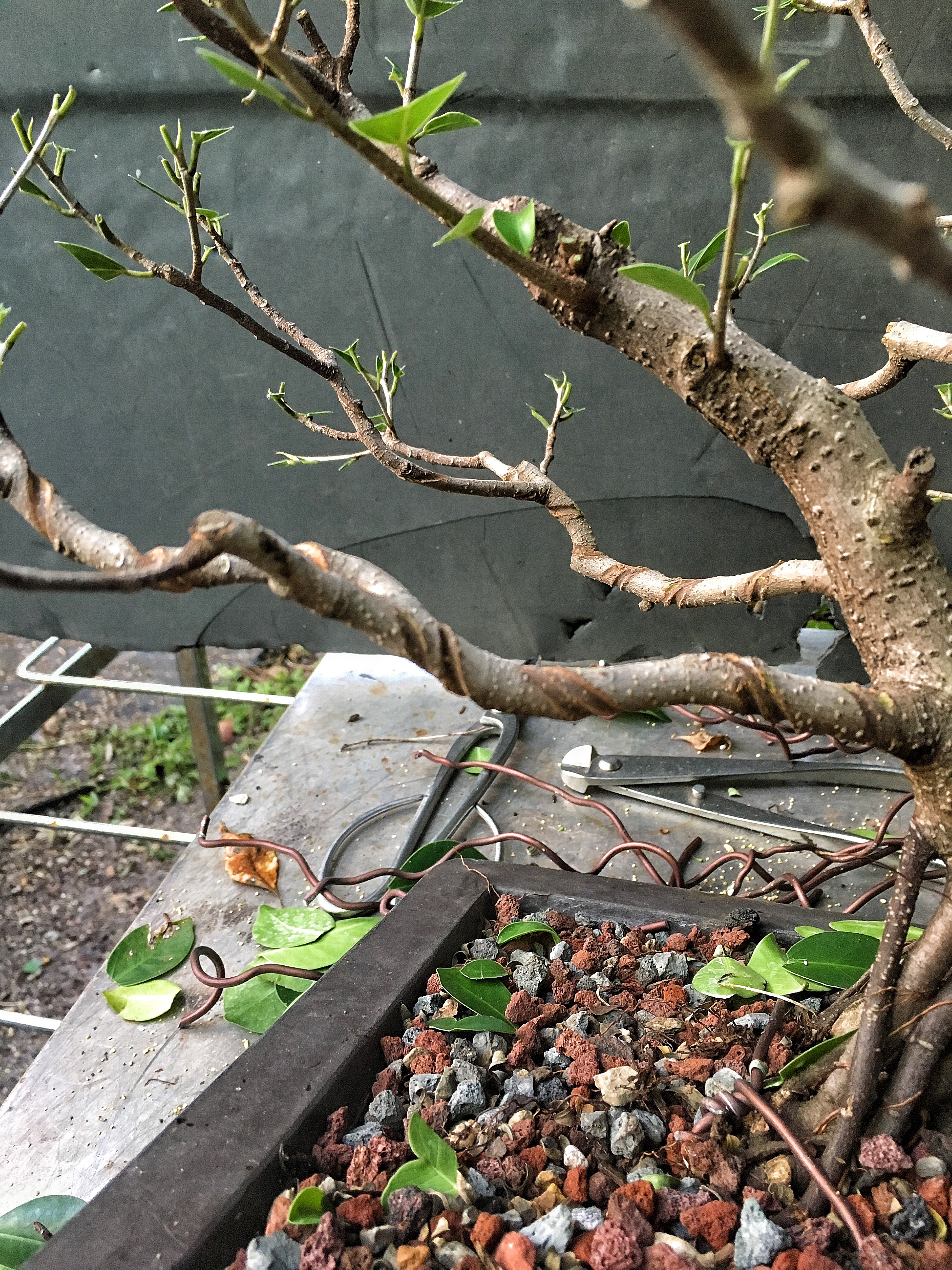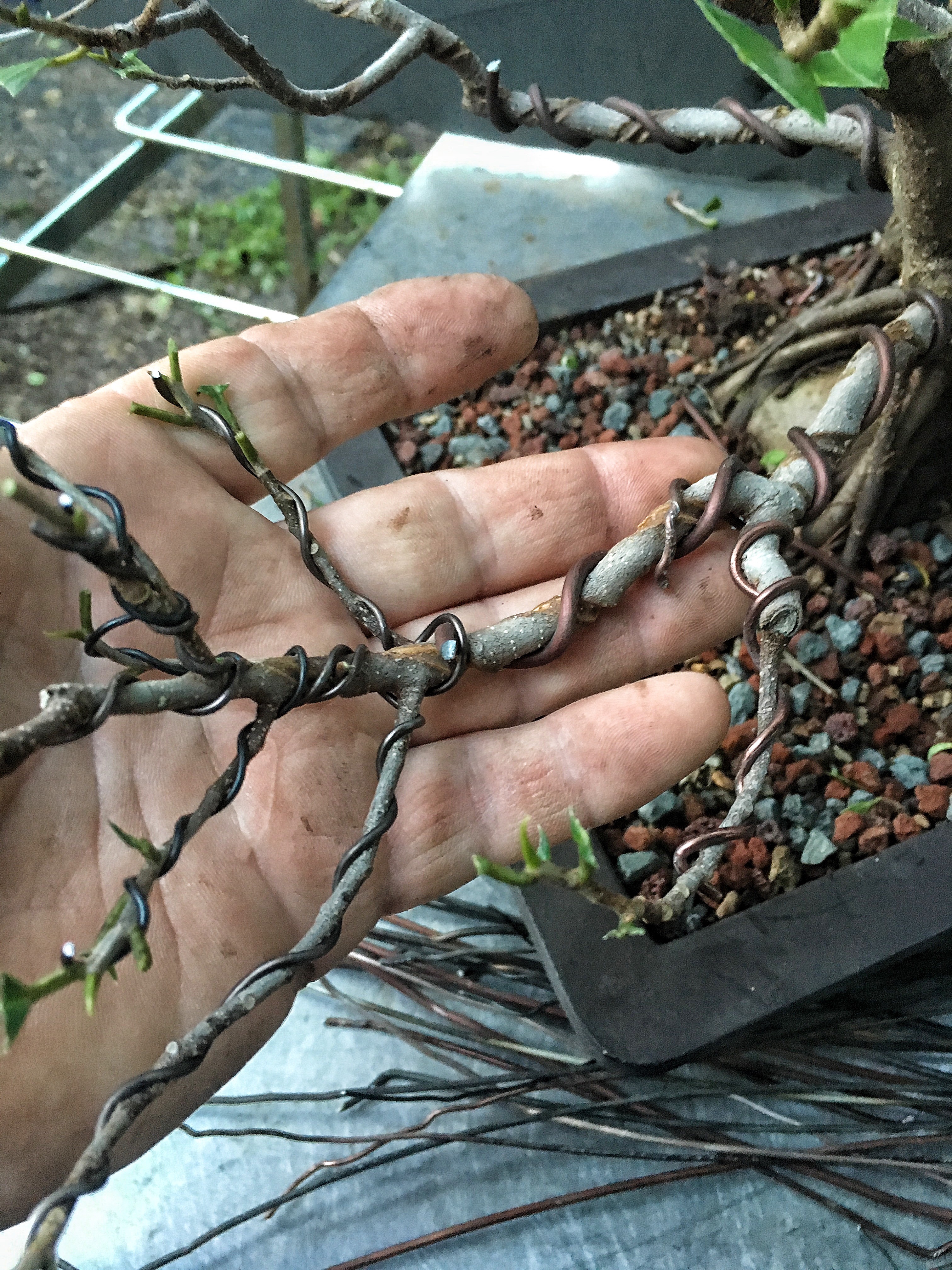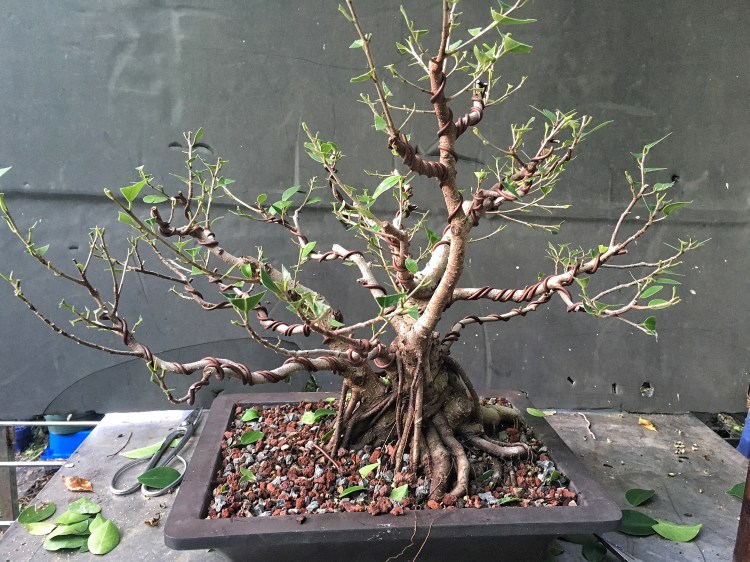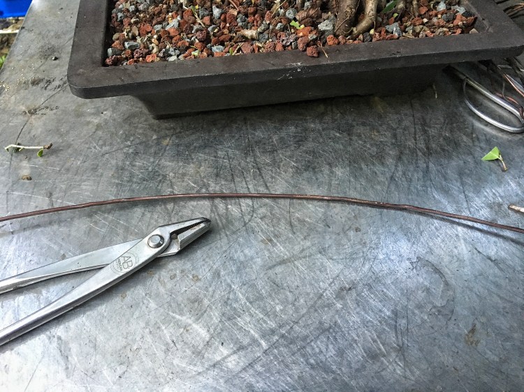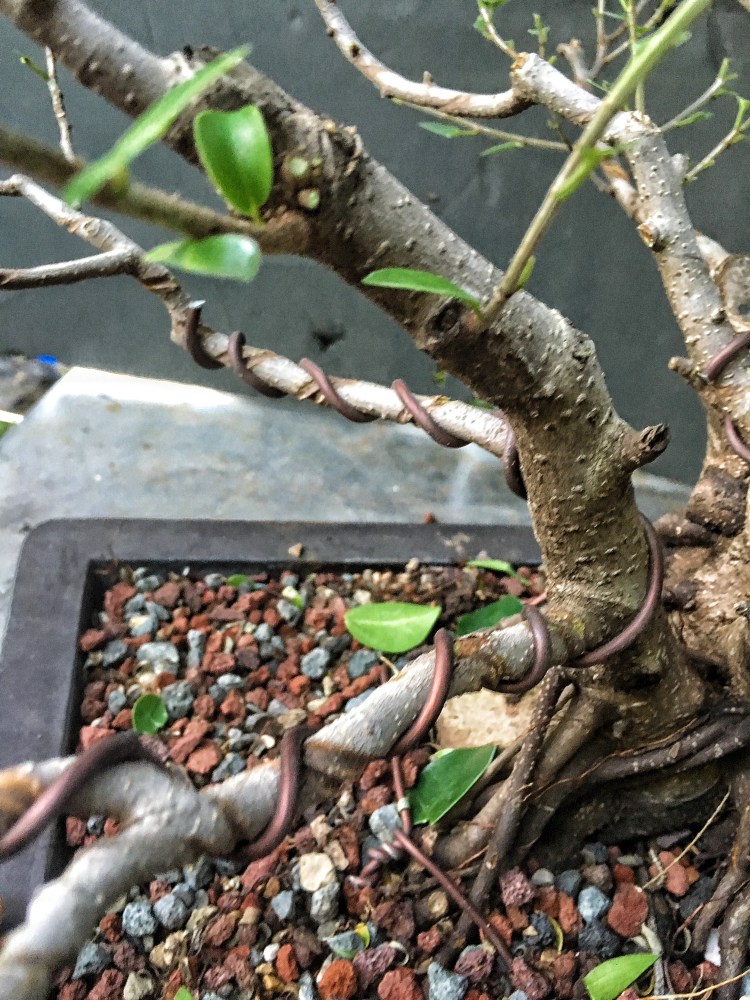 It looks bad but, it is a ficus, it will grow out. The whole theory of wiring is that, by wrapping a wire around a branch, be it copper or aluminum, we can then place the branch in an aesthetically pleasing attitude and position (evoking age, gnarly-ness, etc) and then, as the branch grows, it stays in that position. But the branch has to grow, and, especially with ficus and some other strong and fast upright growers like elms or maples, if the branch doesn’t grow around the wire (“cut in” as we usually say, though it’s the tree and not the wire doing something) , it won’t stay in place, and all that time and wire will have been wasted.