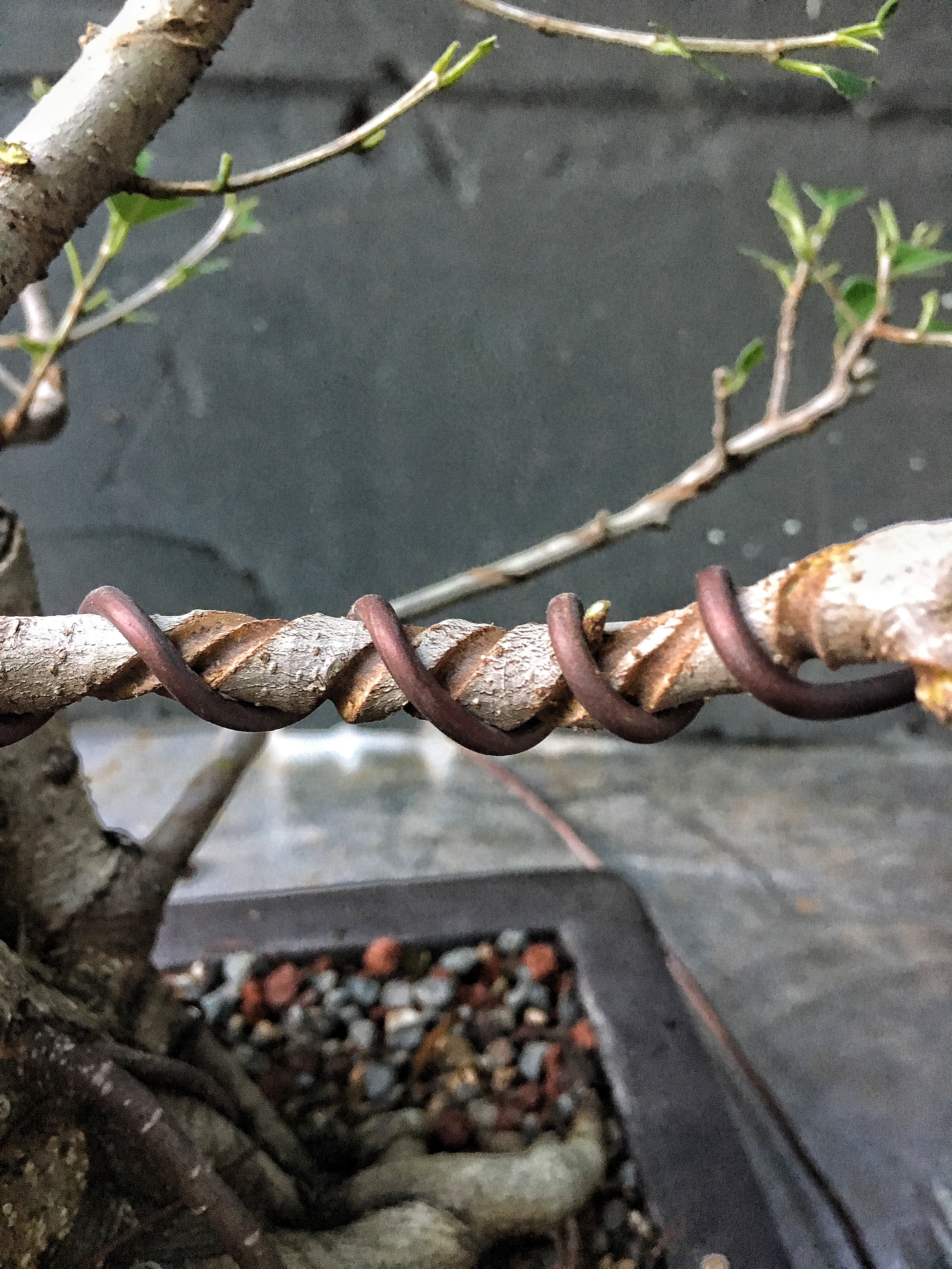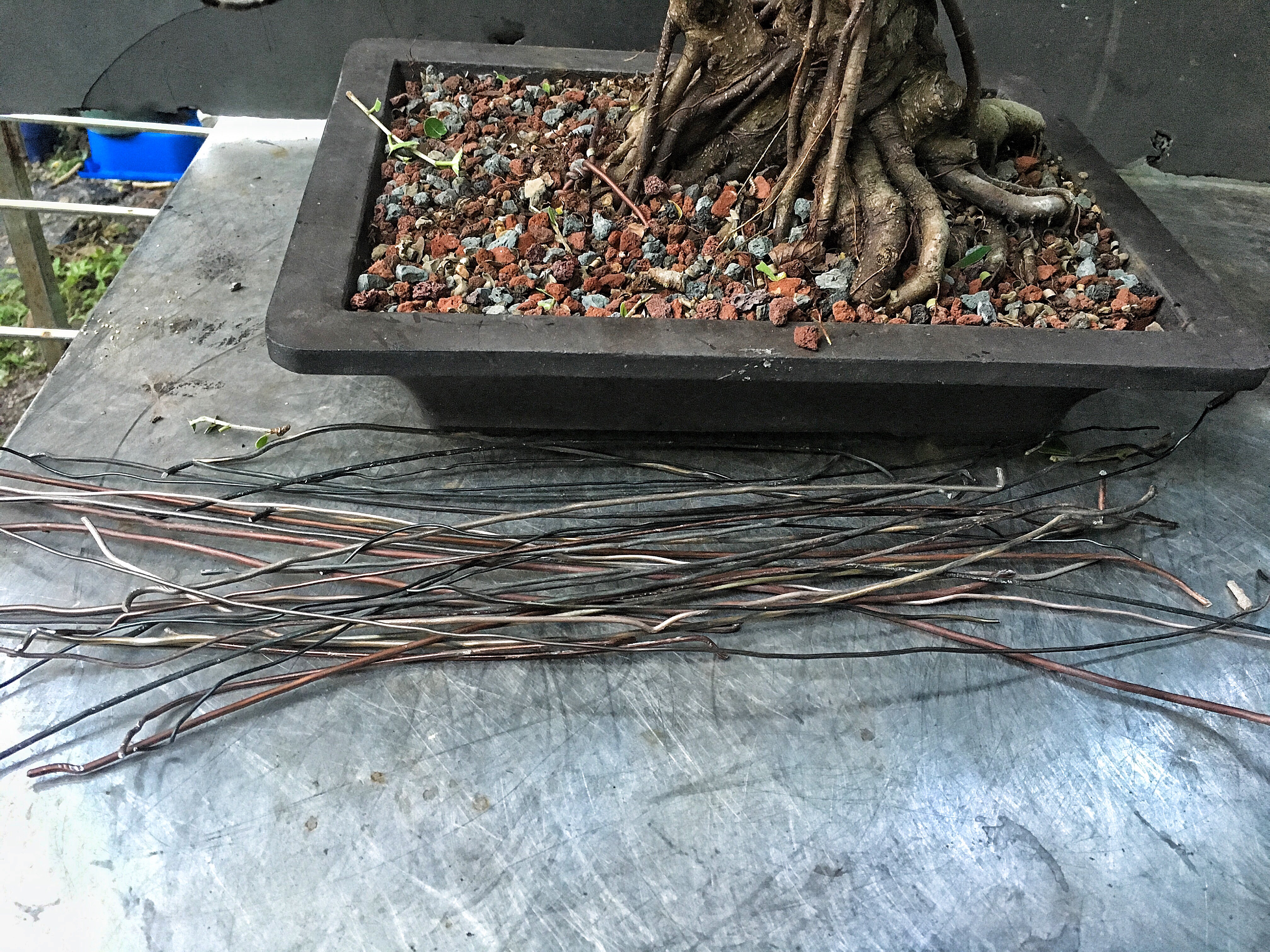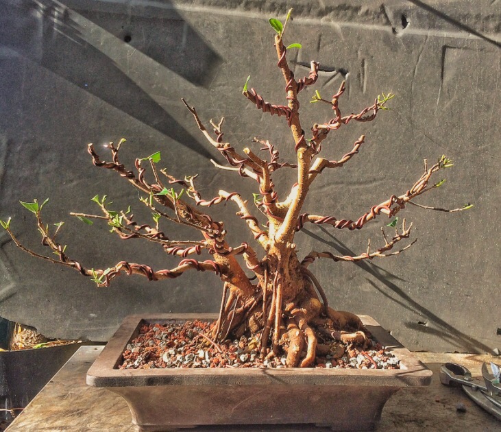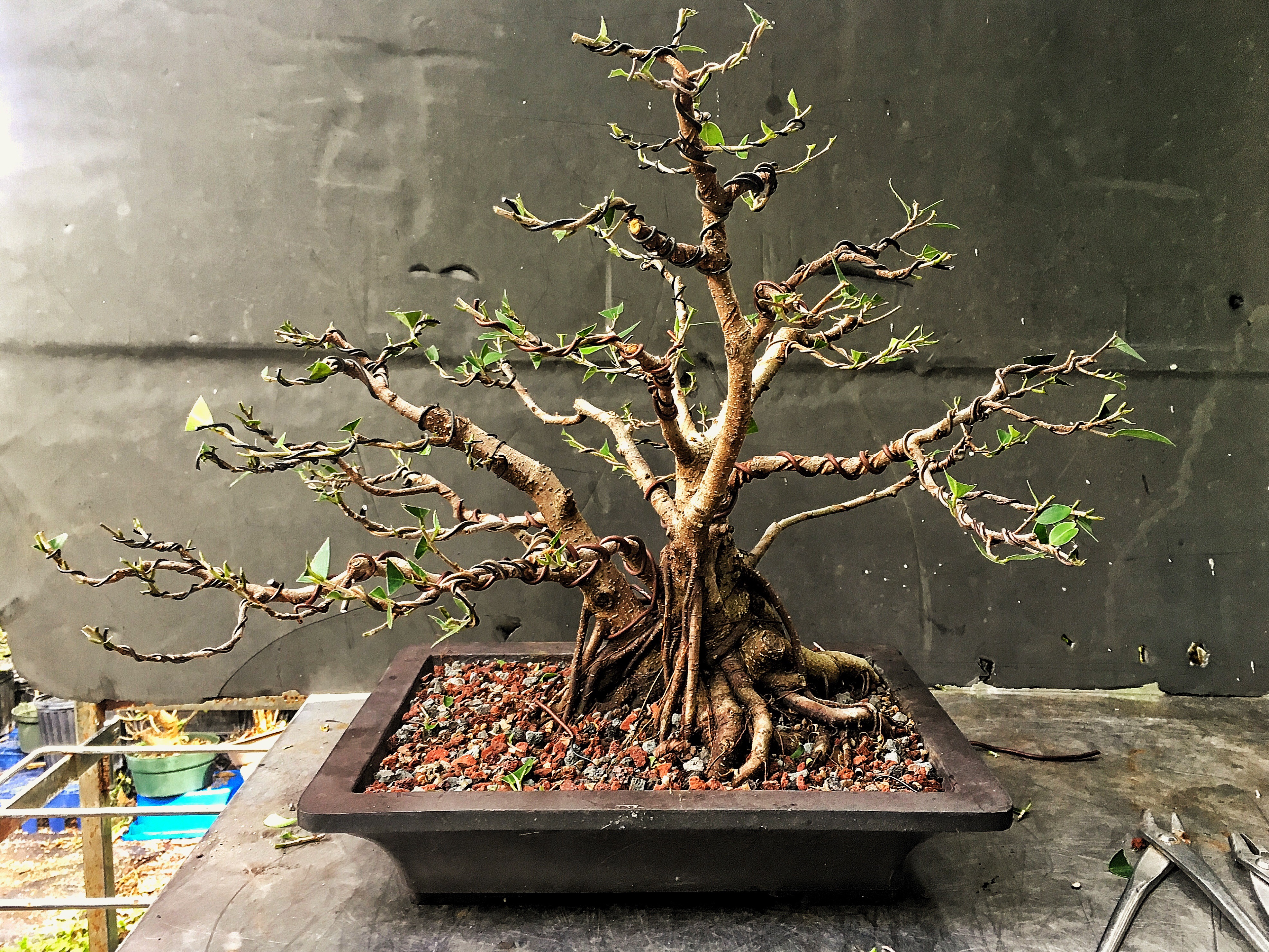 It looks bad but, it is a ficus, it will grow out. The whole theory of wiring is that, by wrapping a wire around a branch, be it copper or aluminum, we can then place the branch in an aesthetically pleasing attitude and position (evoking age, gnarly-ness, etc) and then, as the branch grows, it stays in that position. But the branch has to grow, and, especially with ficus and some other strong and fast upright growers like elms or maples, if the branch doesn’t grow around the wire (“cut in” as we usually say, though it’s the tree and not the wire doing something) , it won’t stay in place, and all that time and wire will have been wasted.