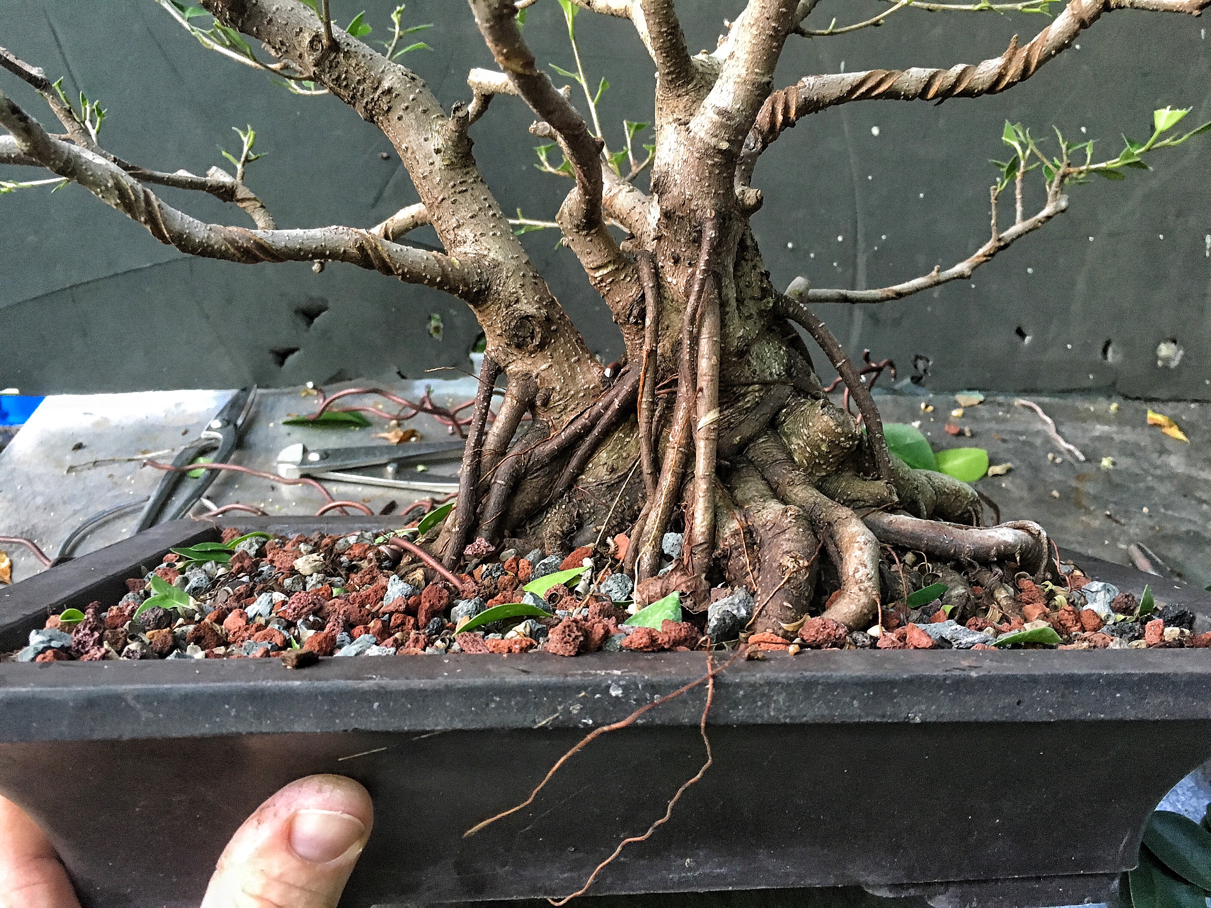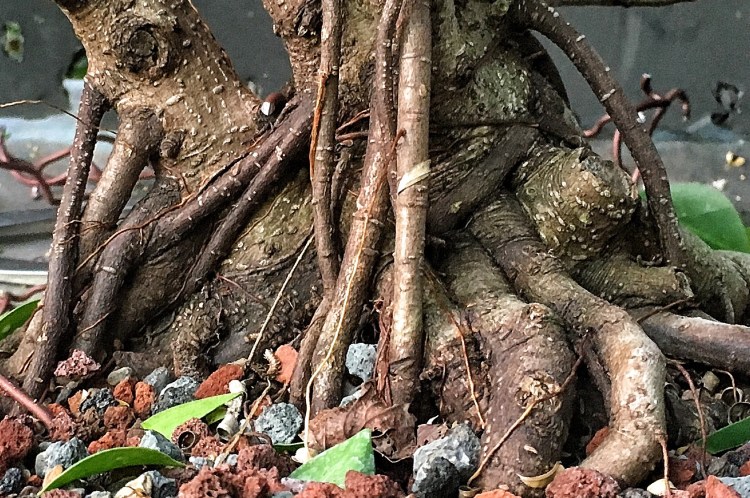 I am really liking the development of this one. I am hoping to develop the green island that I have in a similar way. I have an unrelated question about willow leaf ficus. I have two: one is an older tree in a bonsai pot and the other a stock plant in a nursery pot, but both have a small number of yellow leaves on them now, and last winter they dropped a lot of leaves. I think the leaf drop last winter was due to overwatering, but now I am sure to let them become dry to the touch before watering and I am not sure what the issue is. The soil is a mix of lava rock and bark, and they have been fertilized well. I am wondering if it could be hard water, but that does not seem to be affecting any of my other trees. I thought I would ask you.