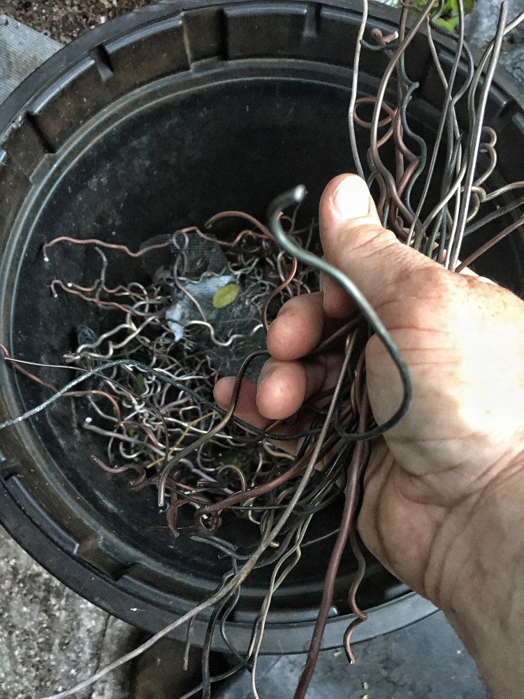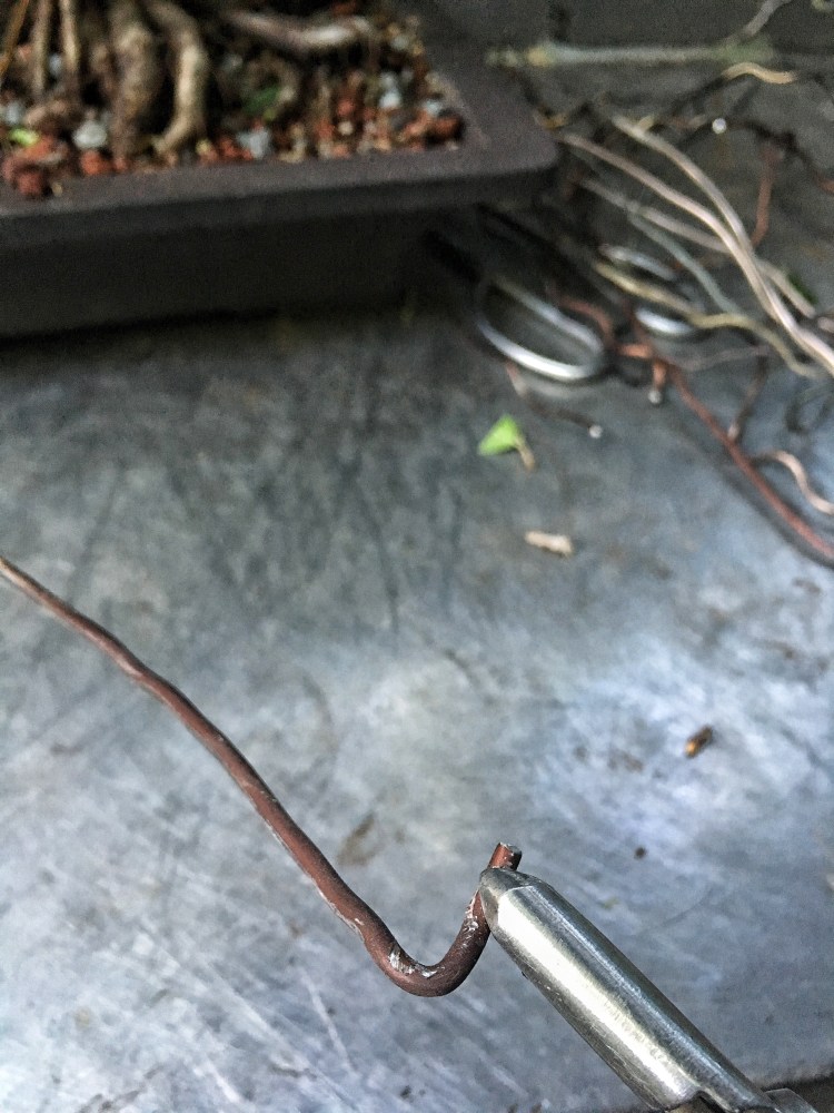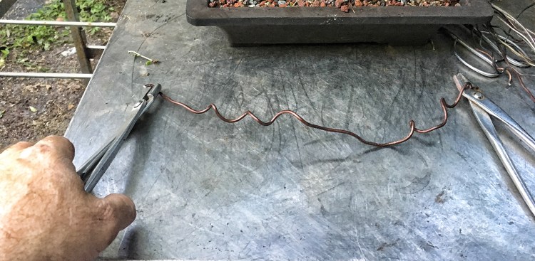 If you’ve been reading the blog of late (instead of just looking at the pics and ogling my manly hands) you’ll recall that I’ve been making a big deal about teaching you respect for the branch and unwinding wire instead of cutting it off (contrary to what all good wire salesmen teach). One plus to unwinding is you have intact wire, instead those half circles of sharp, twisted torture devices (which are easy to kneel on and can pierce one of the 11 bursa of the knee) and you can re-use it. (For those that must cut it off, there is an opportunity to recycle it as well, American Bonsai Tools, one of my sponsors, has a deal called the Re-Wire™ Recycling Program. For every ten pounds of aluminum wire you send them, you get $50 in American Bonsai wire.)