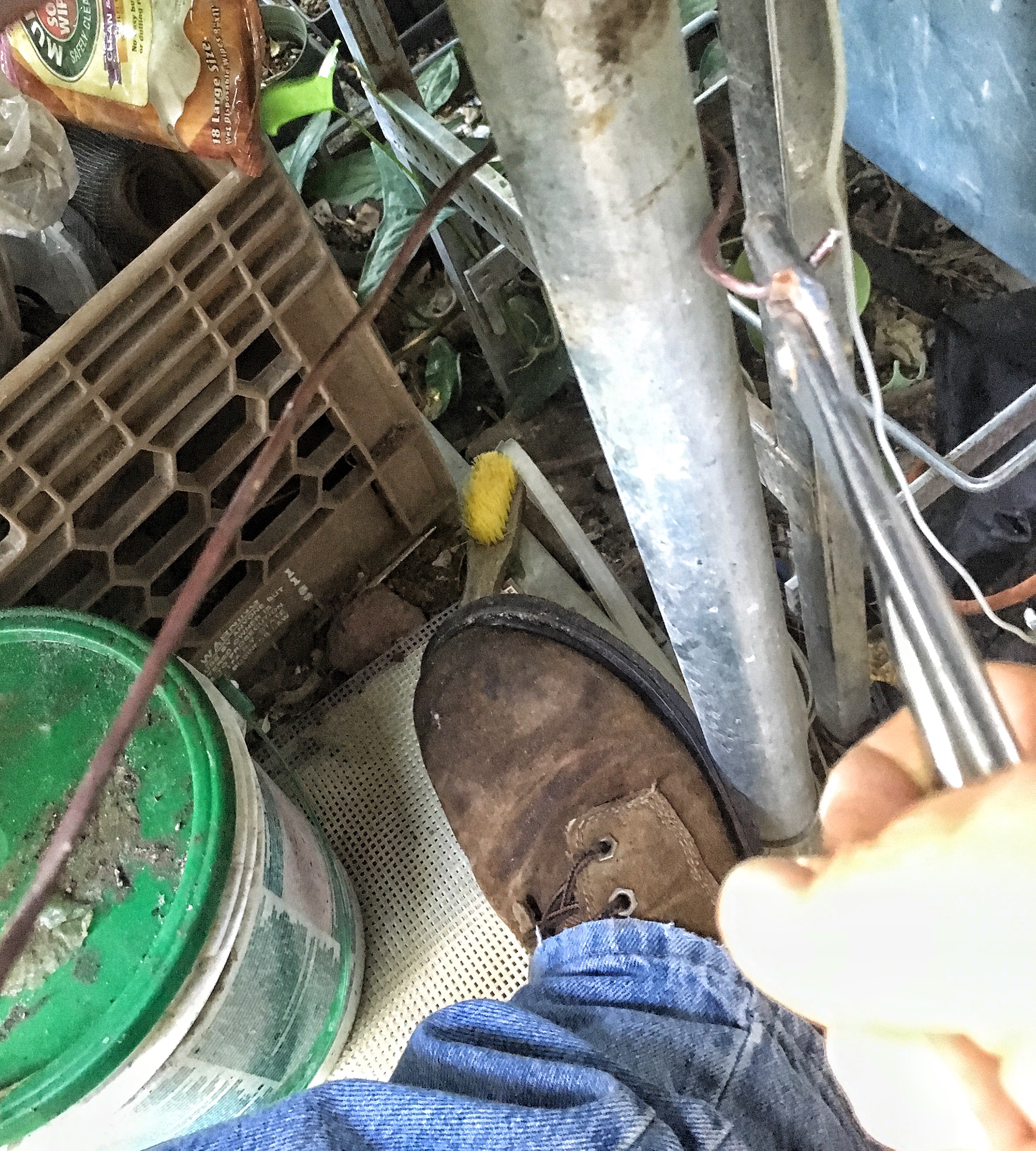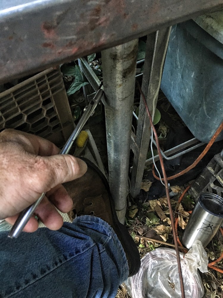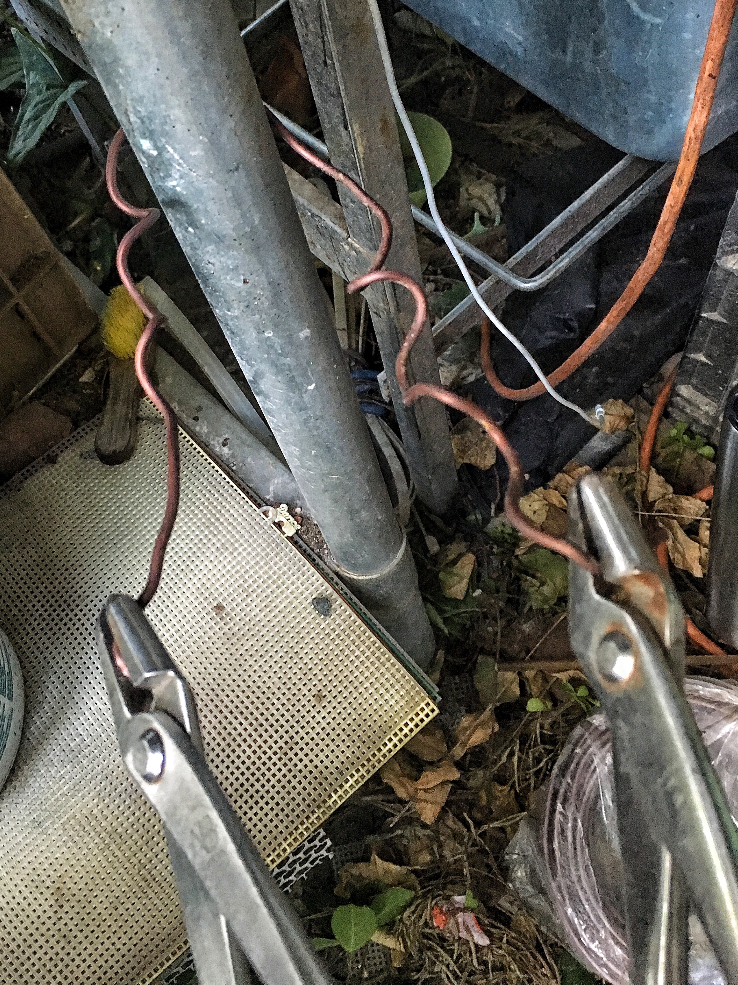 it’s all twisted and kinked, like my soul. As you may know, when you bend metal, it becomes what the metallurgists call “work hardened”. When it’s bent and moved it becomes harder to bend. Copper is especially susceptible to this, which is why you have to generally cut it off a tree and can only reuse it if you anneal it (heat it to a particular temperature) to soften it up again. Aluminum is less prone to work hardening, but it still happens. But that’s not so bad, it’s the kinks and twisted parts we have to deal with. What you need is a pole and two pair of pliers. I know. Sounds like a set up to a joke….