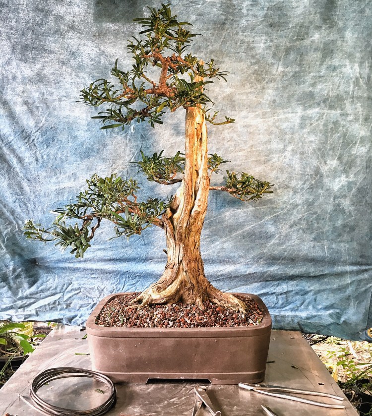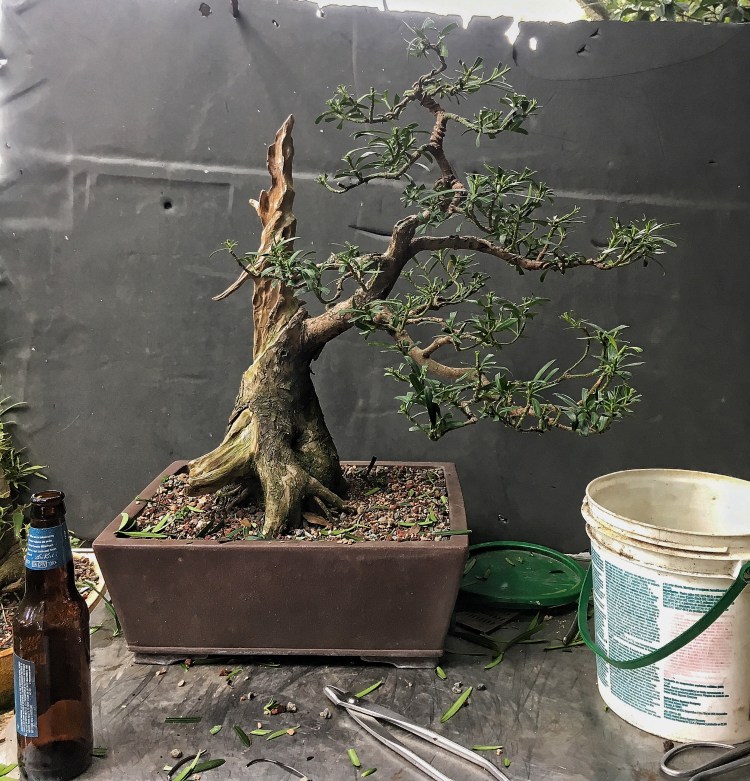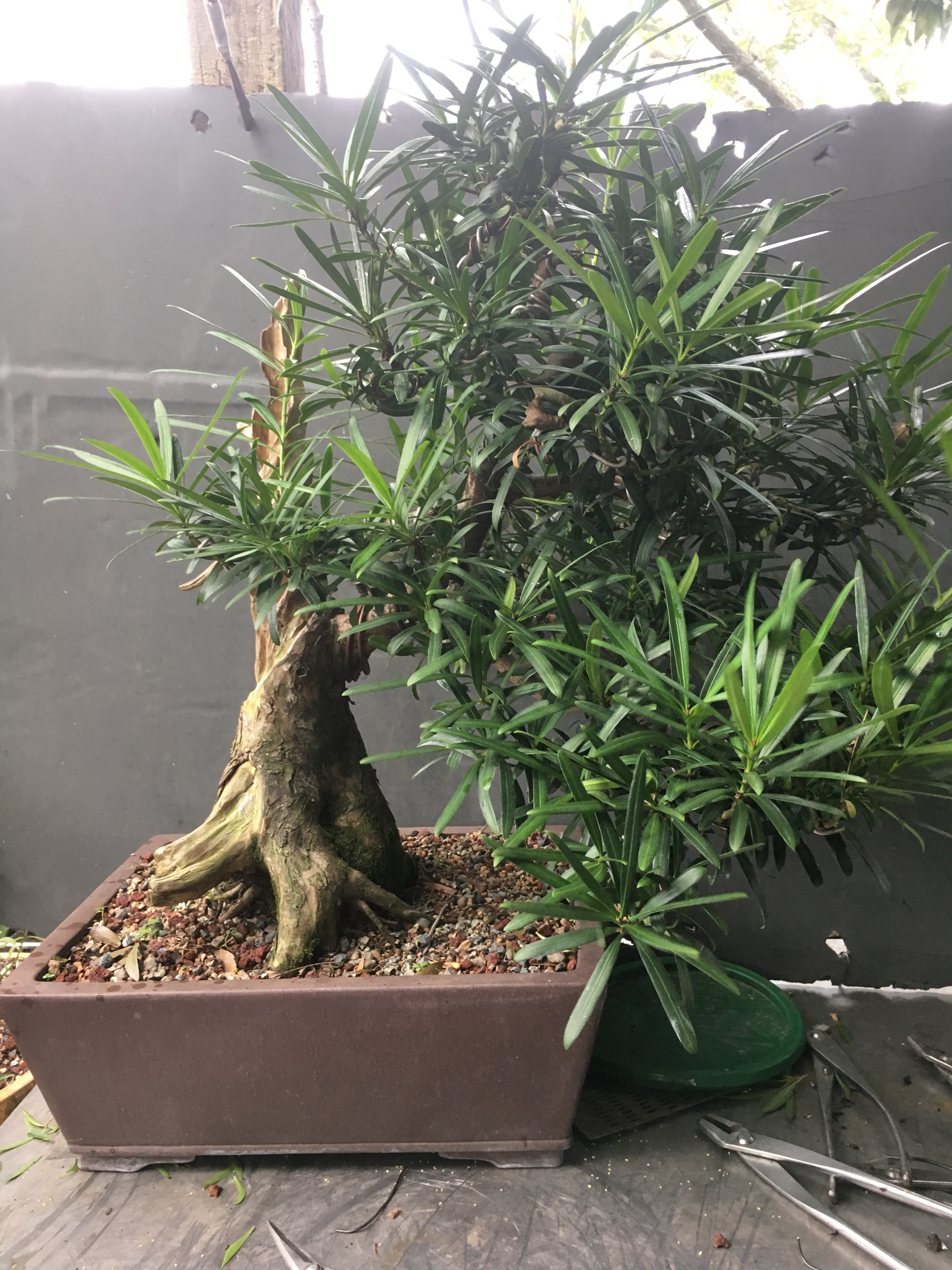 Everything you wanted to know about it (and podocarpus) is contained in the blogpost herein. It’s progressed quite a bit from when I first got it from my friend Reggie. In case you didn’t know, there are several podocarpus leaf sizes out there. This one is a big leaf variety. These two pics are from the blog post up there hyperlinked with the word “herein” you should read it. I’ll wait. I’m going to perform two defoliation techniques on this tree to get smaller leaves. The first is to cut the leaves mostly off and to nip the growing tip. Which is what I did totally to the 2nd tree. I’m pushing for ramification on it.
