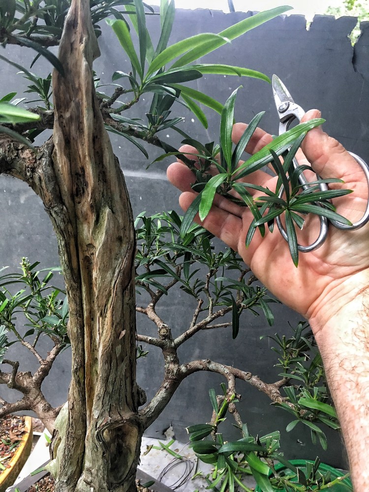 I’m massaging some podocarpus today (the massage is the message). This is my second year on them. There are three, to be precise. But I only have two with before pics.