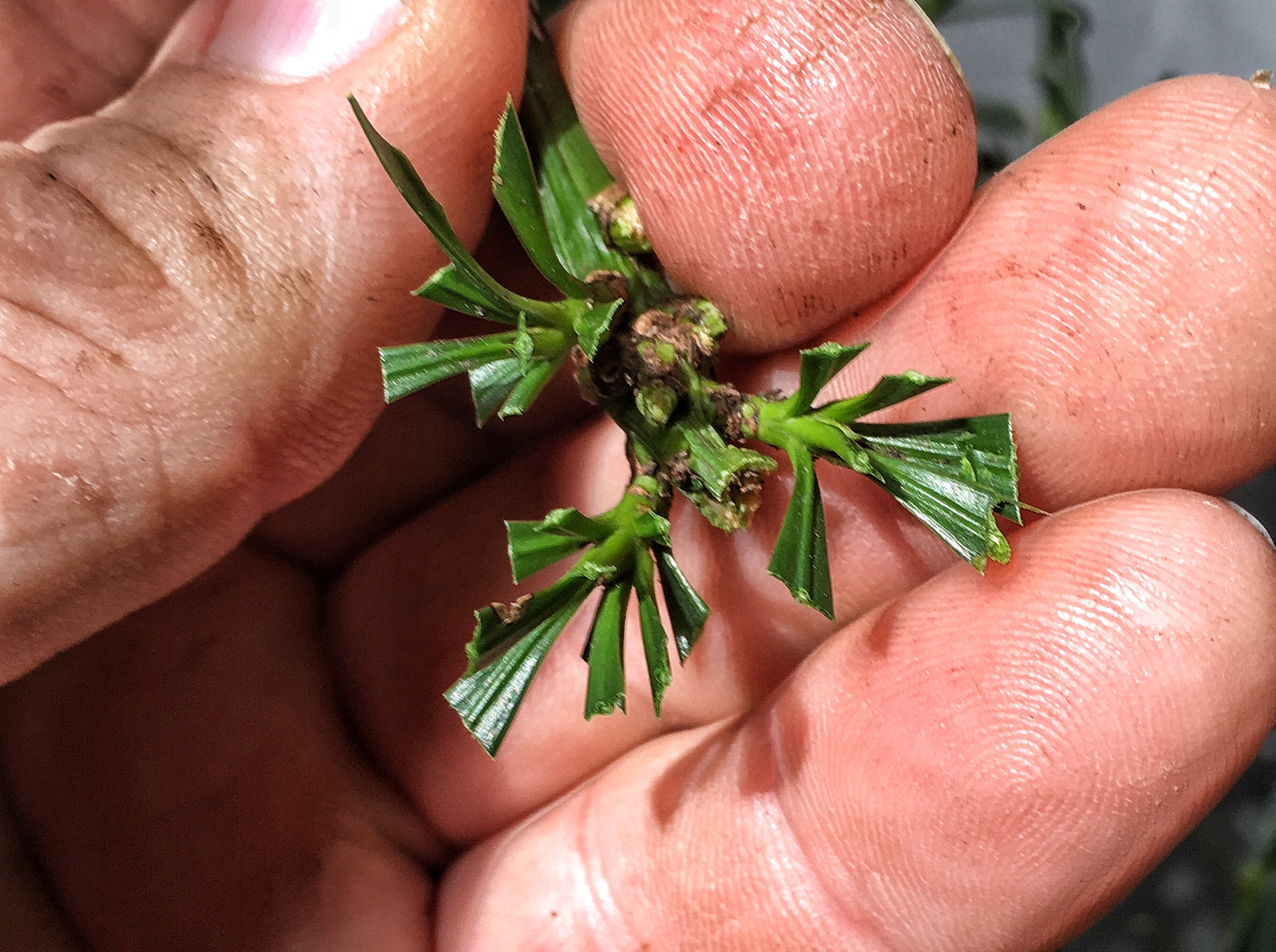 This one is all authoritative looking and stuff with my hand posed holding the scissor.  That pic was before I cut off all the leaves. That’s the one branch that’s younger than all the rest. It’s an important branch needed to fill in that area on the and mature fast. The way I accomplish it is to defoliate everything but the terminal buds. It works; here’s how: By not pruning the terminal bud, it keeps the auxin intact, pushing length, I am not touching the roots, so the supply of cytokinin is stable, which keeps the ratio to auxin in an ideal stasis and encourages cell division and, therefore, girth.  The damage (pruning) releases ethylene gas, which, with the presence of auxin, suppresses side growth. The lack of gibberellins (which are in the leaves, now defoliated) keeps the internodes shorter. Ethylene decreases gibberellins too. I learned the technique from Jim Smith, and it’s been confirmed by generations of tree farmers trying to get taller, thicker trees as fast as they can.