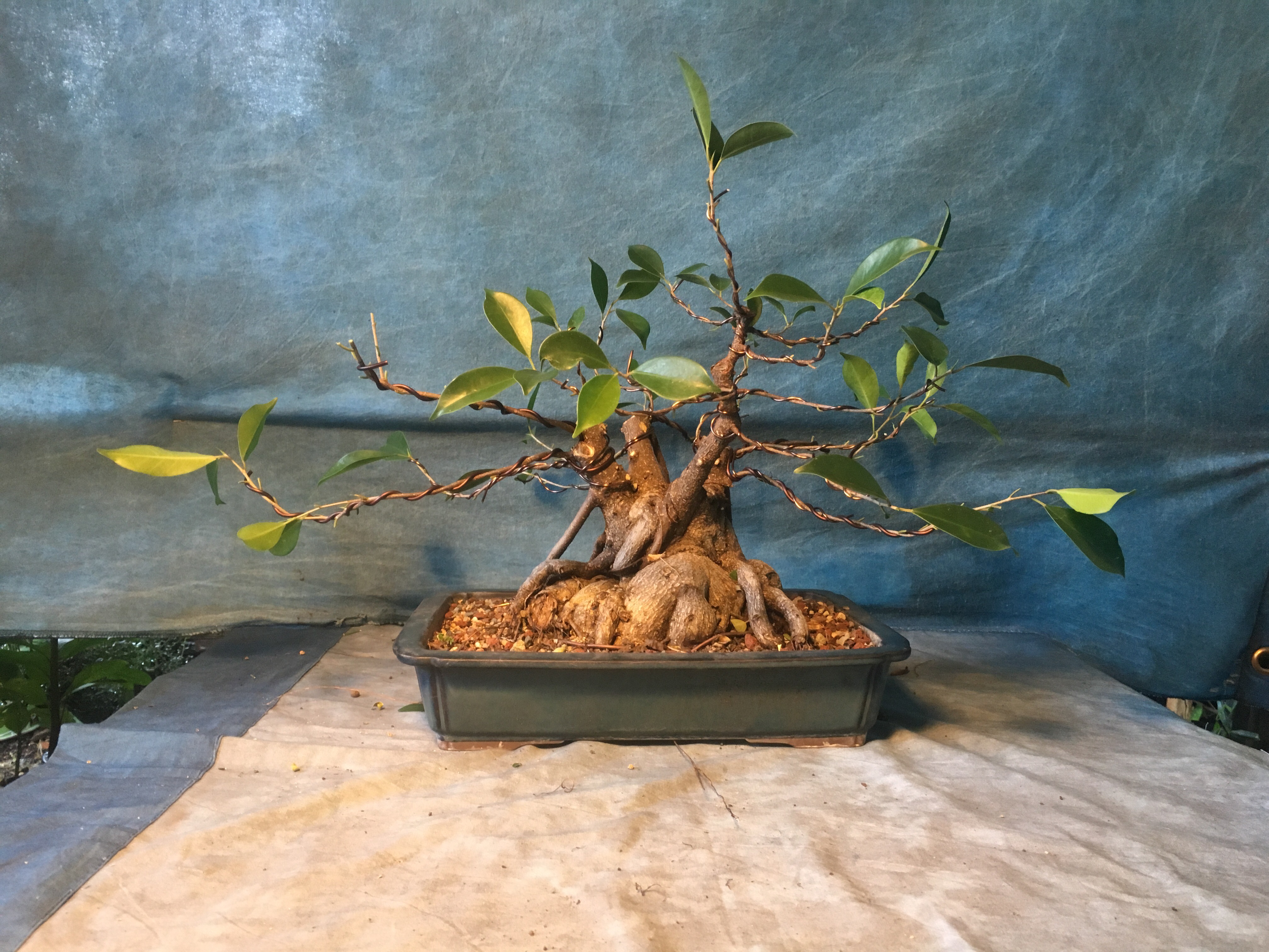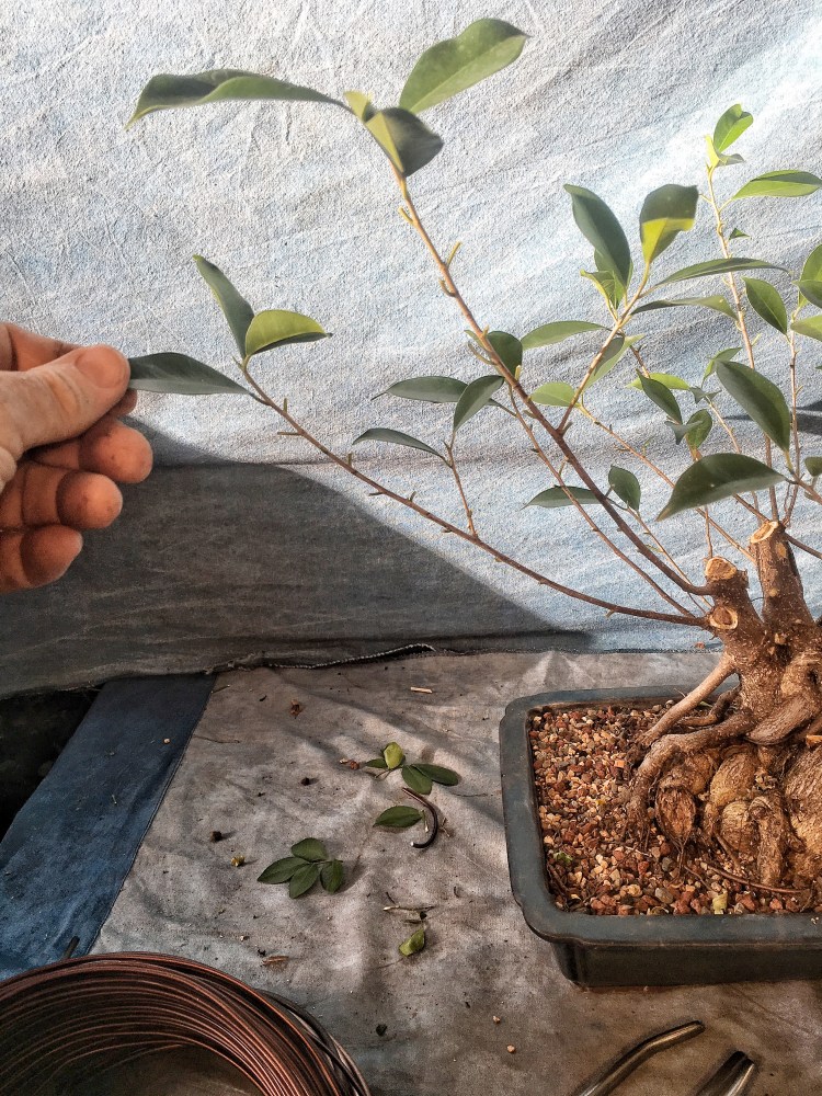 It’s a little hard to see what I did on those podocarpus so here’s a ficus to make it easier to see. It’s a tree that belongs to my niece. Earlier in the spring we trunk chopped it and repotted it. As you see it now, it  is after branch selection and partial defoliation. I left all the growing tips but I need to slow the growth on some branches. Some wire and branch shortening. If you notice, I bent the tips up. This helps the auxin know which way is up.
