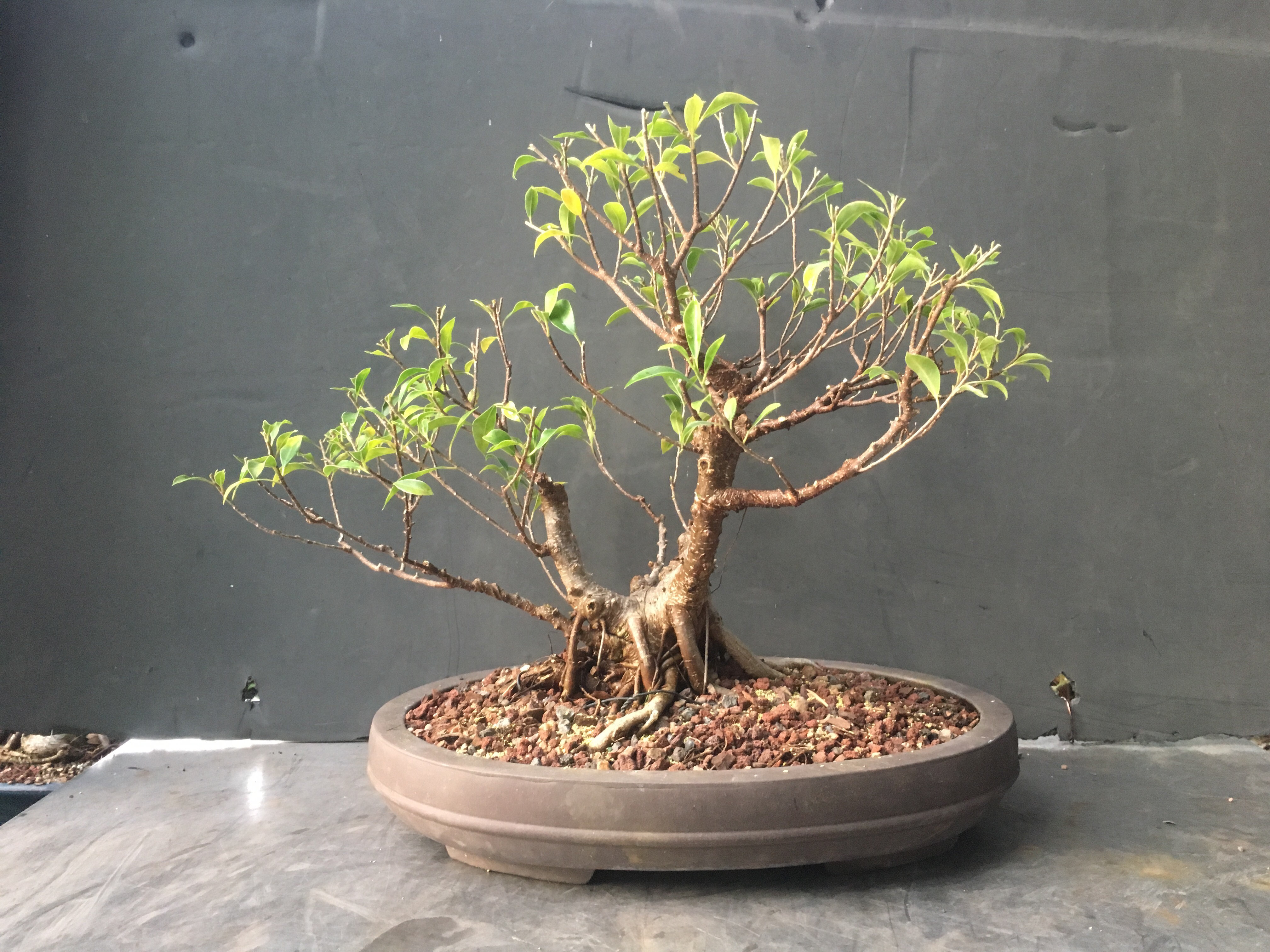Speaking of dwarf plants, this is a ficus macrocarpa “melon seed”. Not much to look at yet, needs a wiring job and another year or so. It has short internodes, dense backbudding, and doesn’t like to thicken branches or the trunk. It was grown by Erik Wigert and when I got it it was in a 3 gallon pot and was about 8 feet tall. I chopped it and put it in this pot about a year ago or so. Maybe two. It backbuds like a ficus salicaria and it’s been a struggle to keep the fungus off it and keep it green. It’s almost always yellow. I’m curious to learn if the plant is a mutant or if it was selectively bred over successive generations for its dwarf properties.