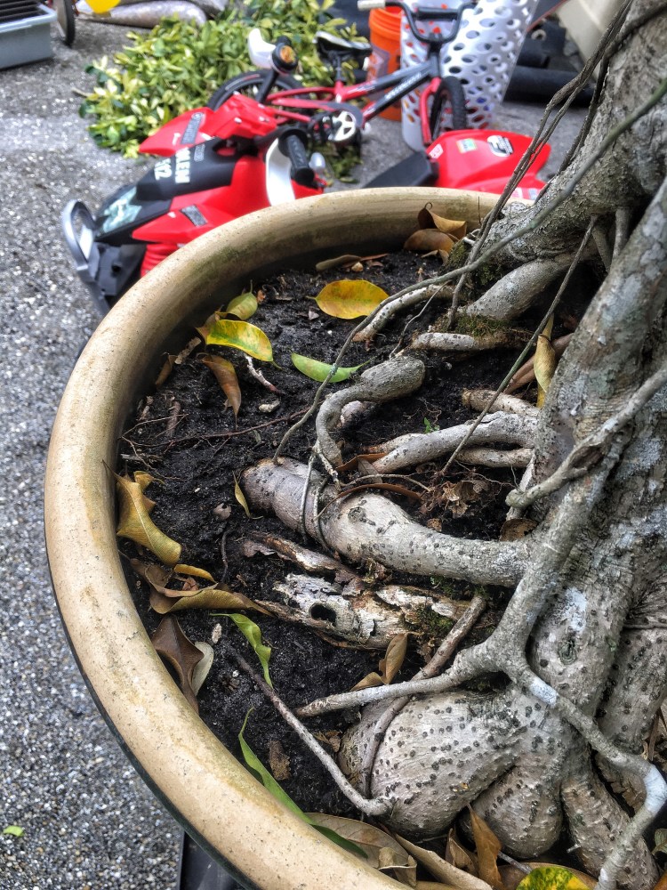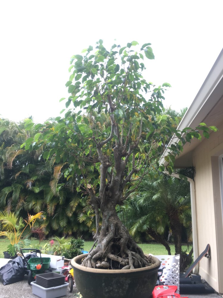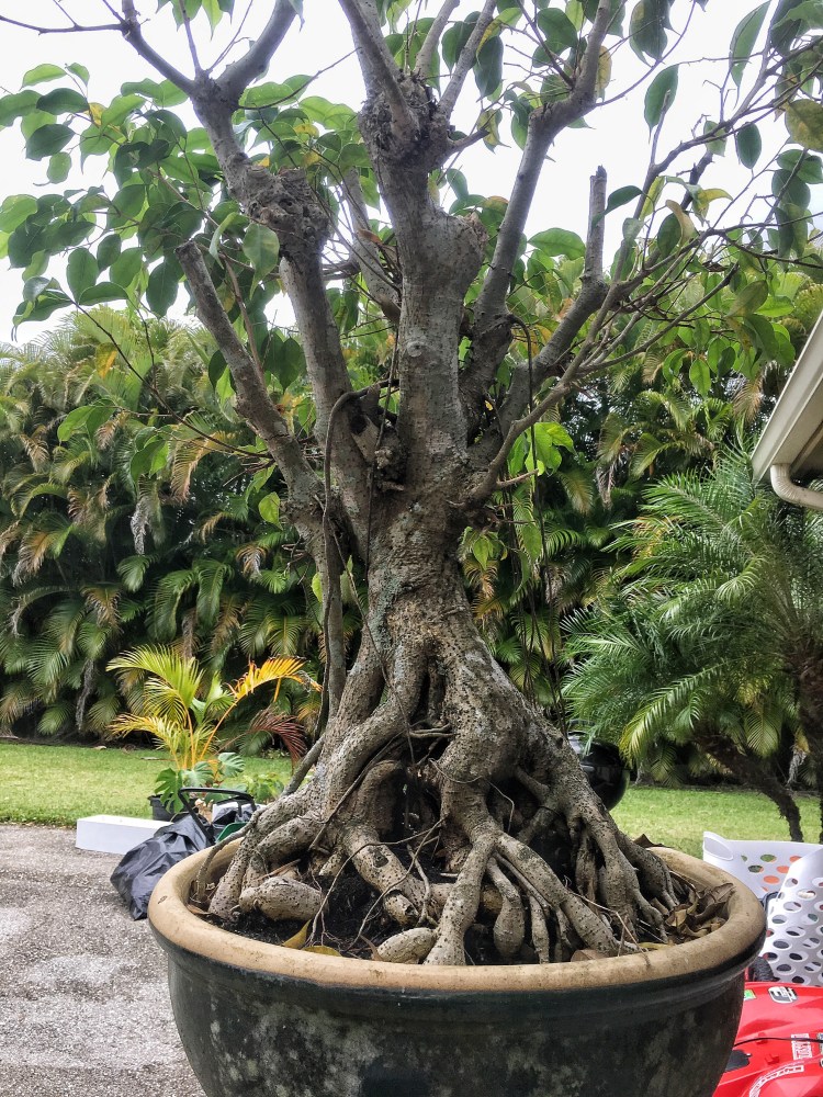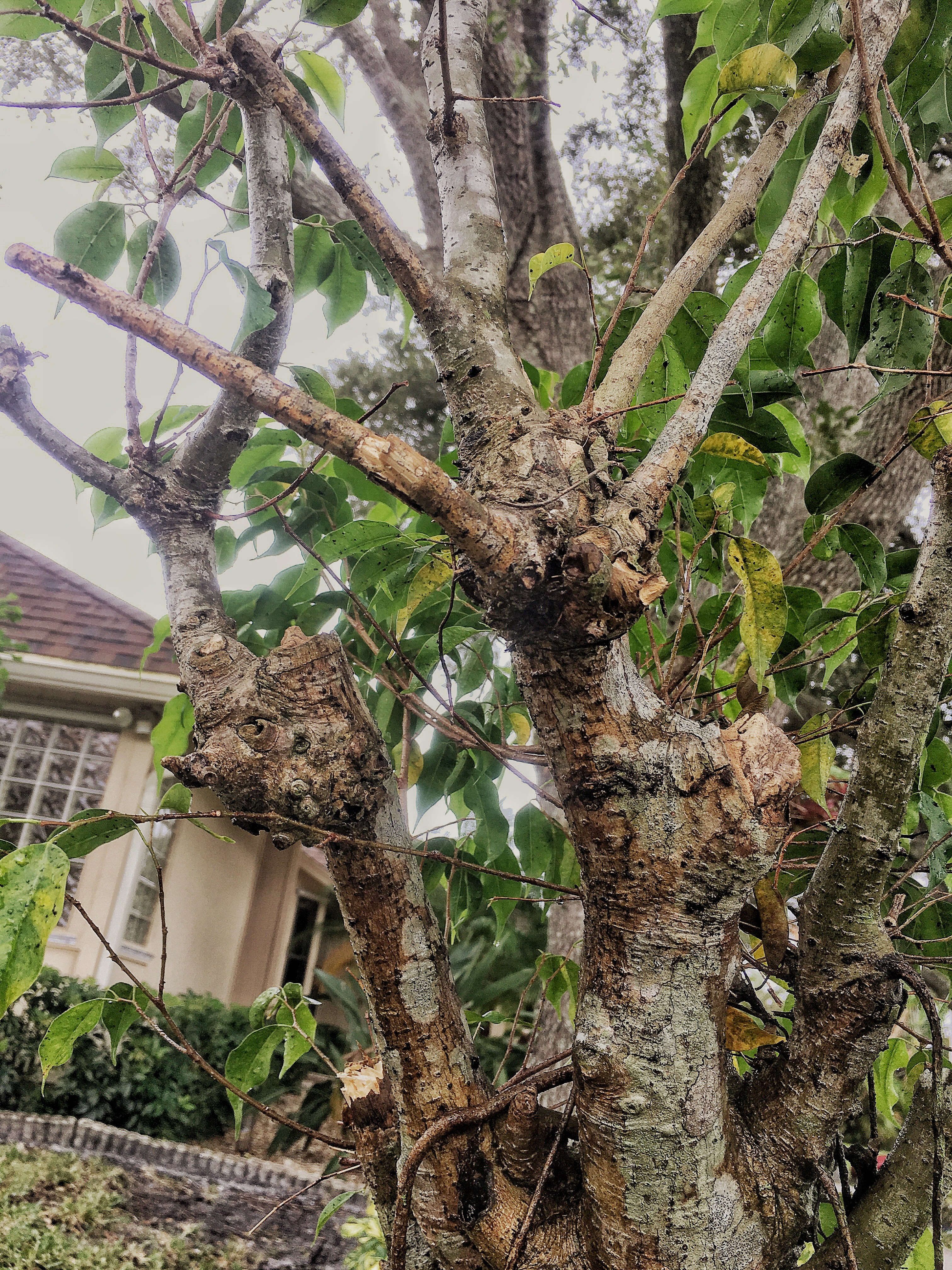 Pretty impressive, right? At least the base. One of the anthems of my day, when I was young and idealistic, frames this trees proportions with élan and grace…..”Baby’s got back!” That’s why we are even looking at it, to be honest. It’s one of those ficus benjamina office trees that got put outside several years ago and forgotten.