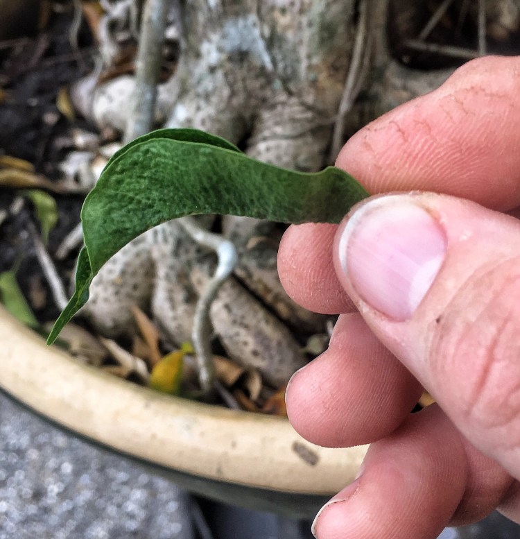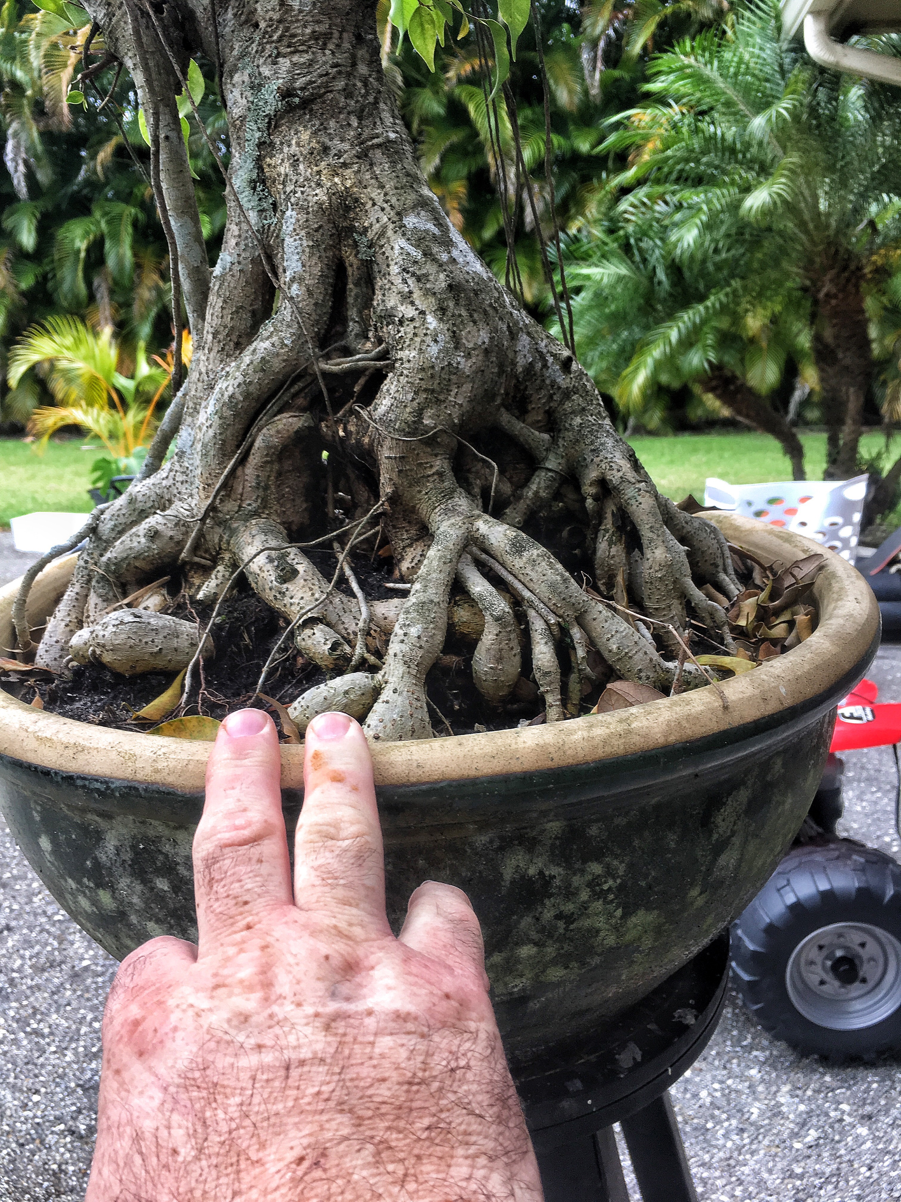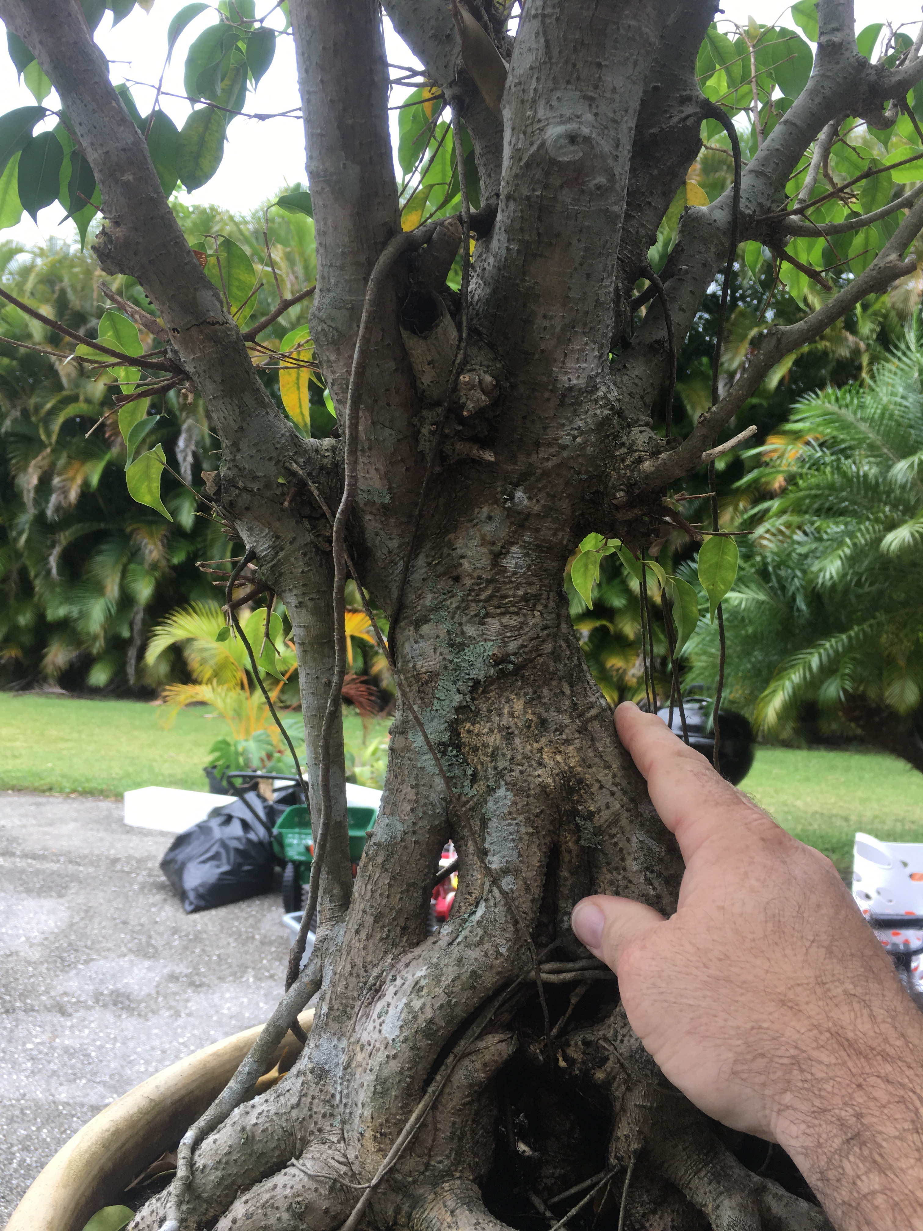 Pretty impressive, right? At least the base. One of the anthems of my day, when I was young and idealistic, frames this trees proportions with élan and grace…..”Baby’s got back!” That’s why we are even looking at it, to be honest. It’s one of those ficus benjamina office trees that got put outside several years ago and forgotten.
