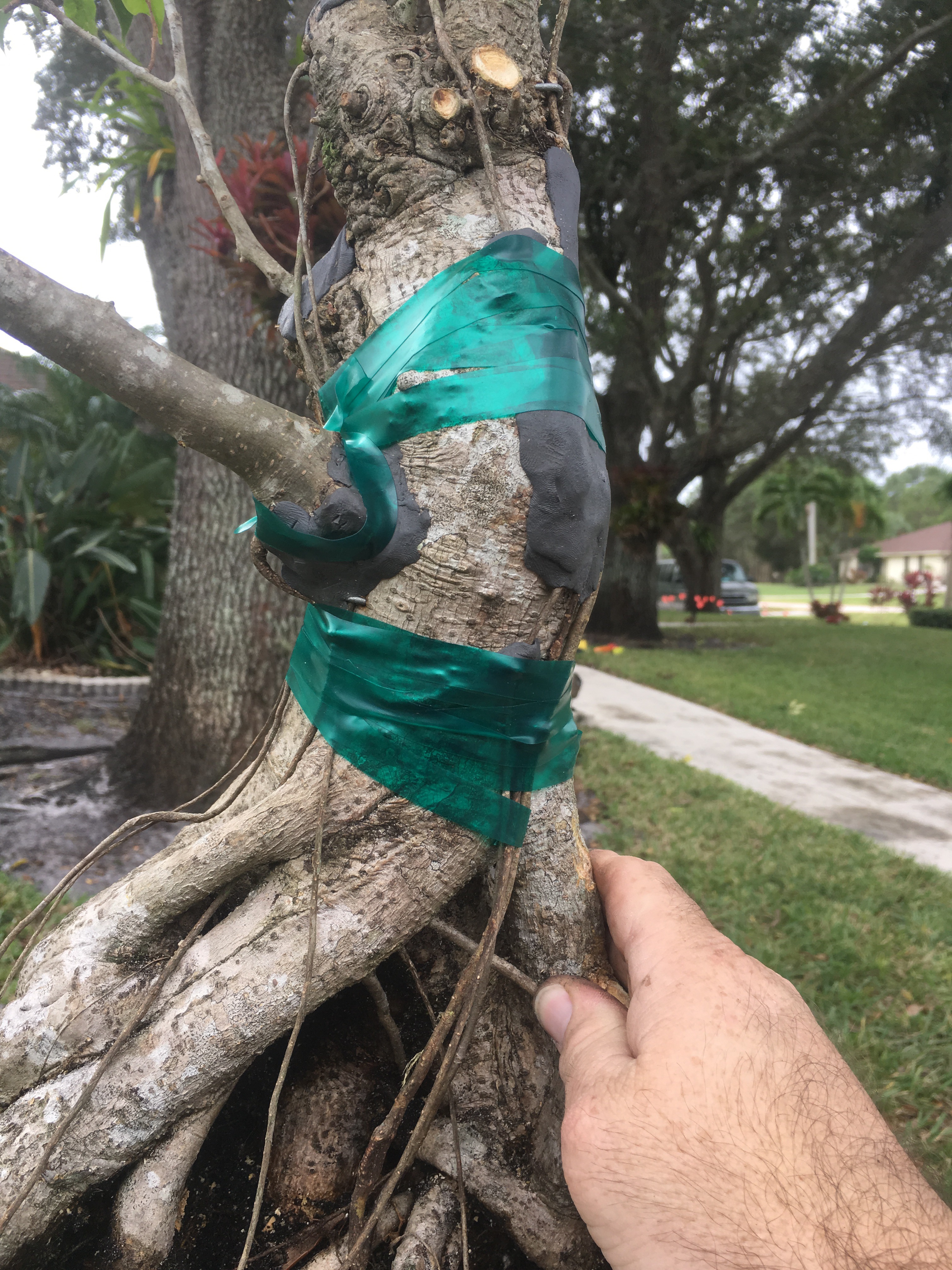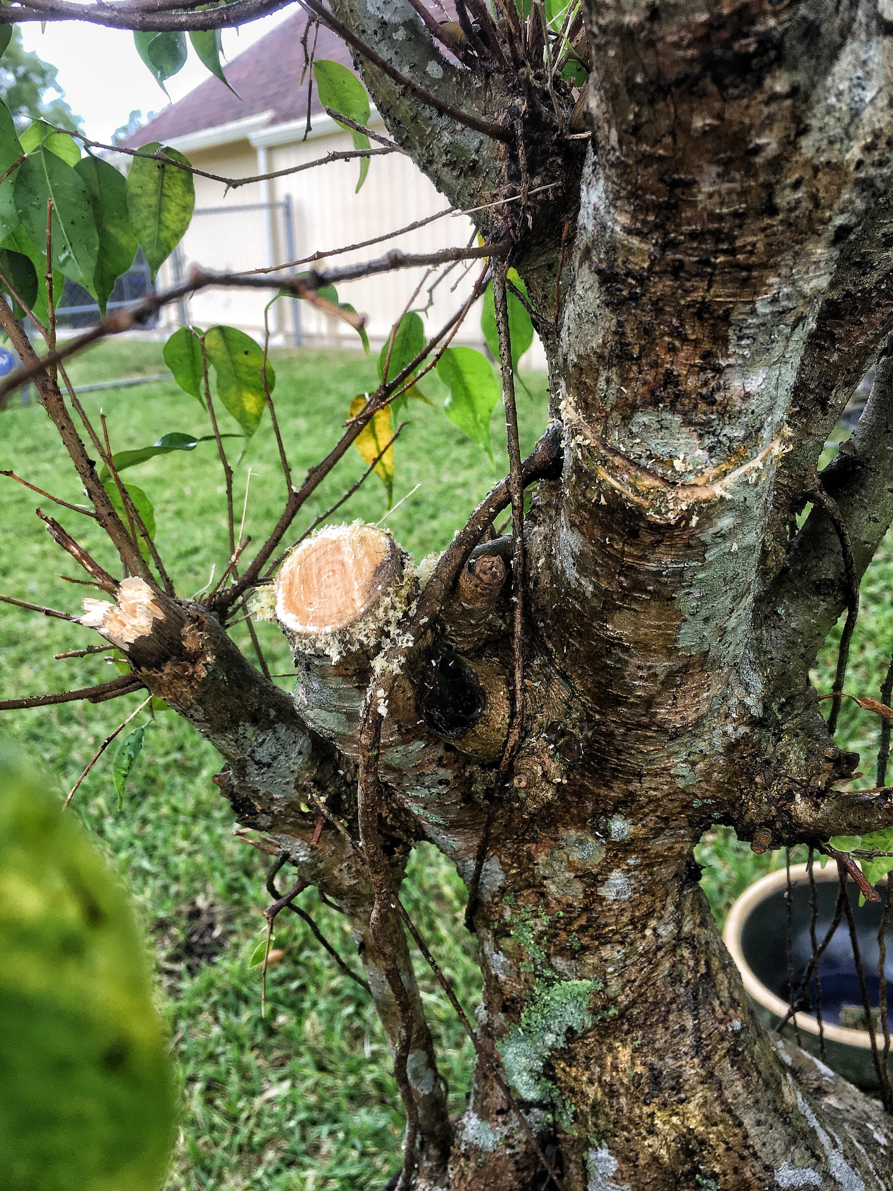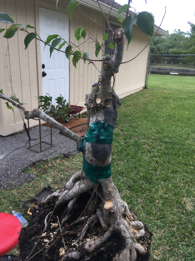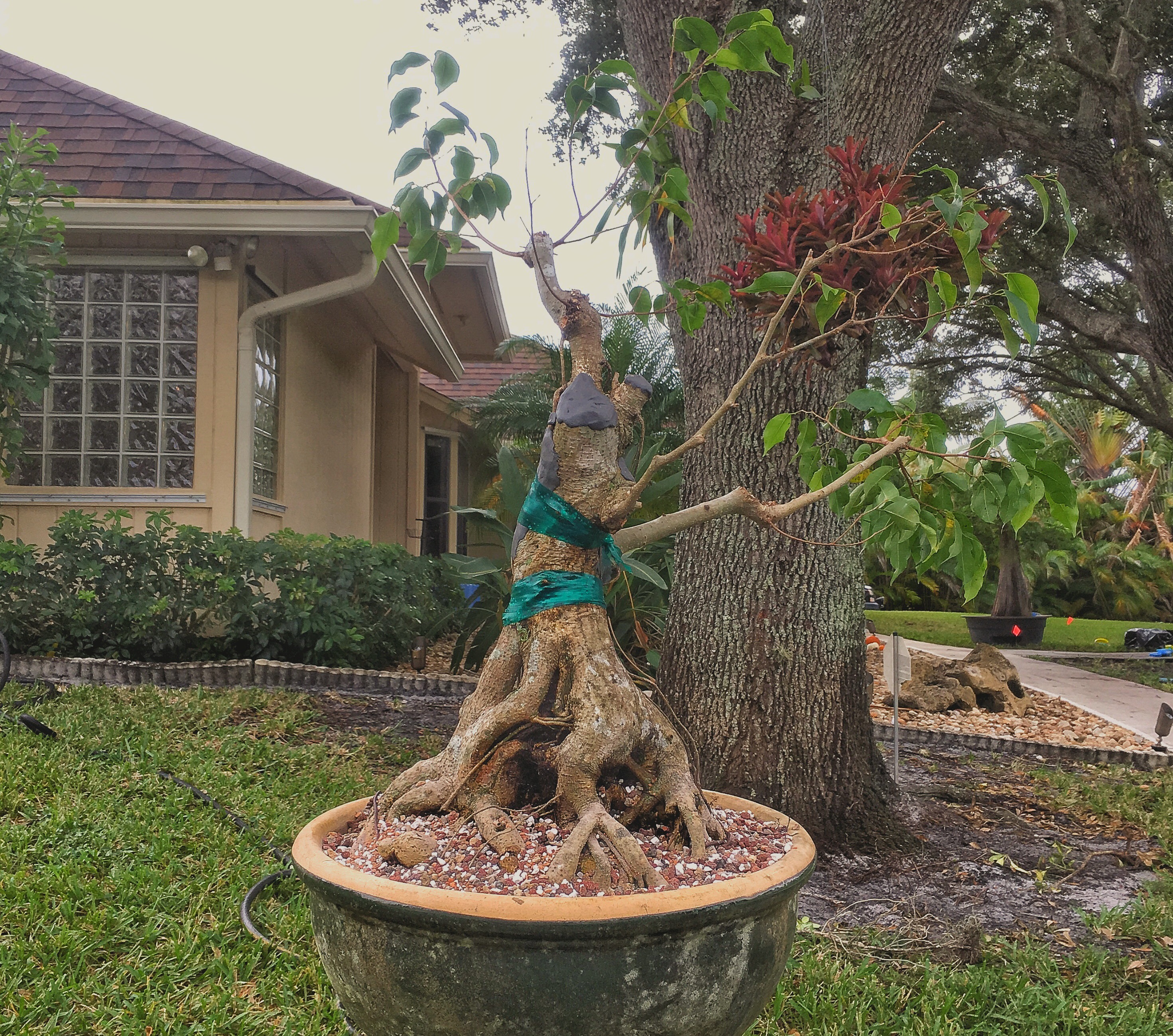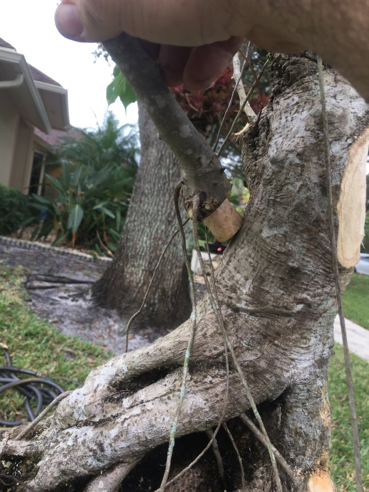 You’ll notice the aerial roots hanging down from the base? That’s my lifeline for keeping this branch alive while it grafts into the side of the trunk.