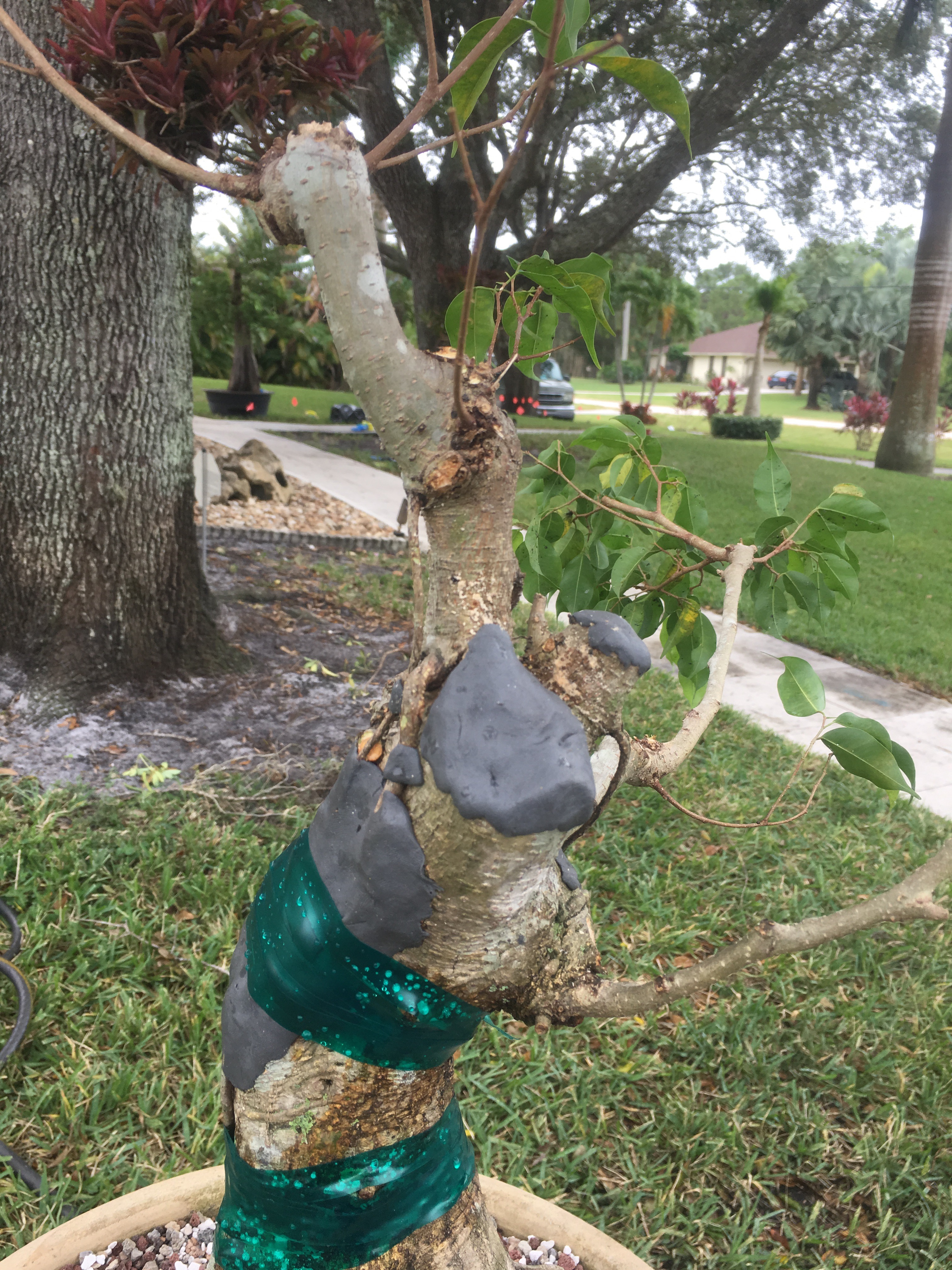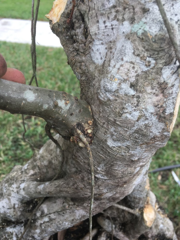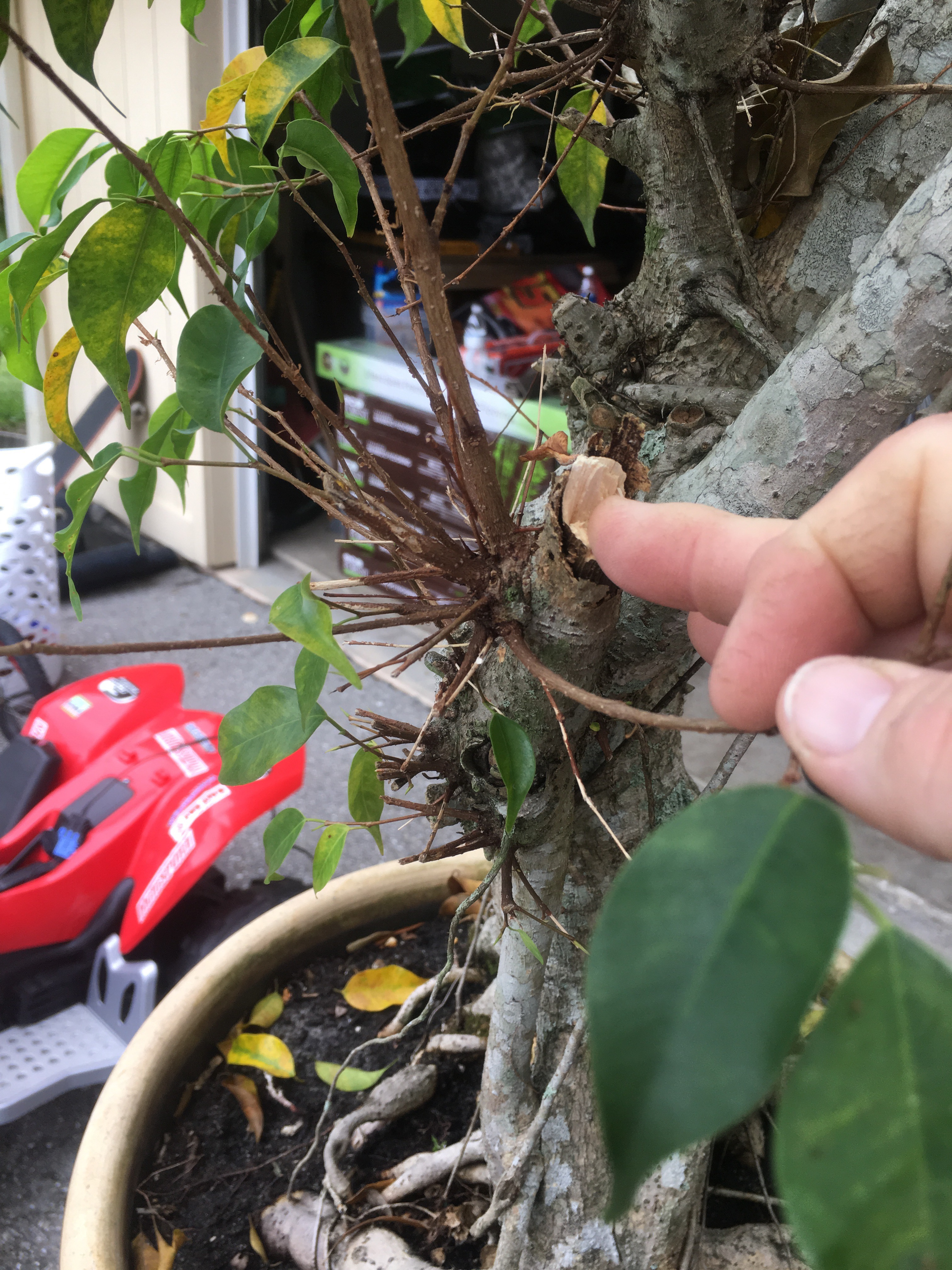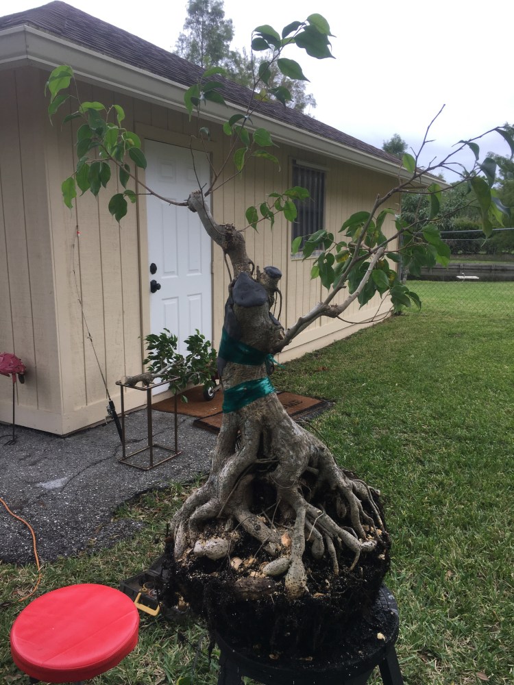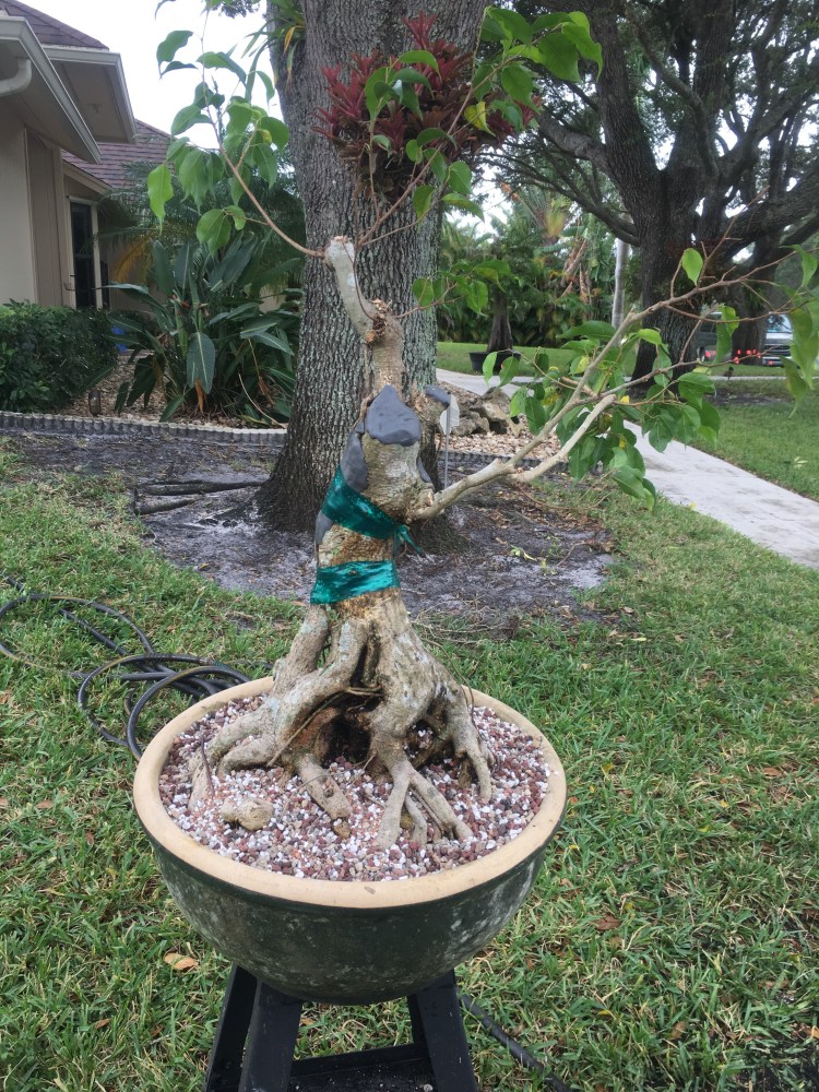 You’ll notice the aerial roots hanging down from the base? That’s my lifeline for keeping this branch alive while it grafts into the side of the trunk.