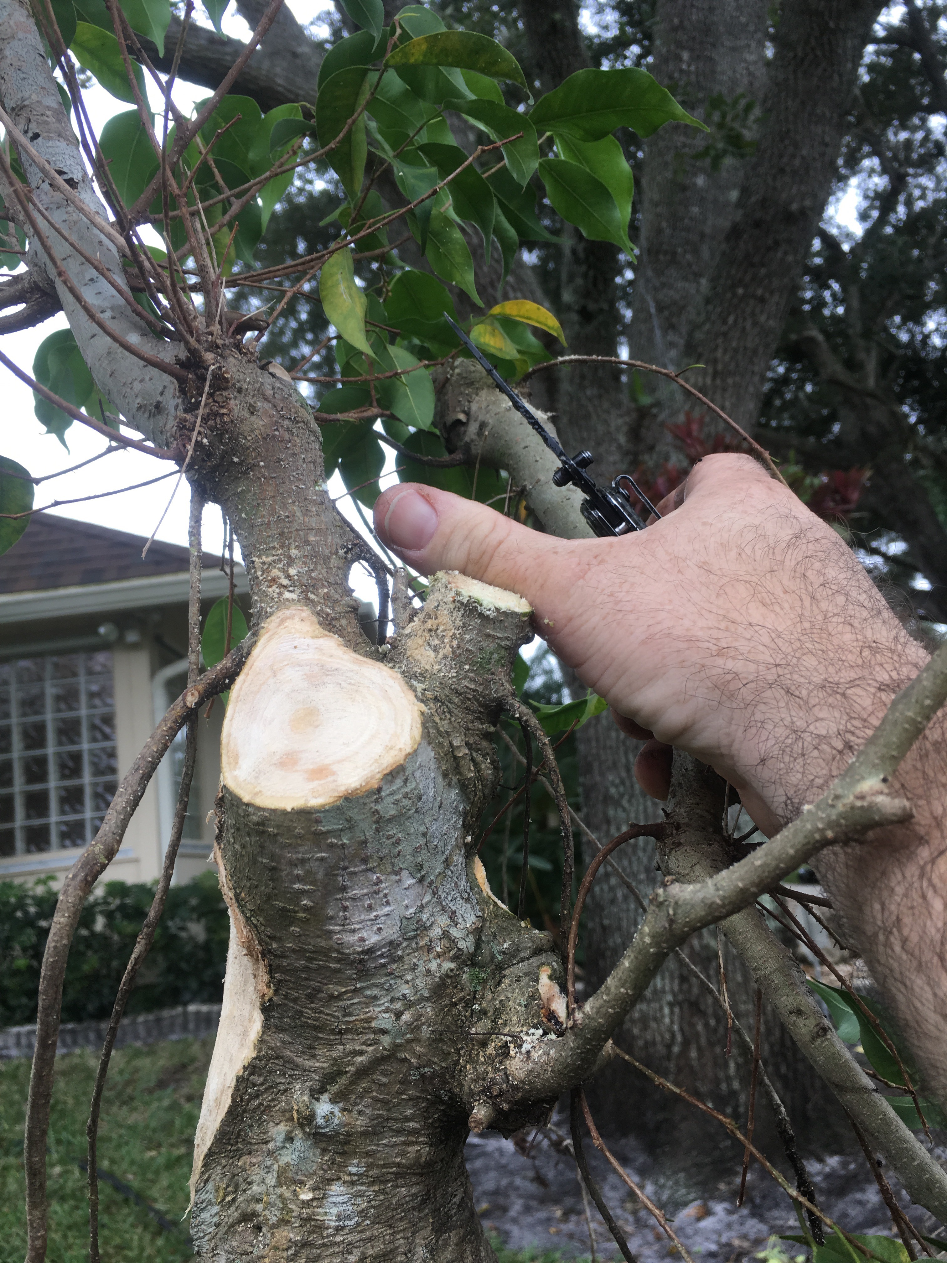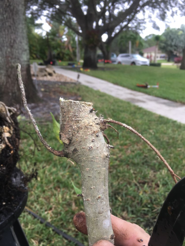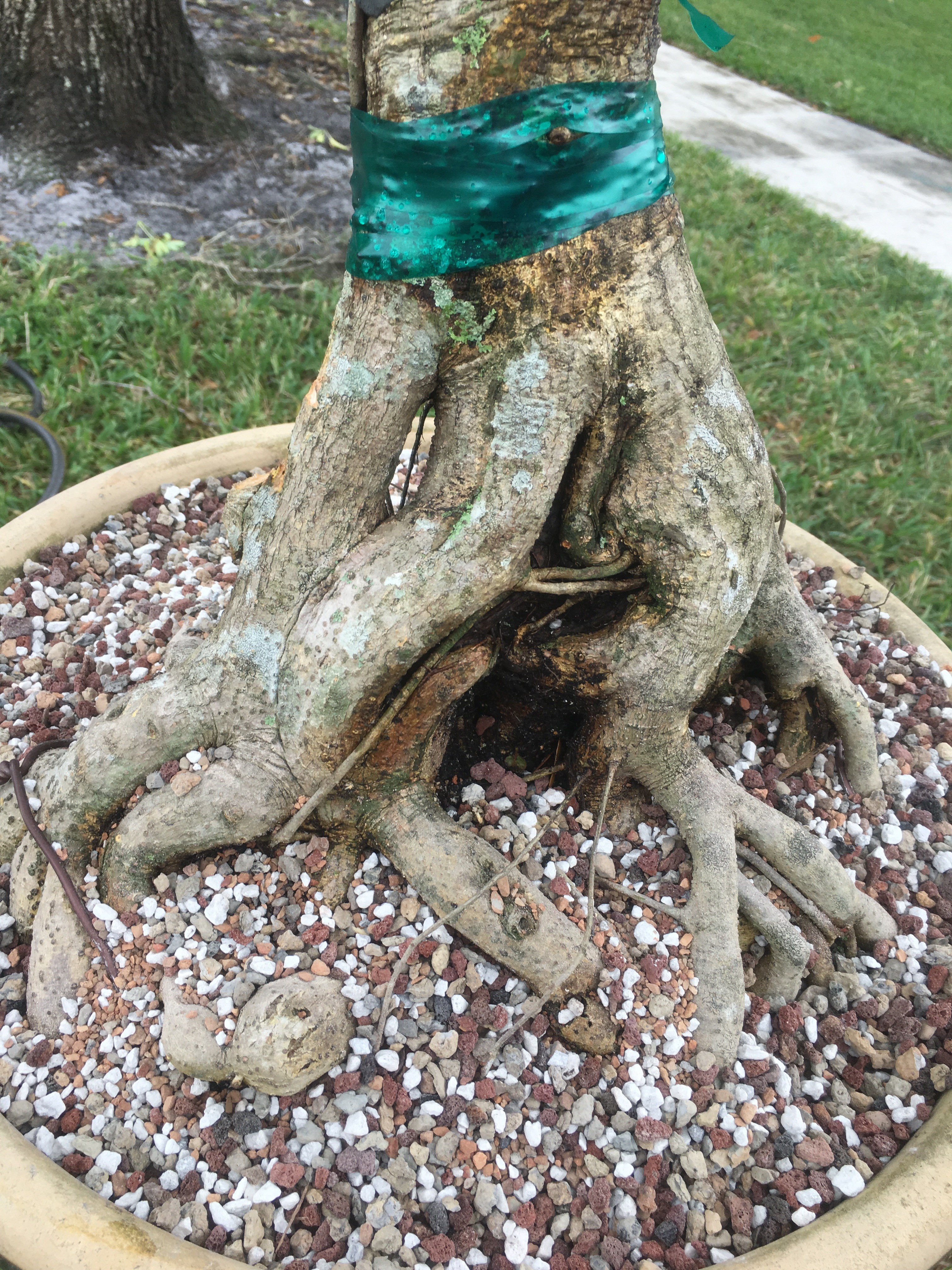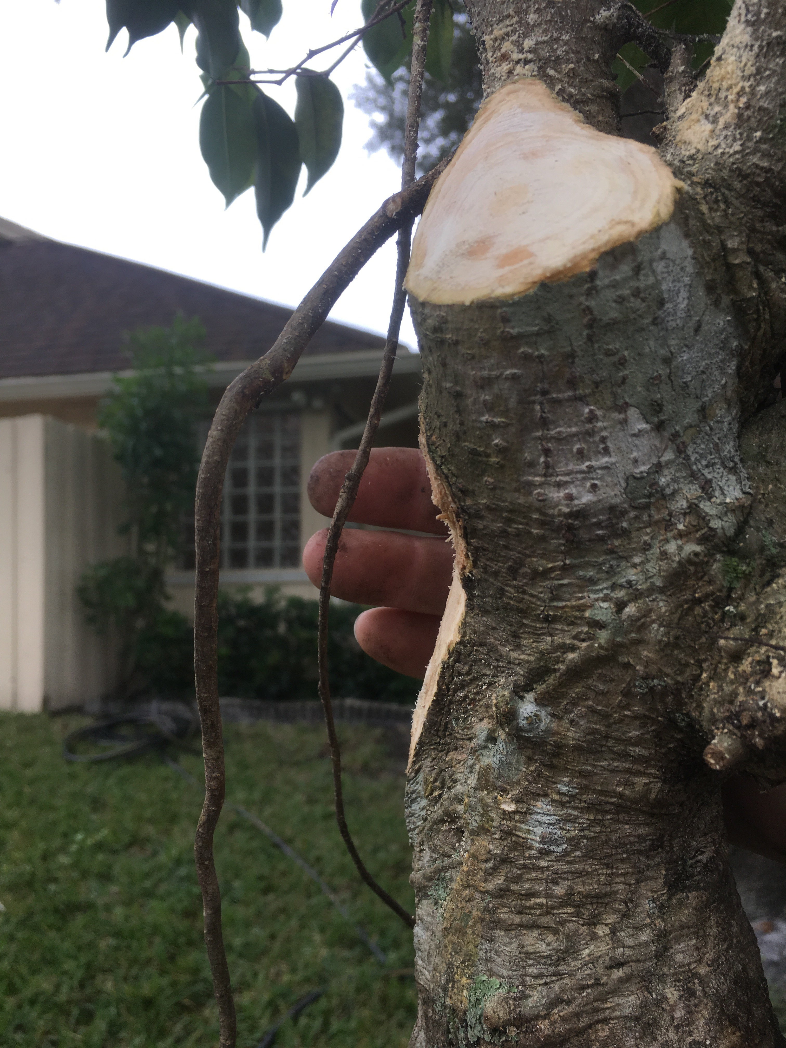 You’ll notice the aerial roots hanging down from the base? That’s my lifeline for keeping this branch alive while it grafts into the side of the trunk.