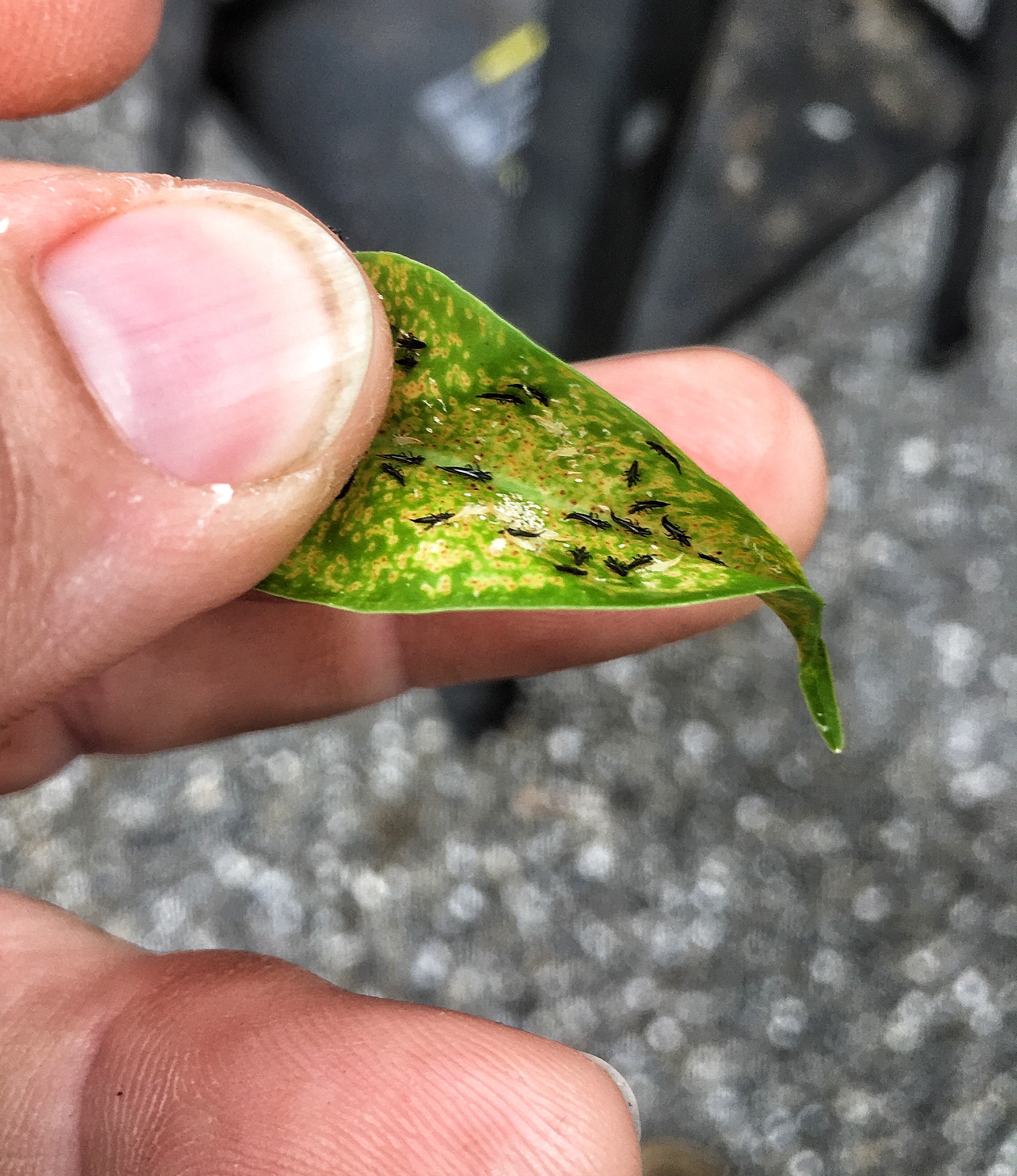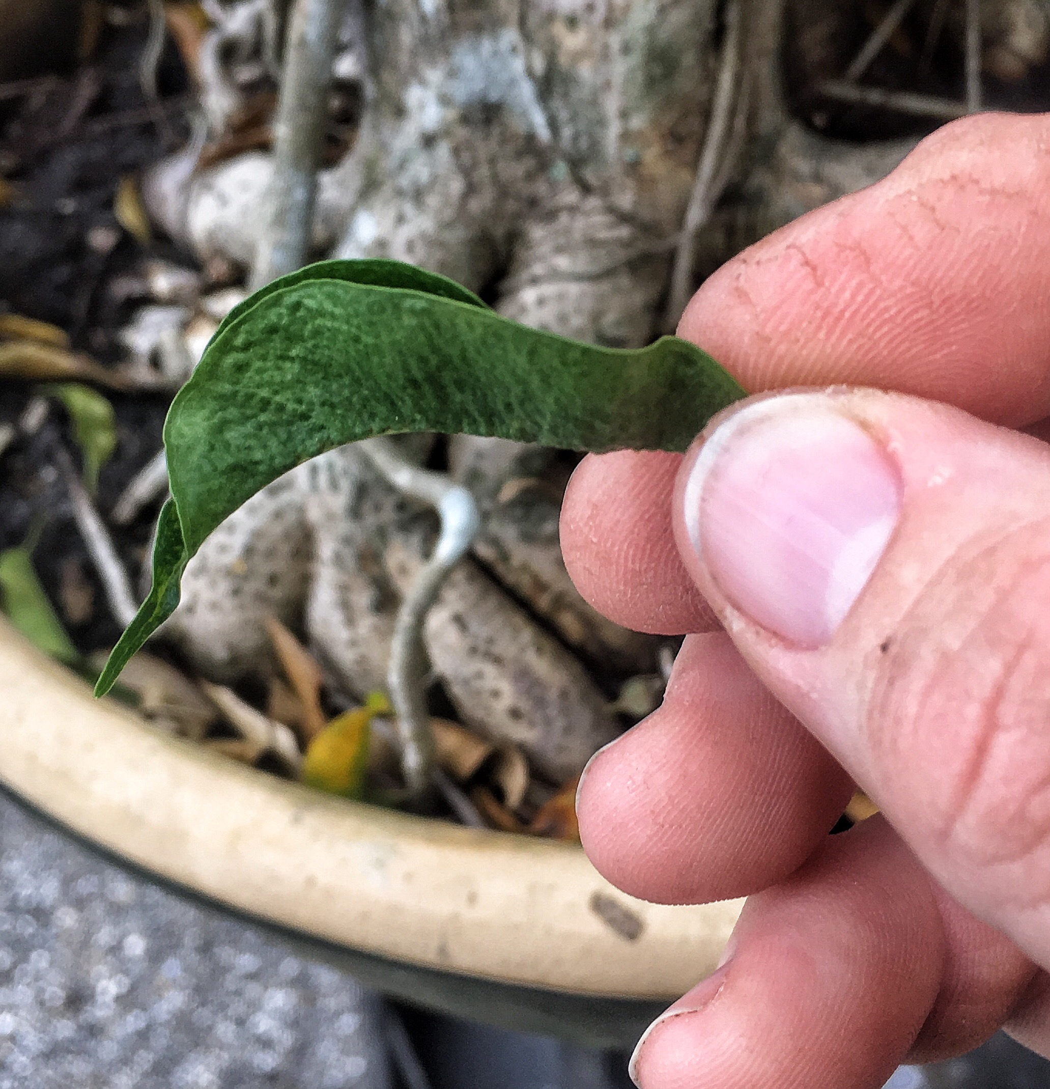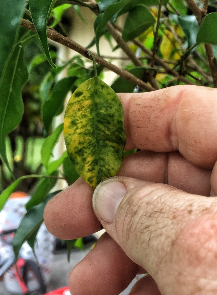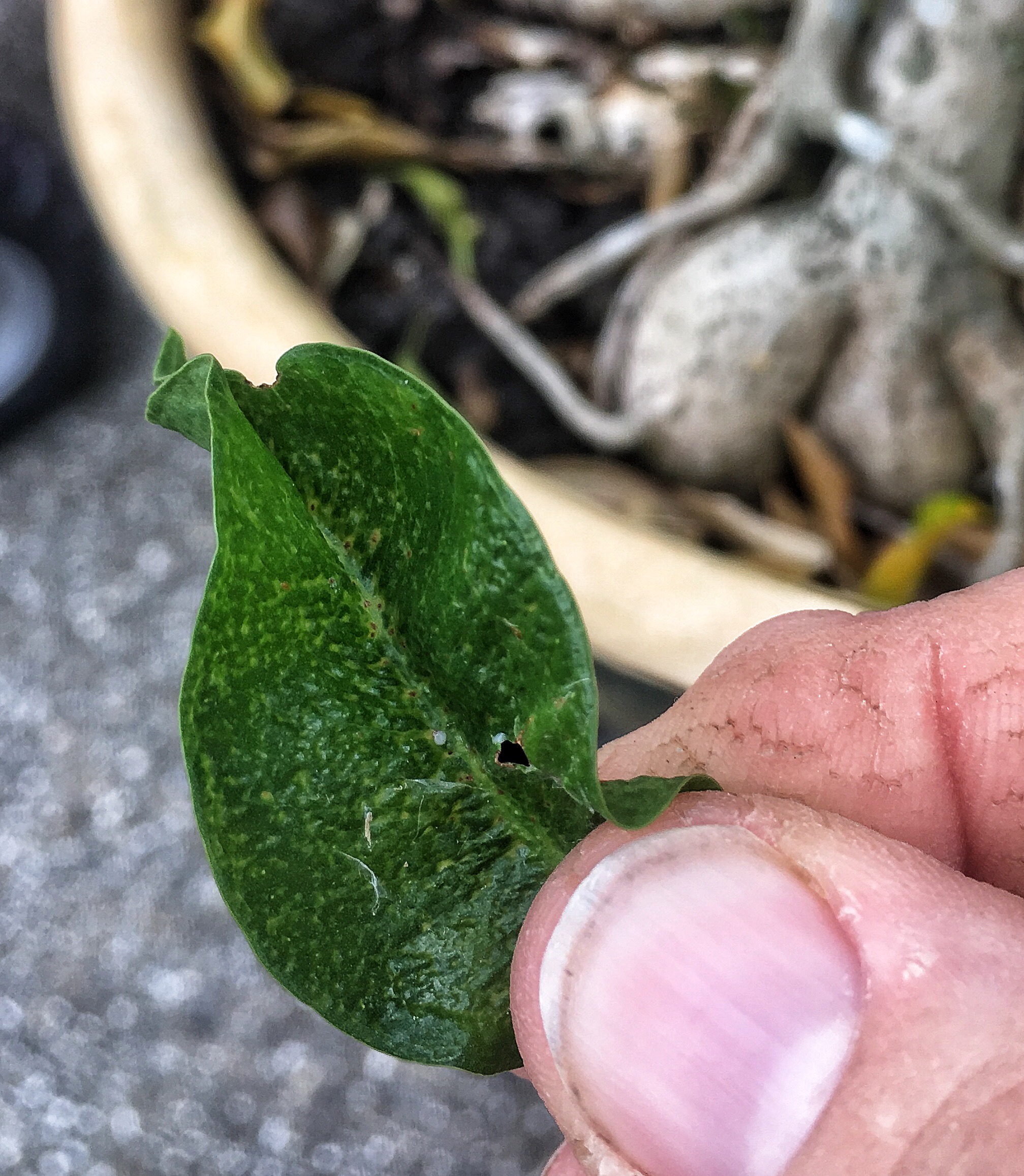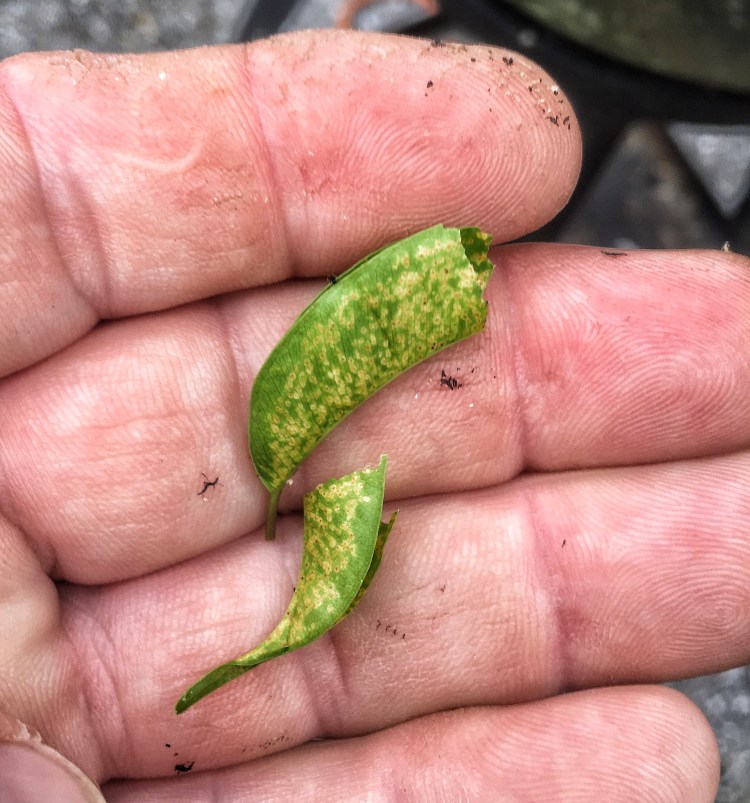 I need to address the bugs first. Thrips, to be precise. This is just an old leaf. No bug damage here.
