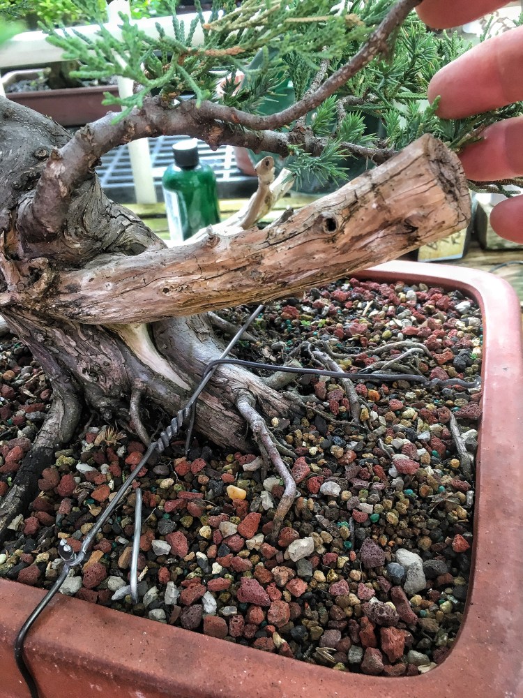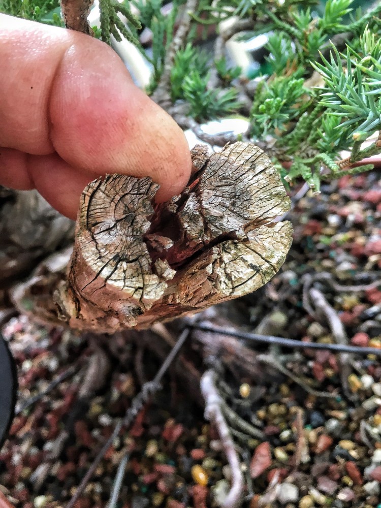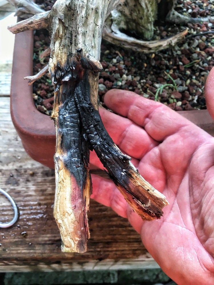 Basically, a juniper had copious amounts of resin, or oils, in the red part of the wood (juniper has sap wood and heart wood. The sapwood is white, heartwood is red. It’s the red that resists decay in the wild and gives us those crazy deadwood yamadori masterpieces). By heating the resin, it’s the same principle as heating the water in a newly made Jin.