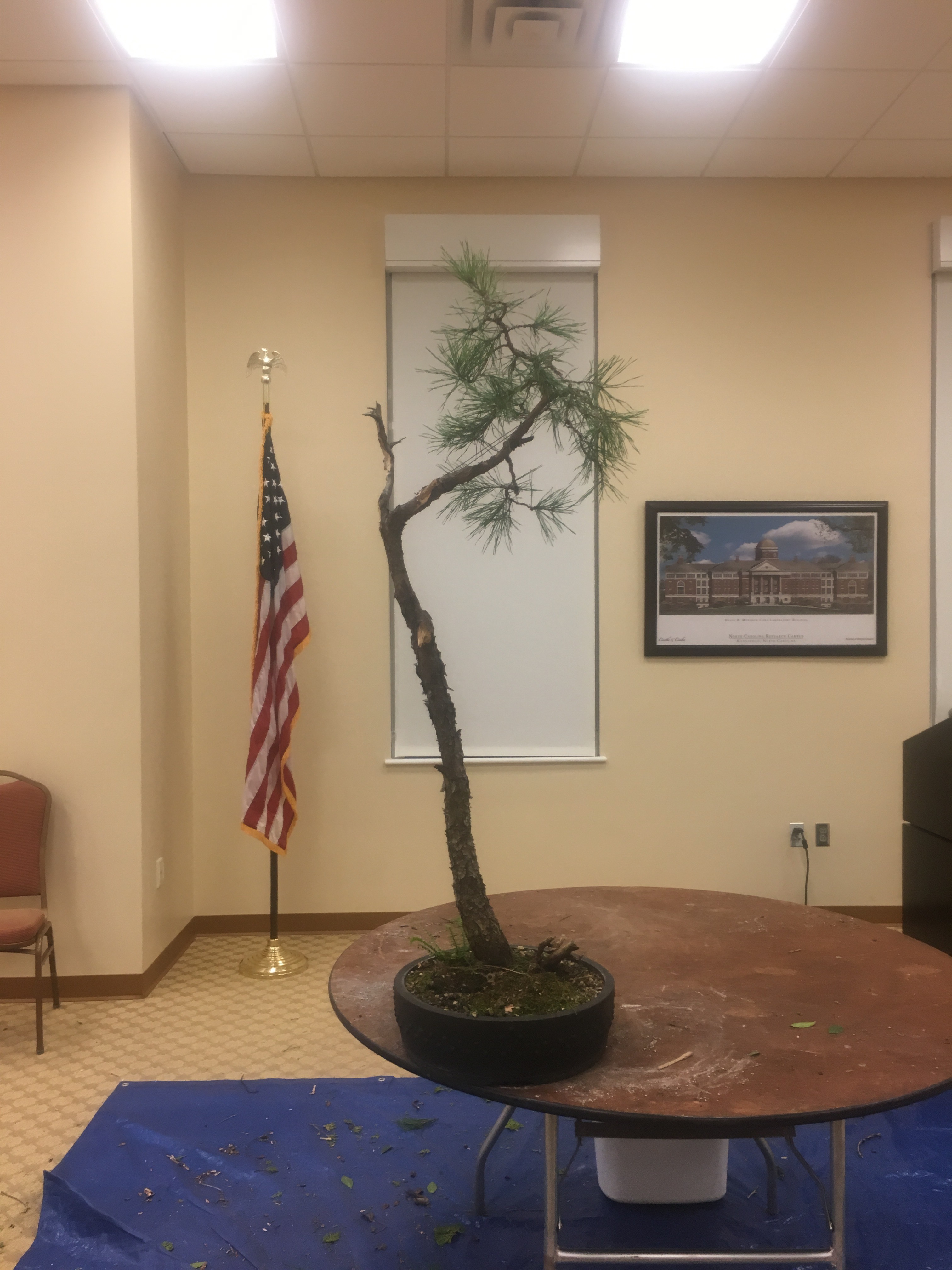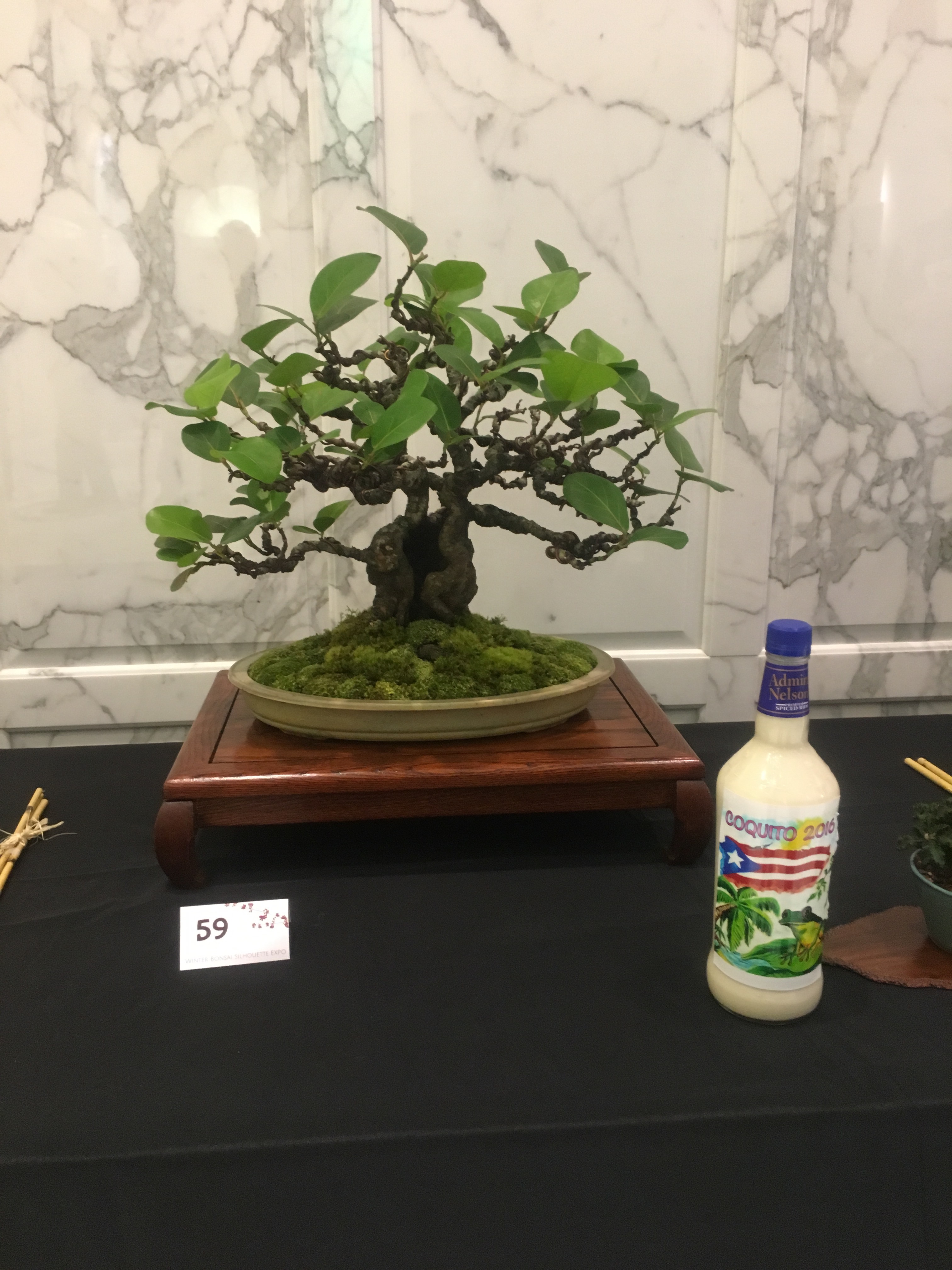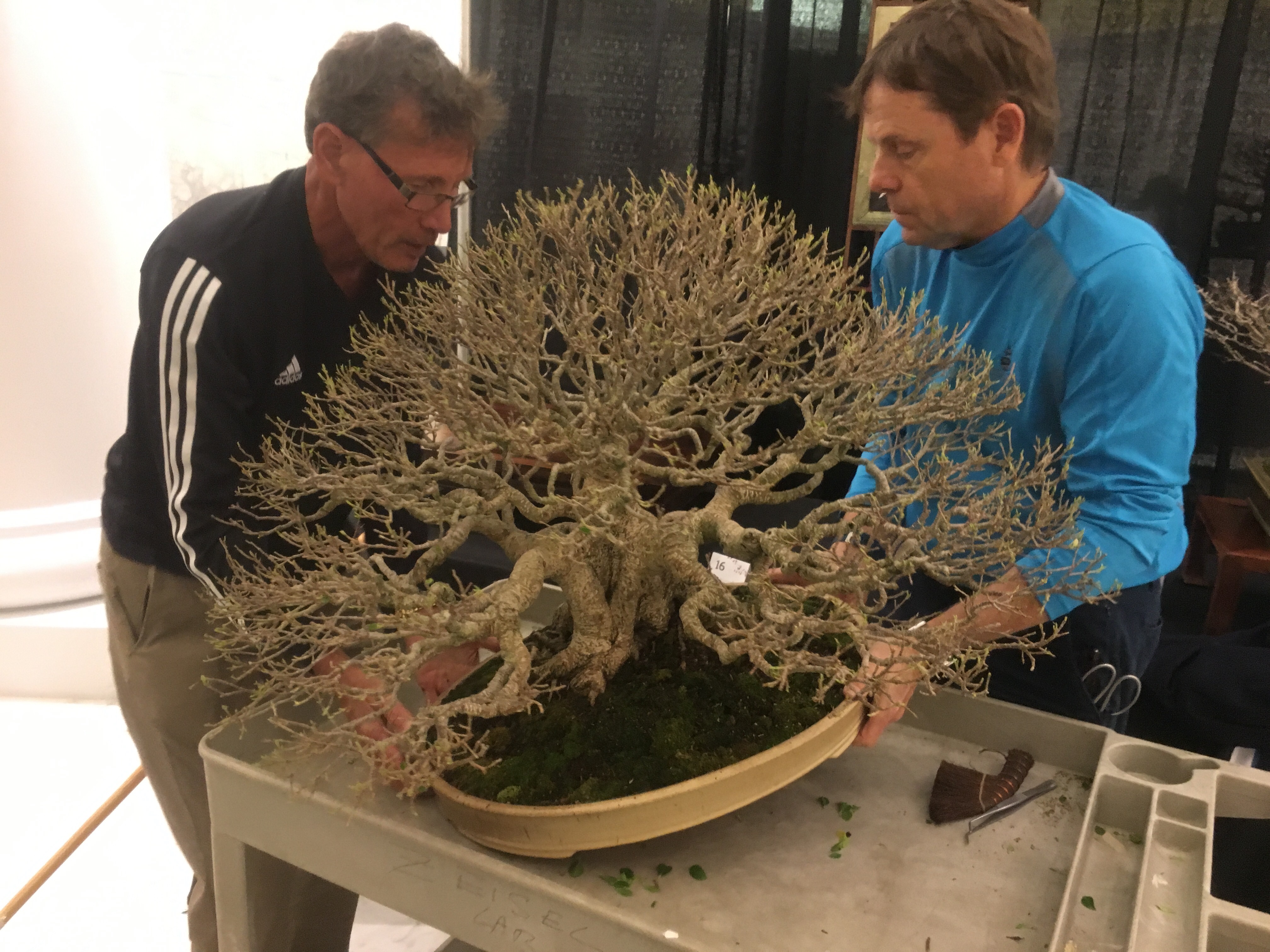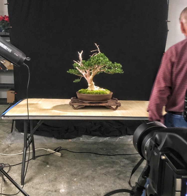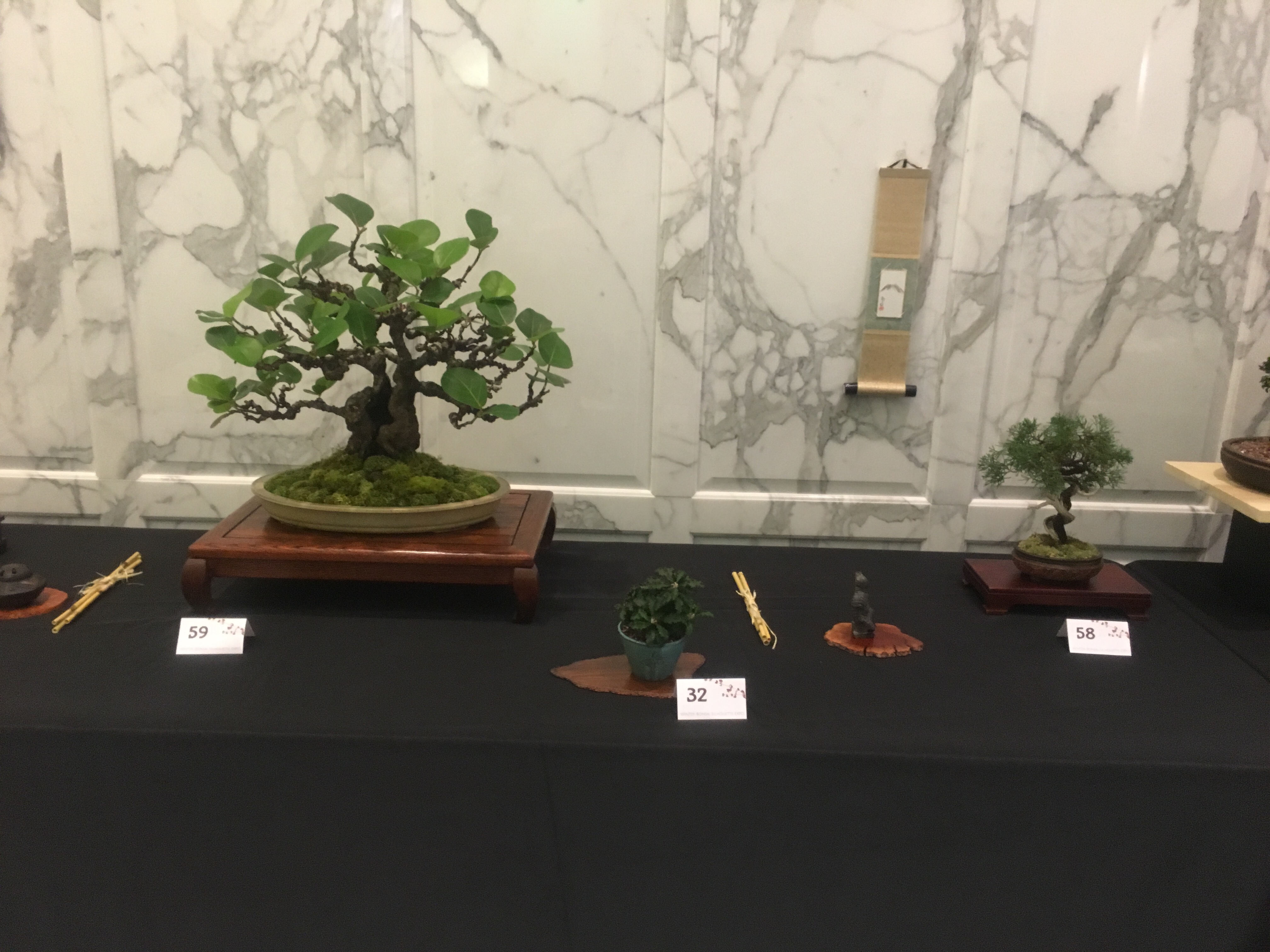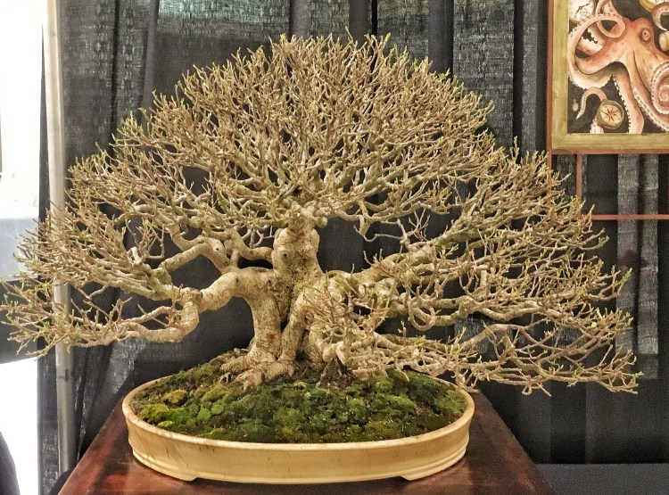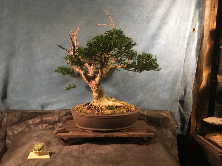 If’n you’re wanting a true professional photo of your (your club, Society, or regional group’s) exhibit trees, I suggest You hire Joe. He took, I kid not, at least thirty photos of my buxus here. It’s a difficult tree to photograph I guess (the light bark seems to reflect the lights and it causes really bright hot spots) but he finally got the photo, with the help of holding up two blinds blocking the lights and handheld spots and all kinds of tricks that only a pro could think of. Here’s the result (photo by Joe, obviously)