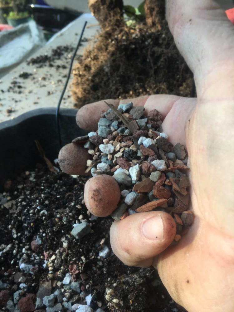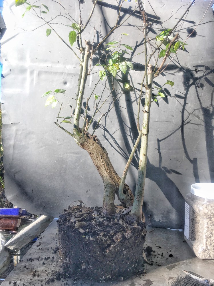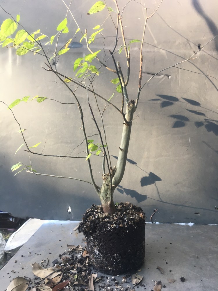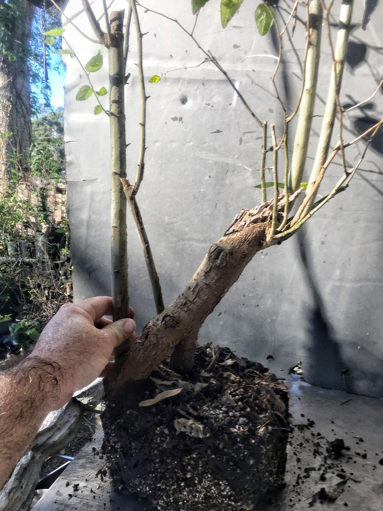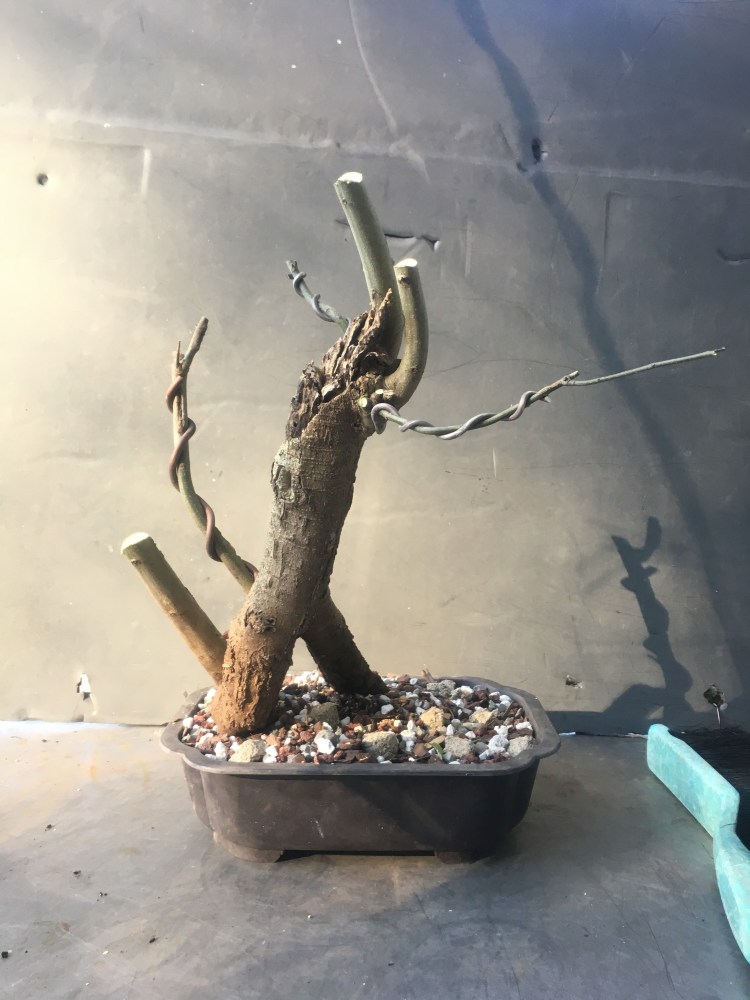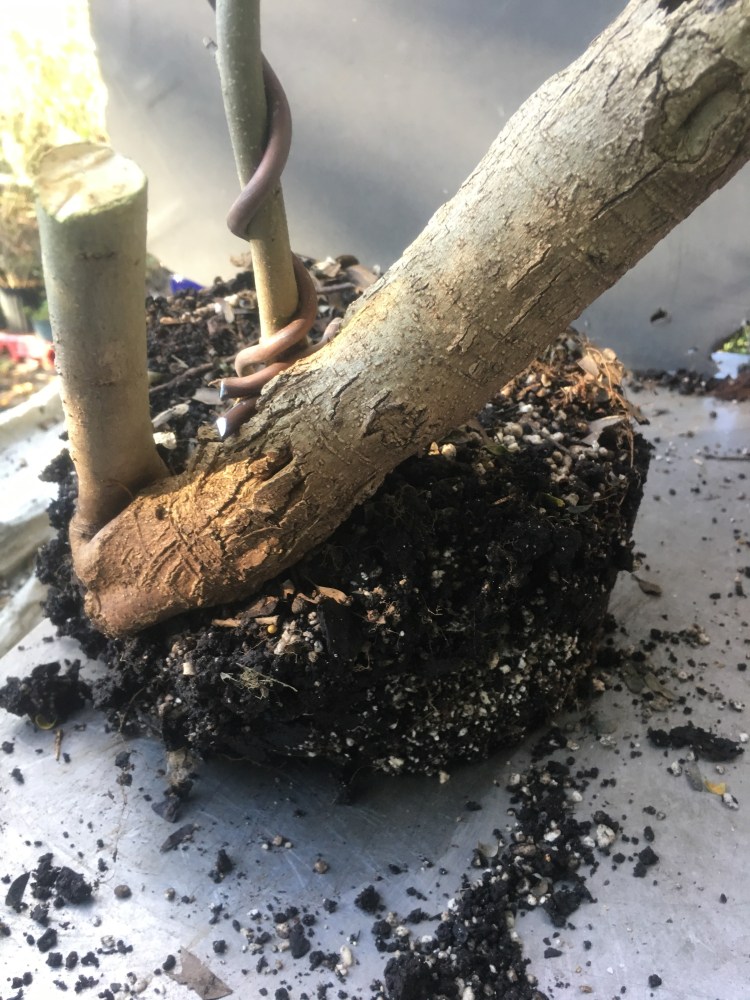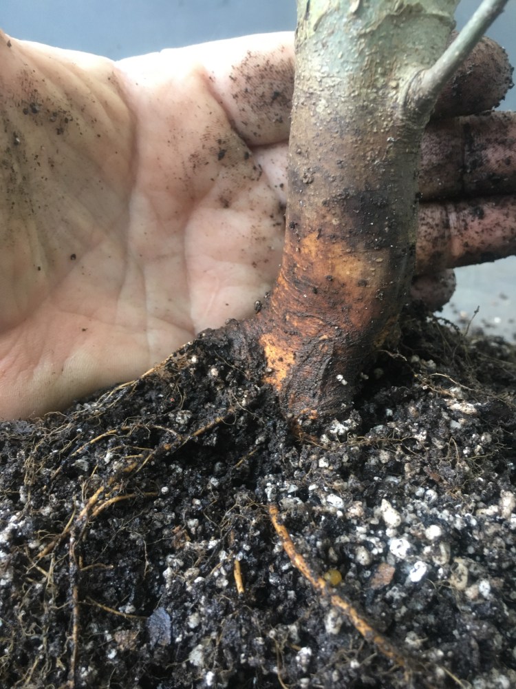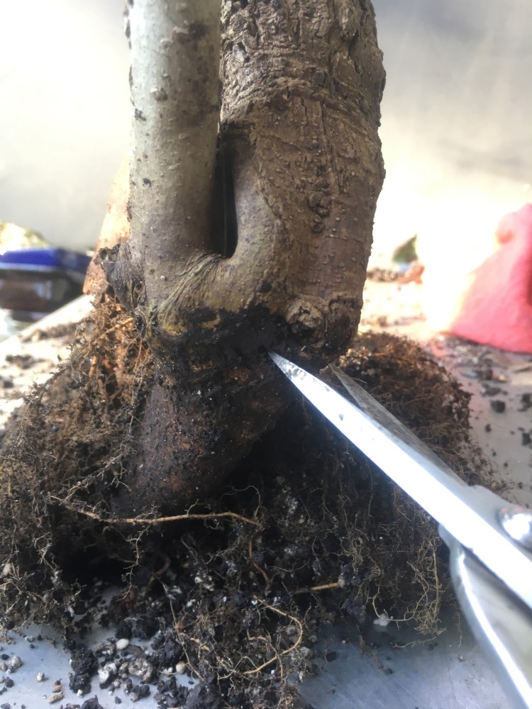 Now what? Well, let’s make the best of it. I’d like some surface roots so I’m scoring some places on the trunk that’ll be under the soil line. That should help with more roots.