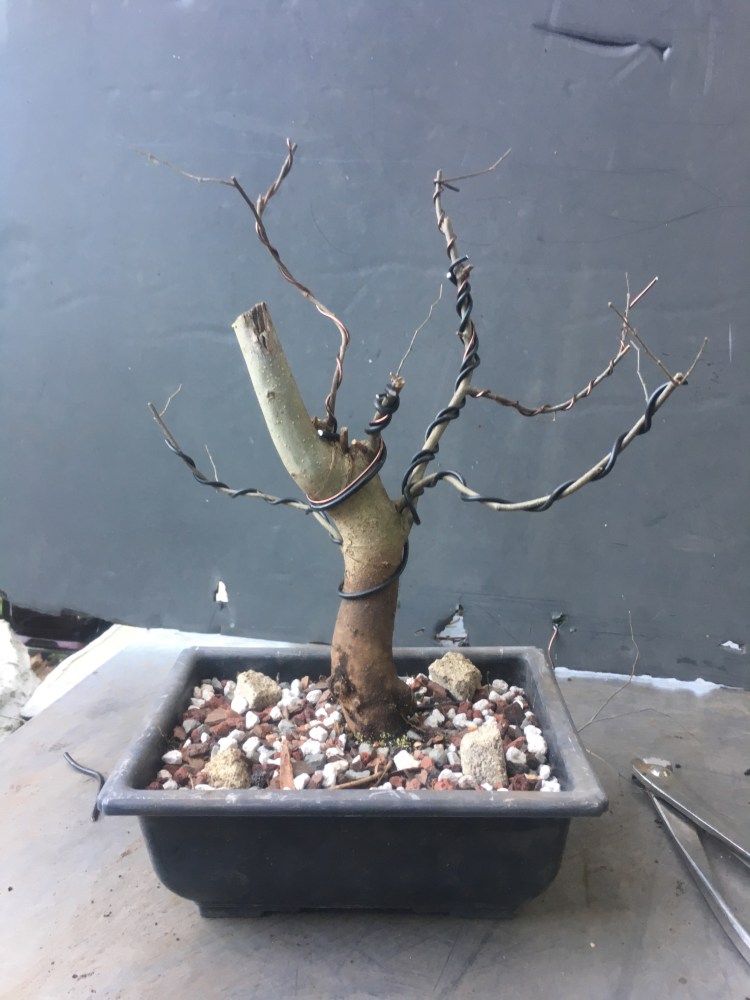 Ok, a lot. You know me, I wire. I’m of the opinion that if you’re not using wire, it’s not modern bonsai. Here’s an analogy for you: traditionally, man painted with his fingers. Then Ug, the Picasso of the cavemen, picked up a feather, the first paintbrush, and revolutionized the art of painting. It’s the same principle with wire on bonsai. The practice is less than a hundred years old, so most definitely not traditional, but that’s how modern bonsai practitioners make trees. That doesn’t mean not to use clip and grow, I use both techniques, even on the same tree, but if you’re not wiring, it’s like only using your fingers whilst painting a picture, you can only get to a certain level of refinement because of the limitations of your tools.