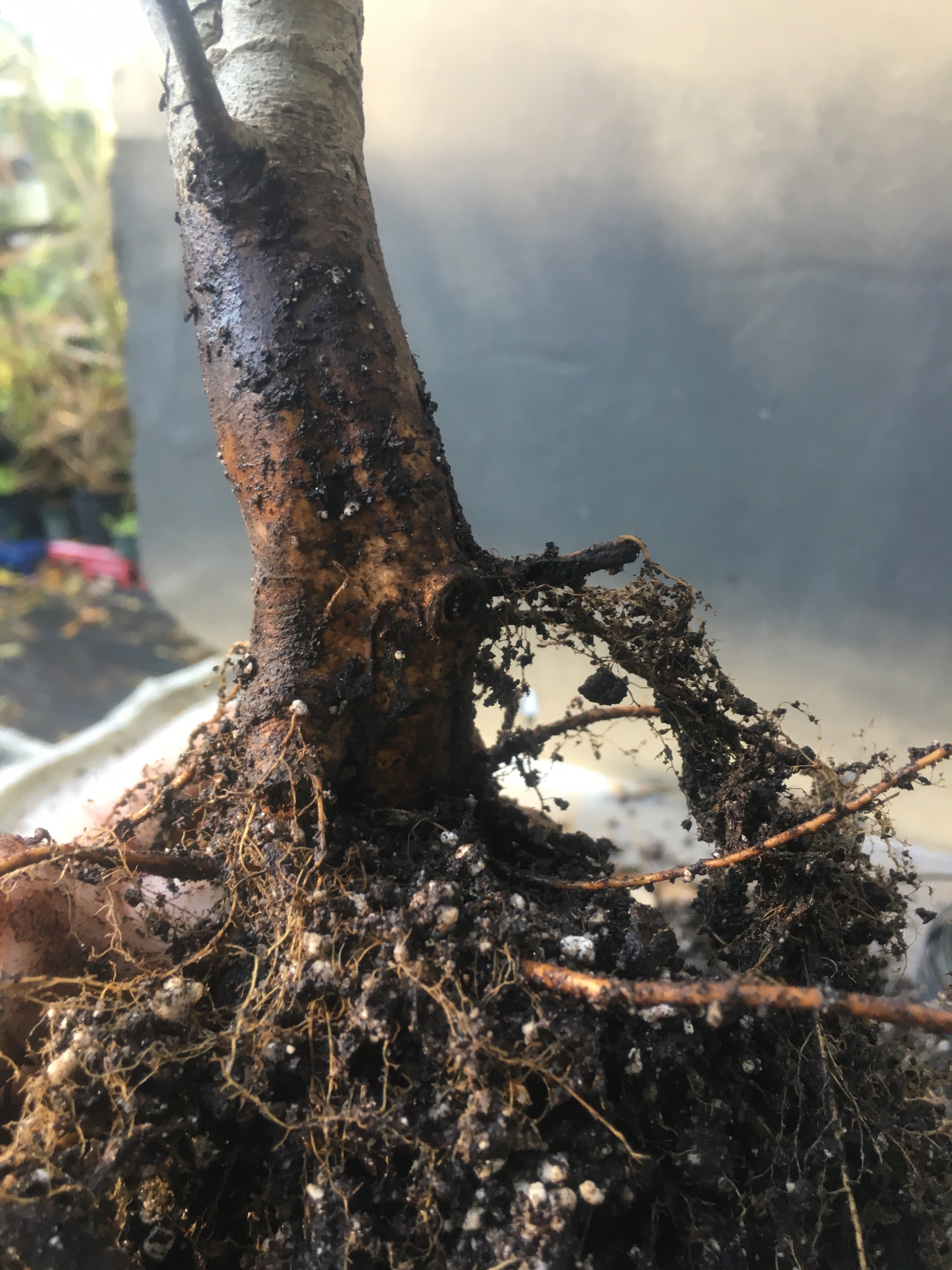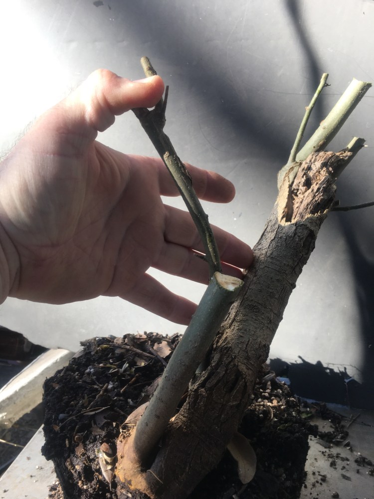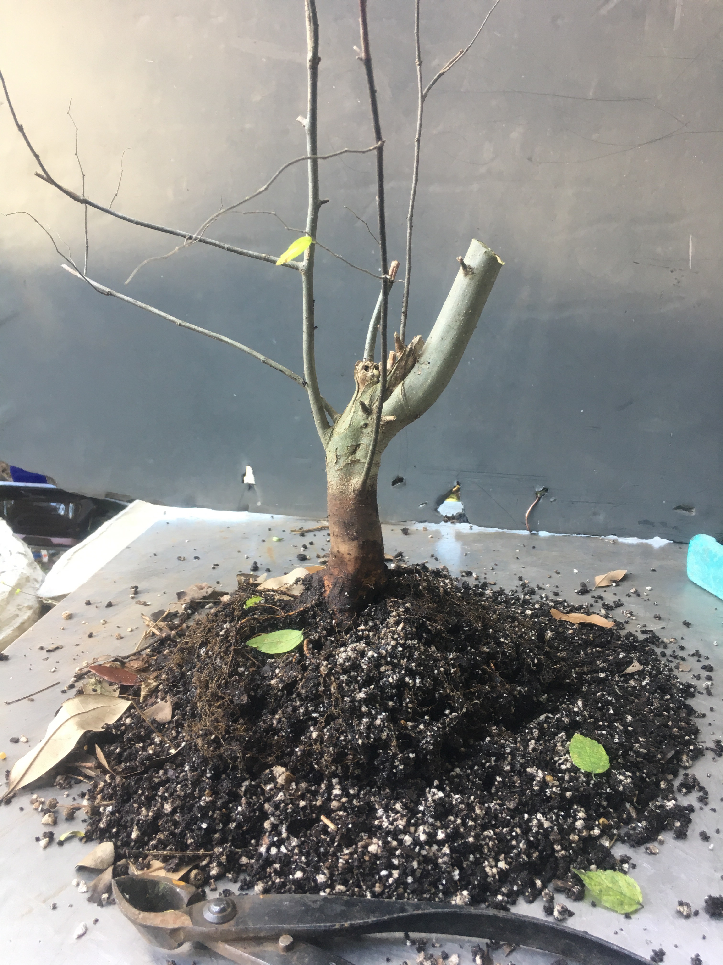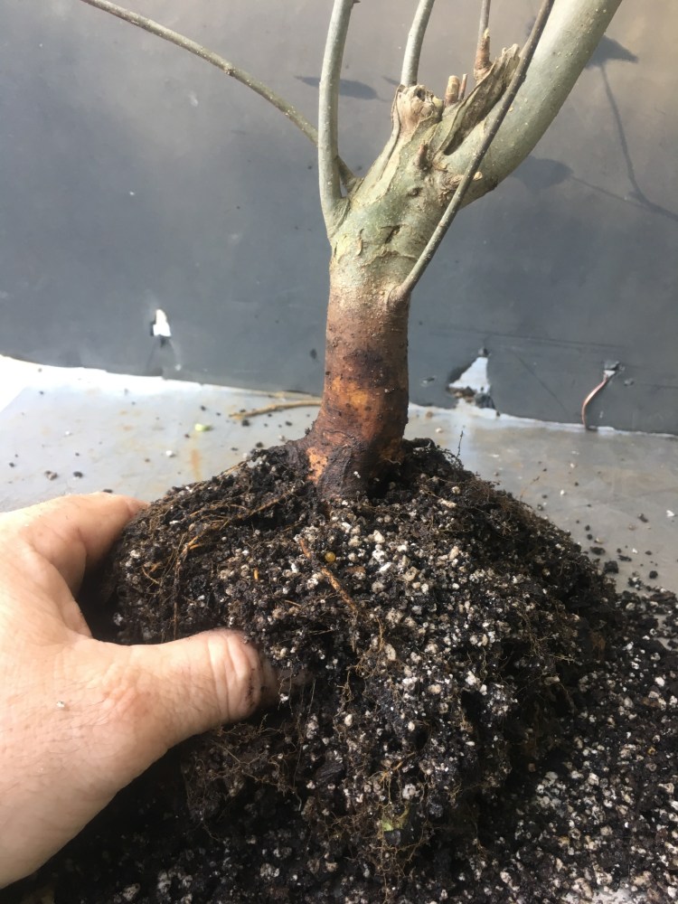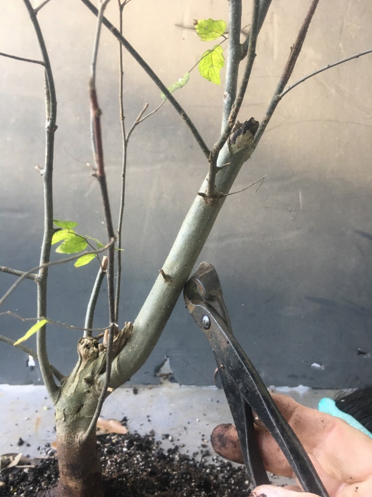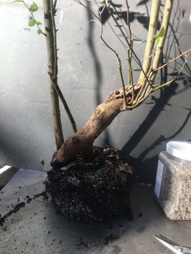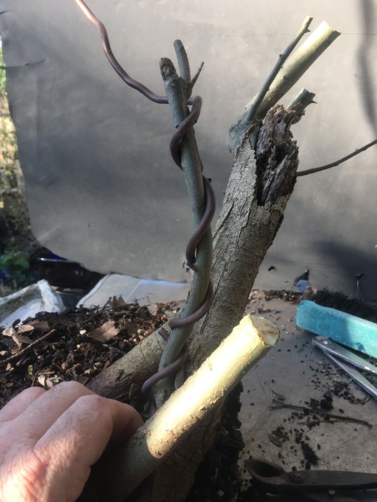 Now what? Well, let’s make the best of it. I’d like some surface roots so I’m scoring some places on the trunk that’ll be under the soil line. That should help with more roots.