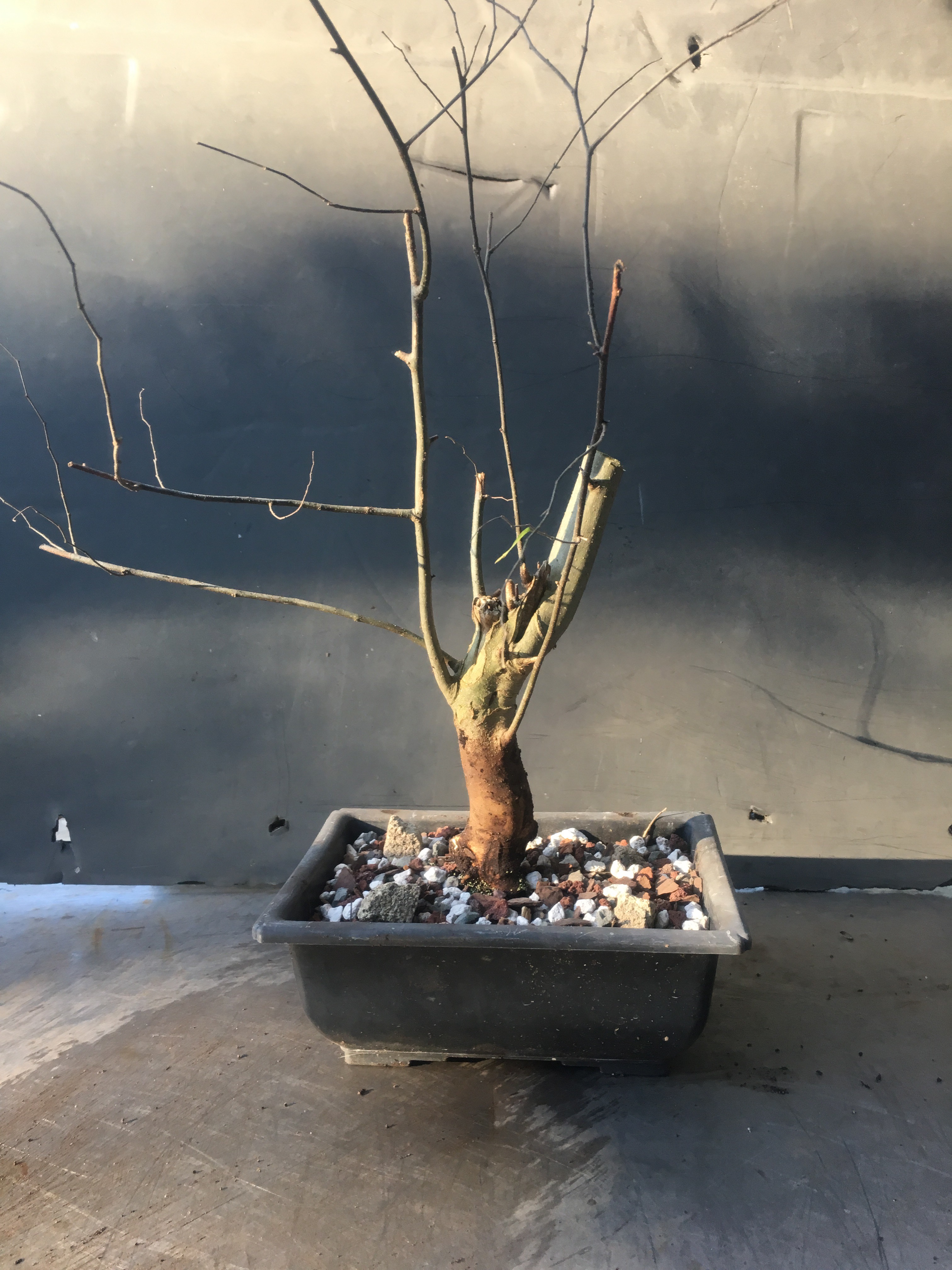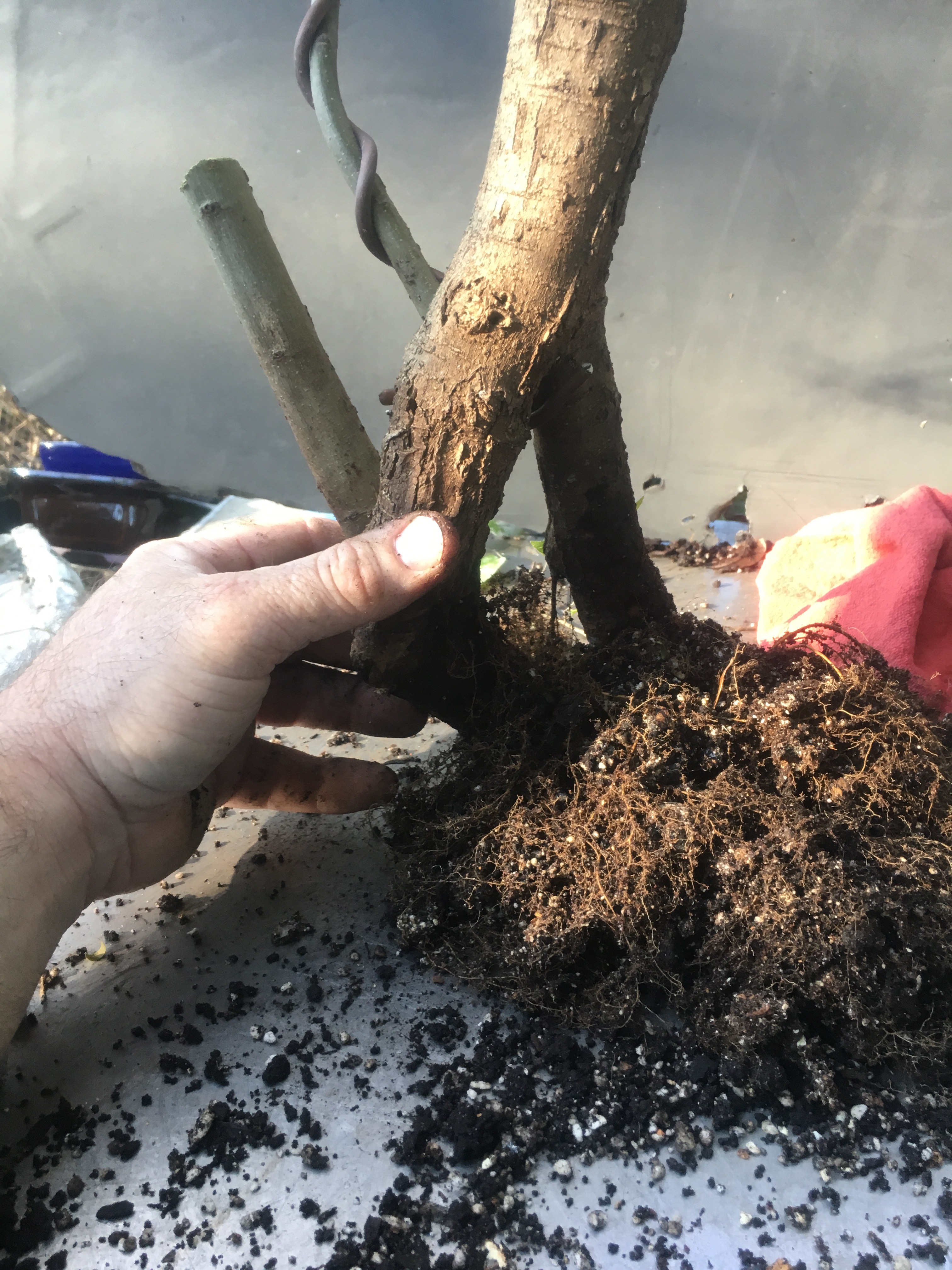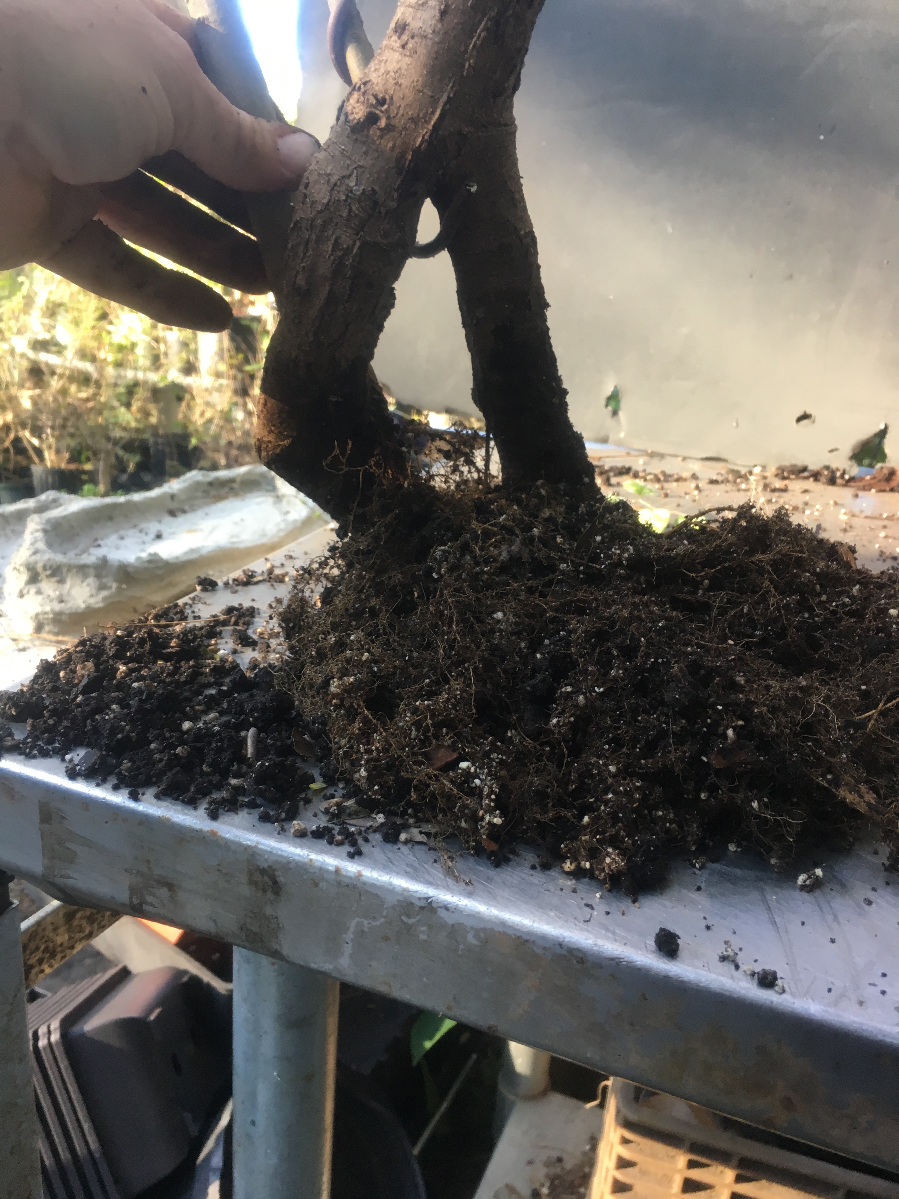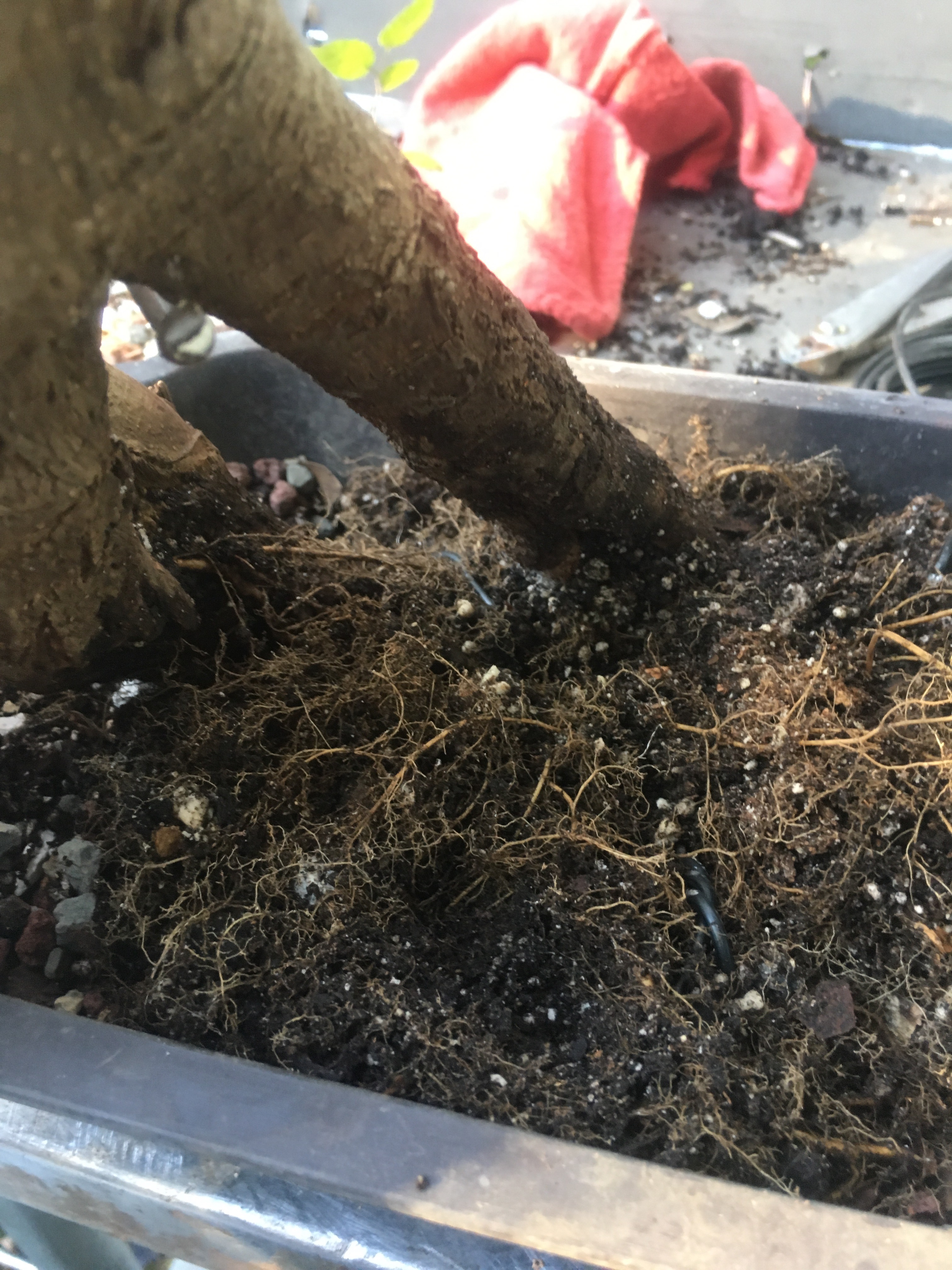 Now what? Well, let’s make the best of it. I’d like some surface roots so I’m scoring some places on the trunk that’ll be under the soil line. That should help with more roots.