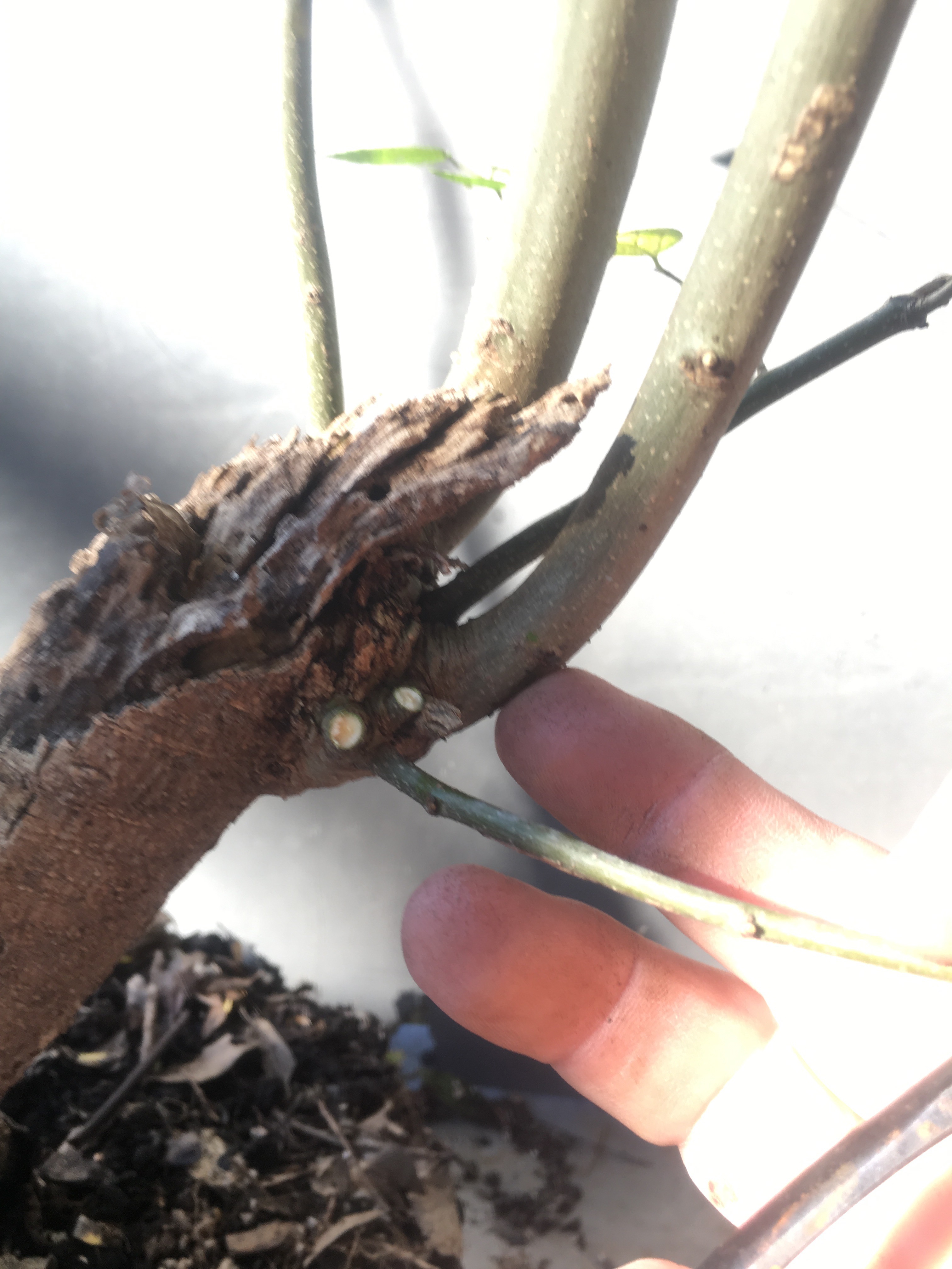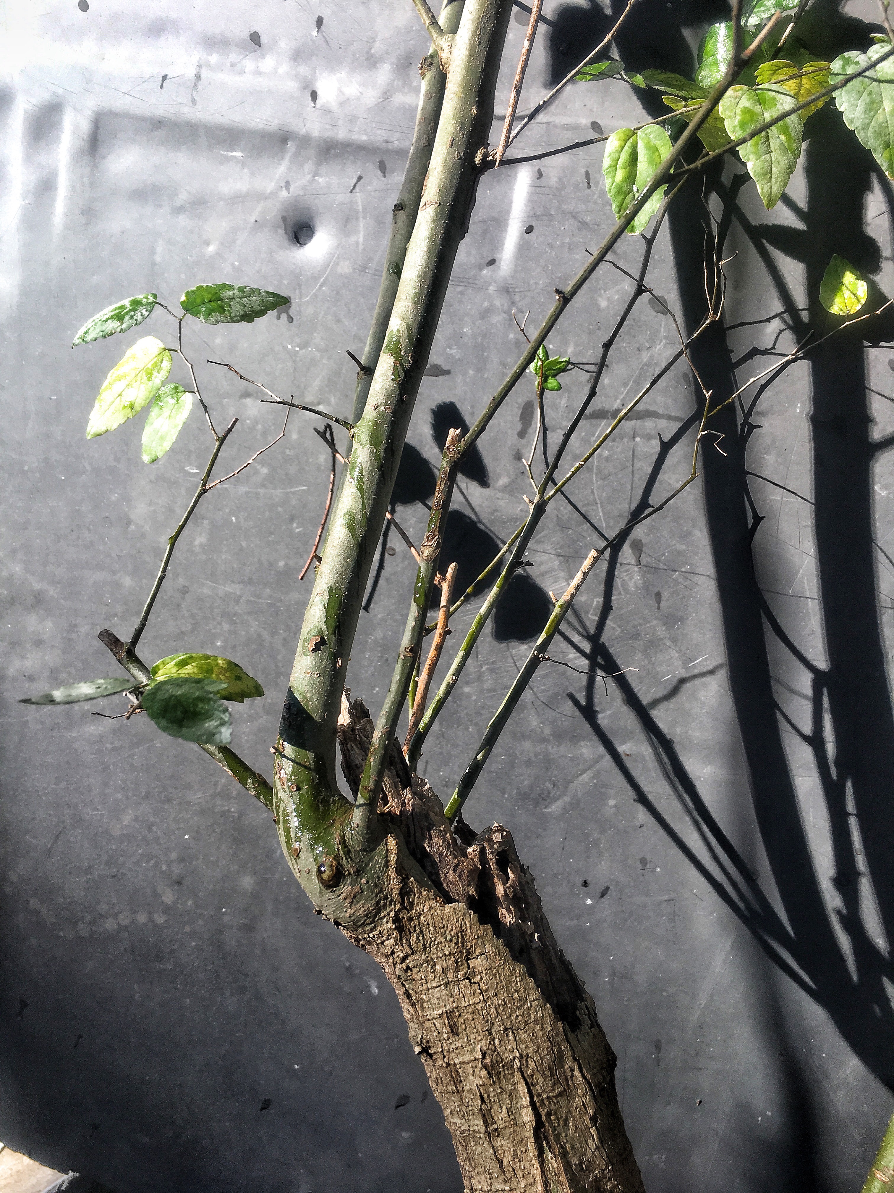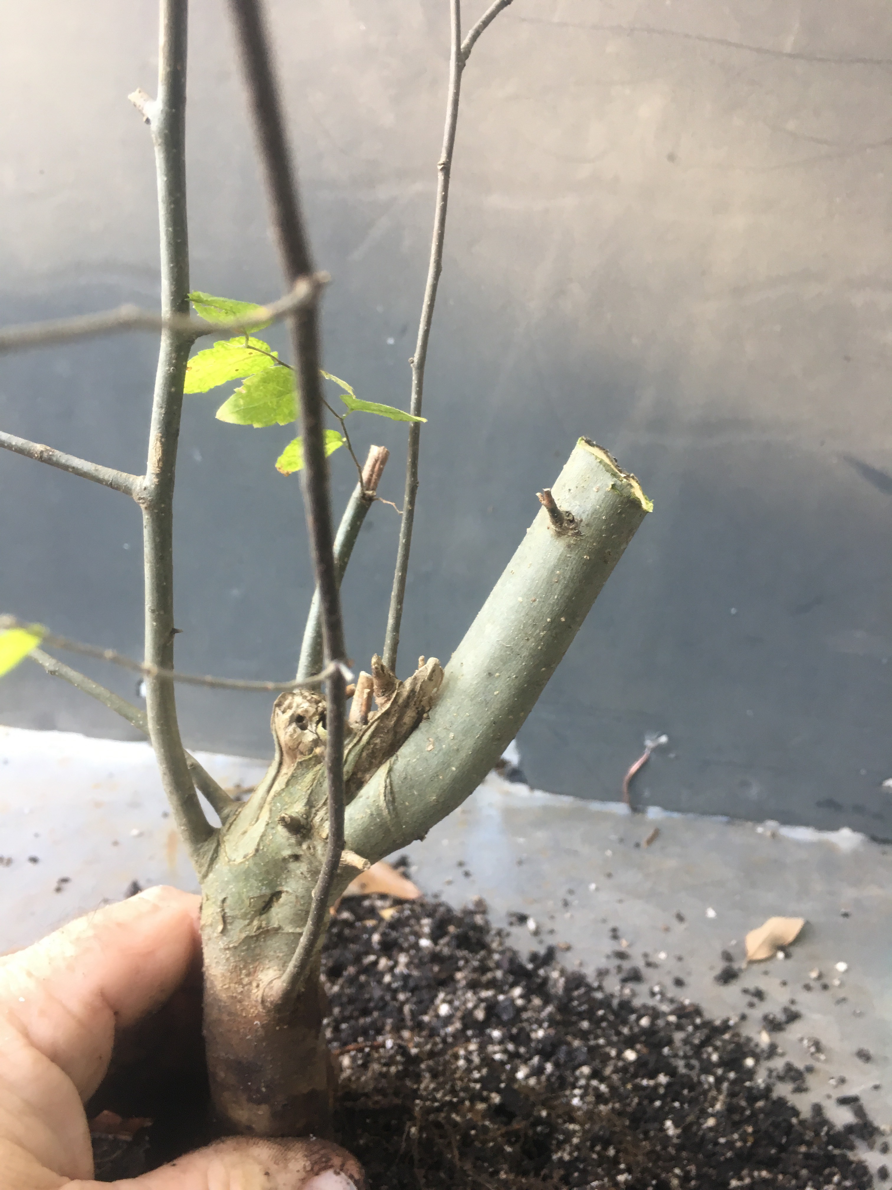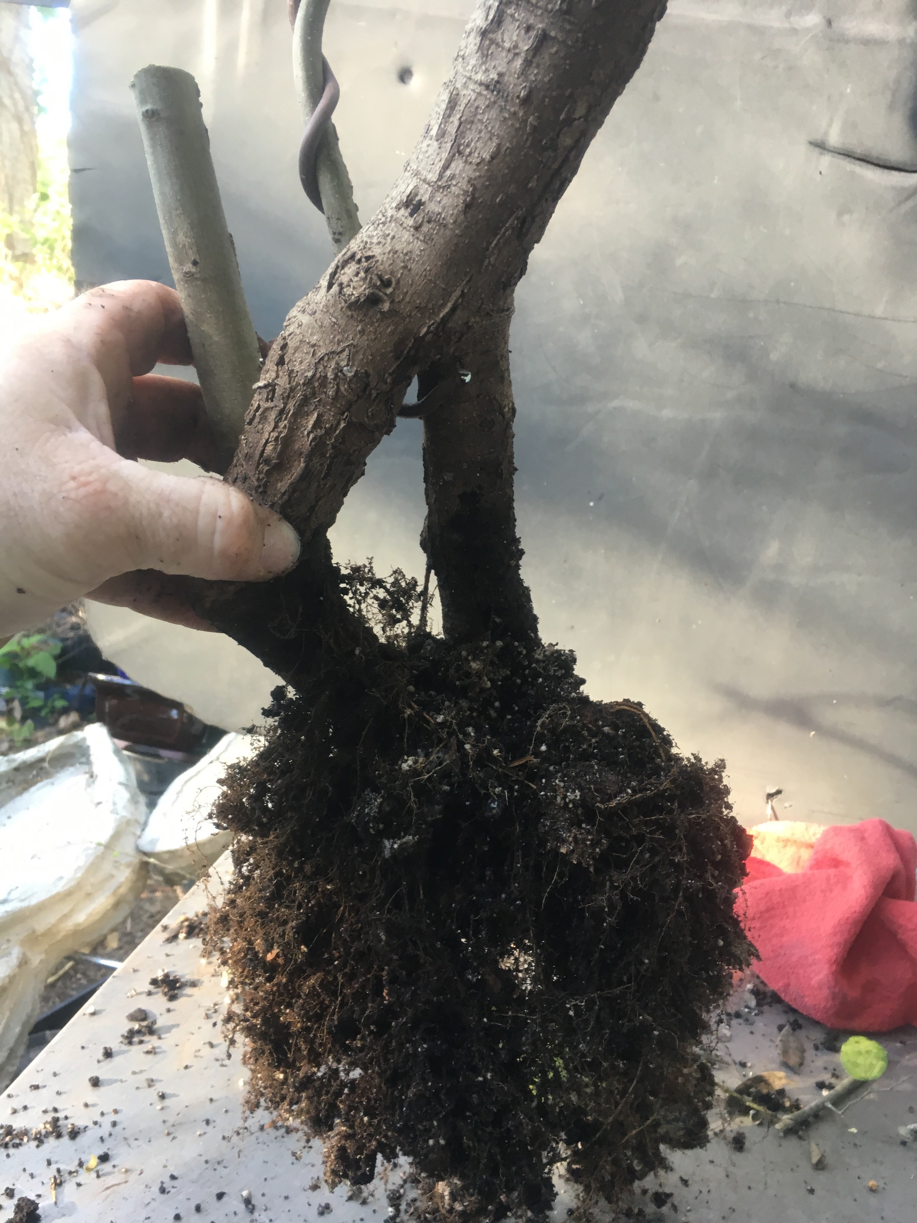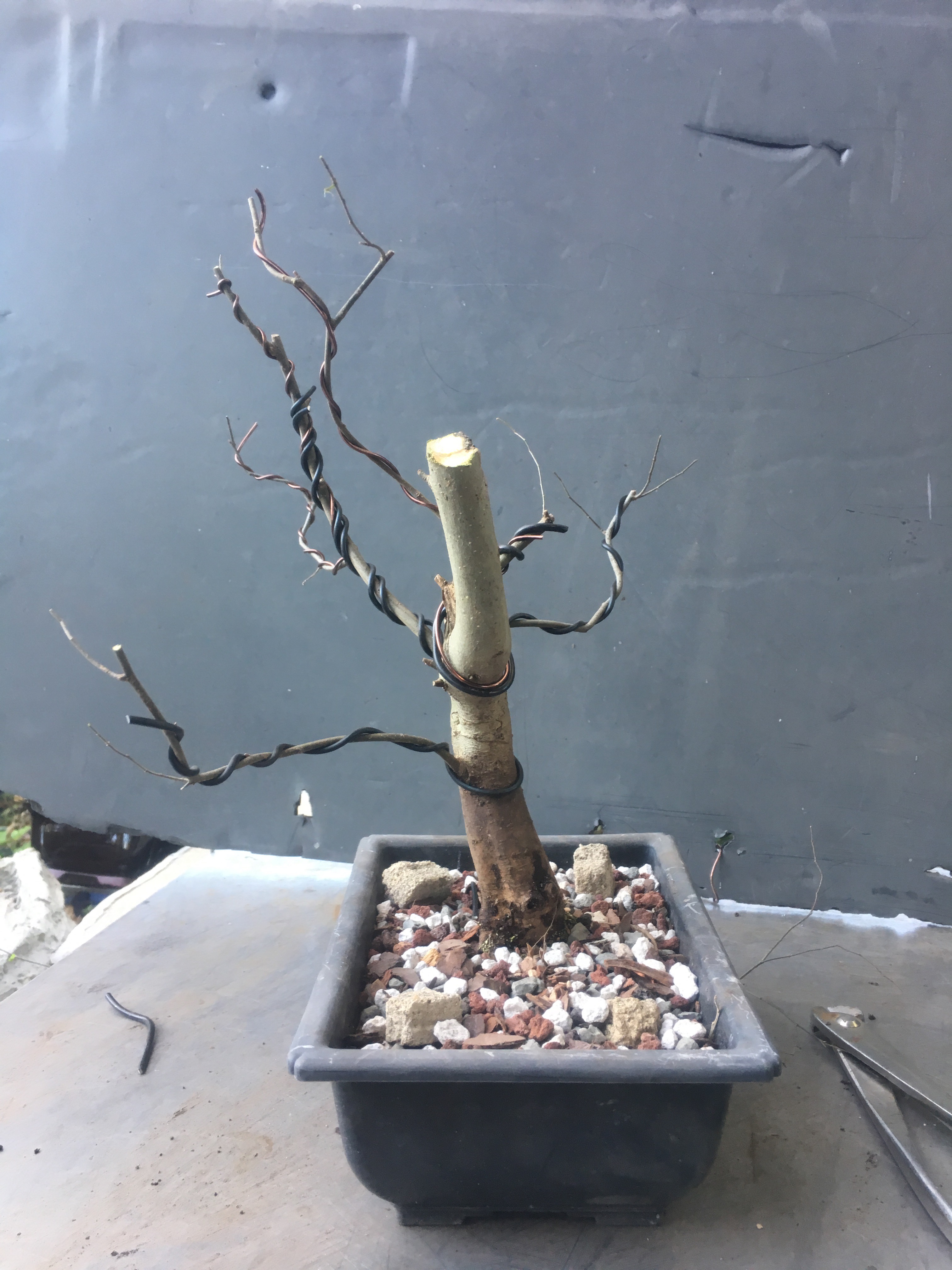 Now what? Well, let’s make the best of it. I’d like some surface roots so I’m scoring some places on the trunk that’ll be under the soil line. That should help with more roots.