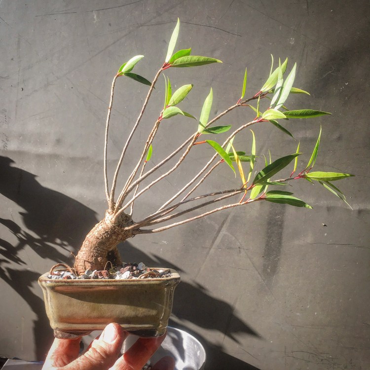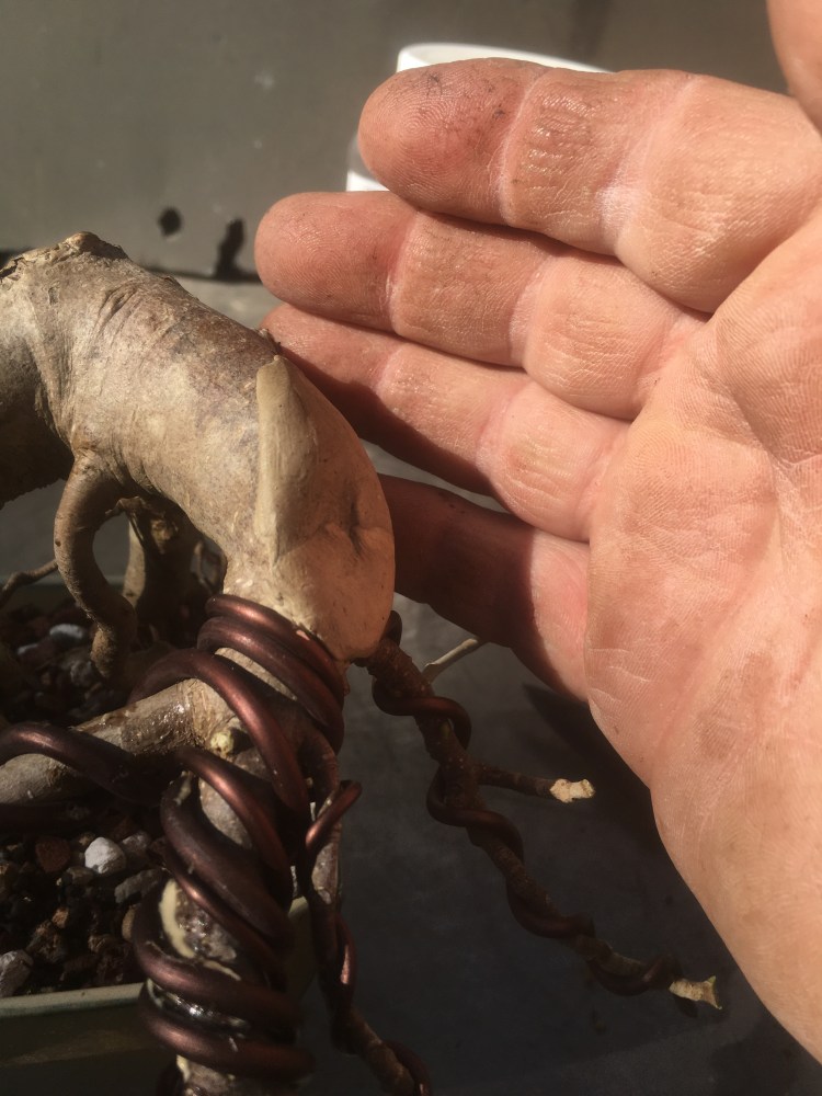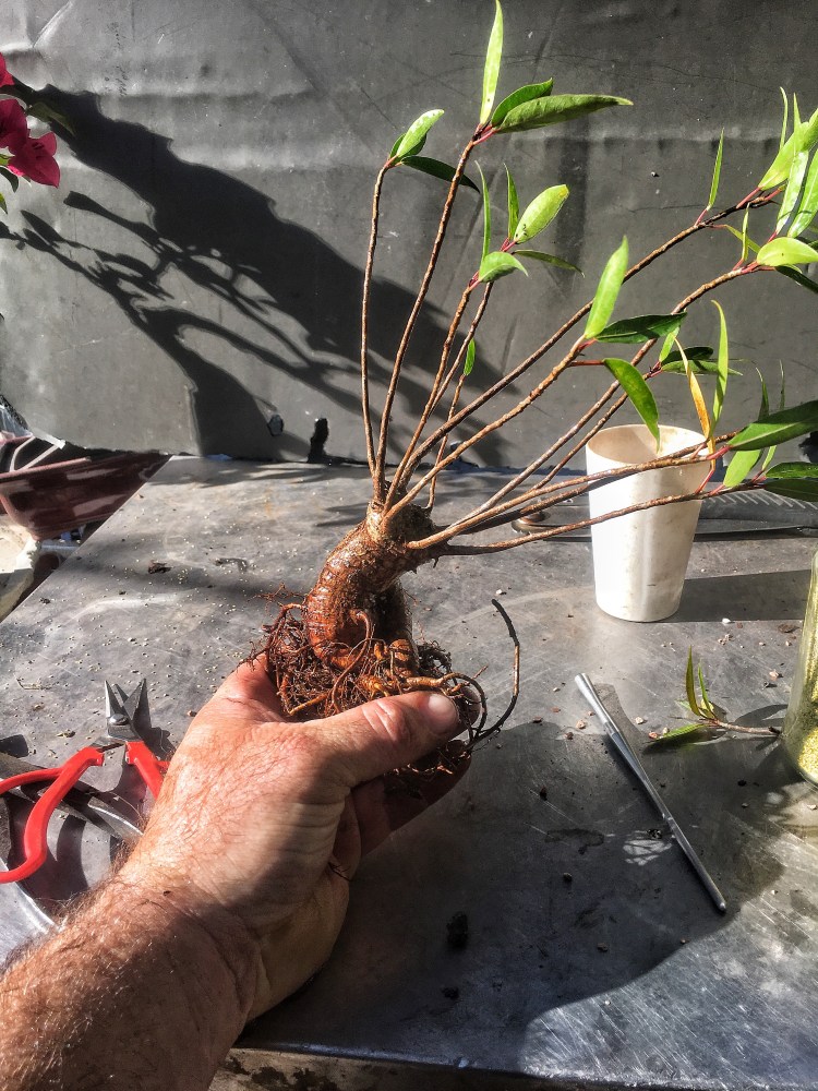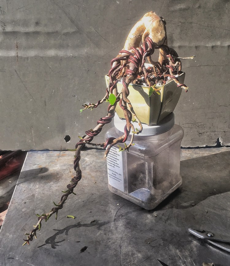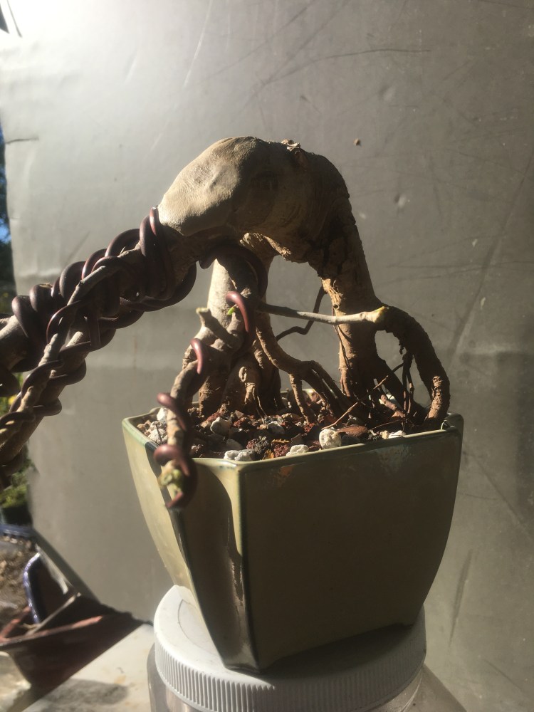 Ficus salicaria root cutting:It’s going to stay just like that for a while. When I posted it on those social media sites, it was like the bonsai people turned into bonsai styling fascists. They insisted I cut it back to one or two branches, fit it into a mold, use a cookie cutter to make it look like they thought it should. So, in the spirit of discomfort and annoyance, I shall keep it as thus, for a while.
