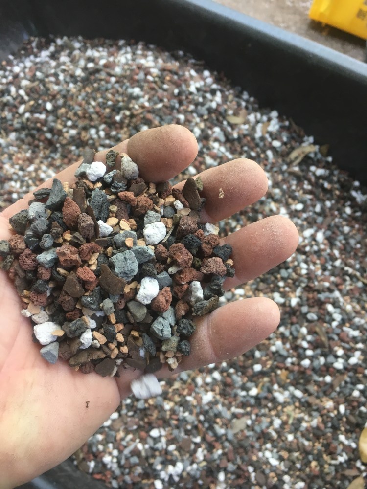 For those curious, my new mix, as of today, is: red and black lava rock (scoria), calcined clay, expanded slate, pumice, and sifted, composted pine bark. The ratio is still 2:1:1:1:1 (the lava I count as one component). I call it the Red, White, and Blue SuperMix®. Look for it soon!