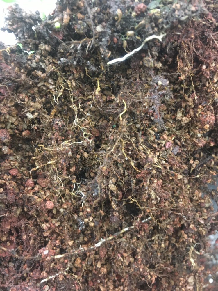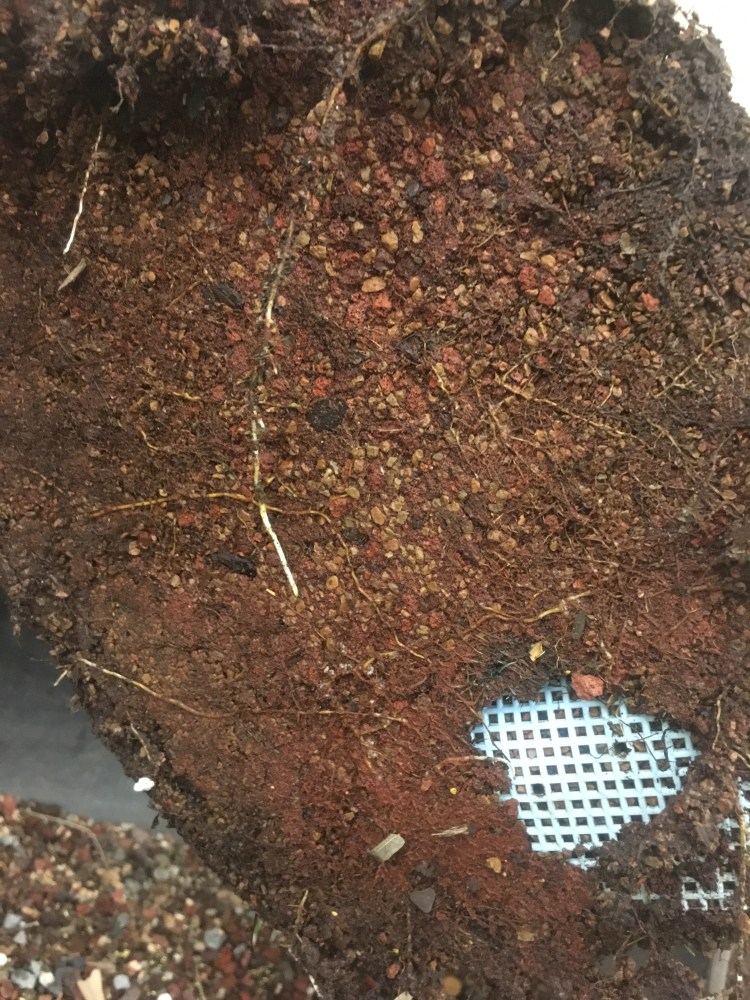 Let’s look at the rootsNot bad, some fibrous. The soil mass was just about a half inch thick.