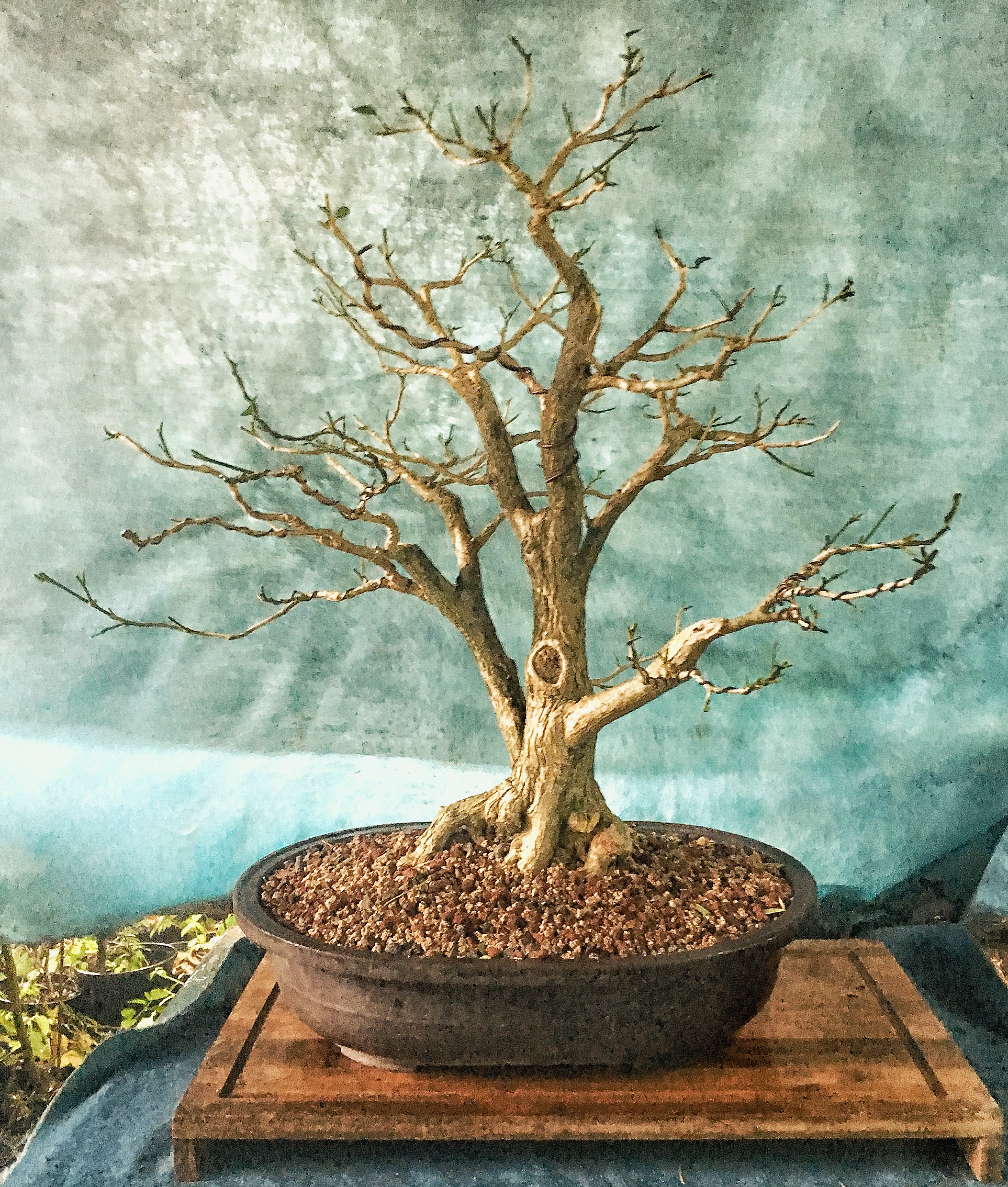 It was originally styled by one of the only living bonsai masters in the USA, Suthin Sukosolvisit. He was touring Florida (back when he did that still) and I took the tree to his BYOT workshop. It was in a 15 gallon container and was probably about 4 feet tall. I only knew Suthin (at that time) for his work on shohin trees, so I was expecting a heavy chop. Nope. He listened to the tree, let it show him the way. As he made the cuts, he explained the concept of taper, branching. He showed me a better way to look at trees. It’s not about imposing our will (or insisting on the absurd idea that a tree must be designed into a specific “style”, like windswept or semi cascade or whatever). I learned (both on that day, but also from constant questioning myself why I was doing what I was doing) that the tree knows what it wants to be, either by the way it is growing, or by the overall growth habit. That’s a hard lesson to swallow as an artist, of a person that should be able to take a blank canvas and throw pigment on it to express an idea (I hardly ever did that as a painter, I was a found object artist. I used to walk he streets and fields, wander the back alleys and forest trails, and pick up trash, magazines, old broken toys or smashed window panes, and make my art out of these things. Perhaps this is why bonsai as an art attracts me. Truly, with bonsai, you begin with a thing that already Is. You then help it become more of what it Is). But Bonsai is not a blank canvas type of art. It’s like trying to play a blues song. Or a flamenco song. There is a framework and a progression that follows. But the organic component controls the chord changes, the time signature; you can’t make a cascade bald cypress or a formal upright wisteria. You can try but it’s like singing a punk song about going to the Starbucks to get your venti skinny vanilla latte with extra foam and soy milk.