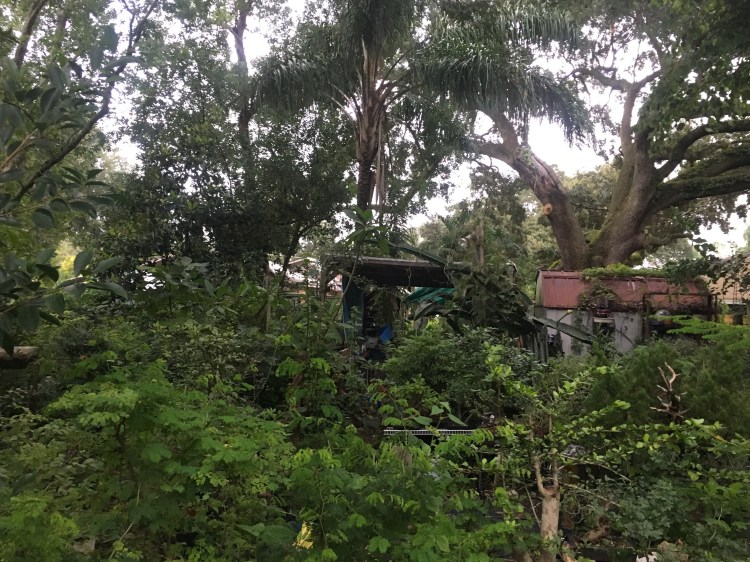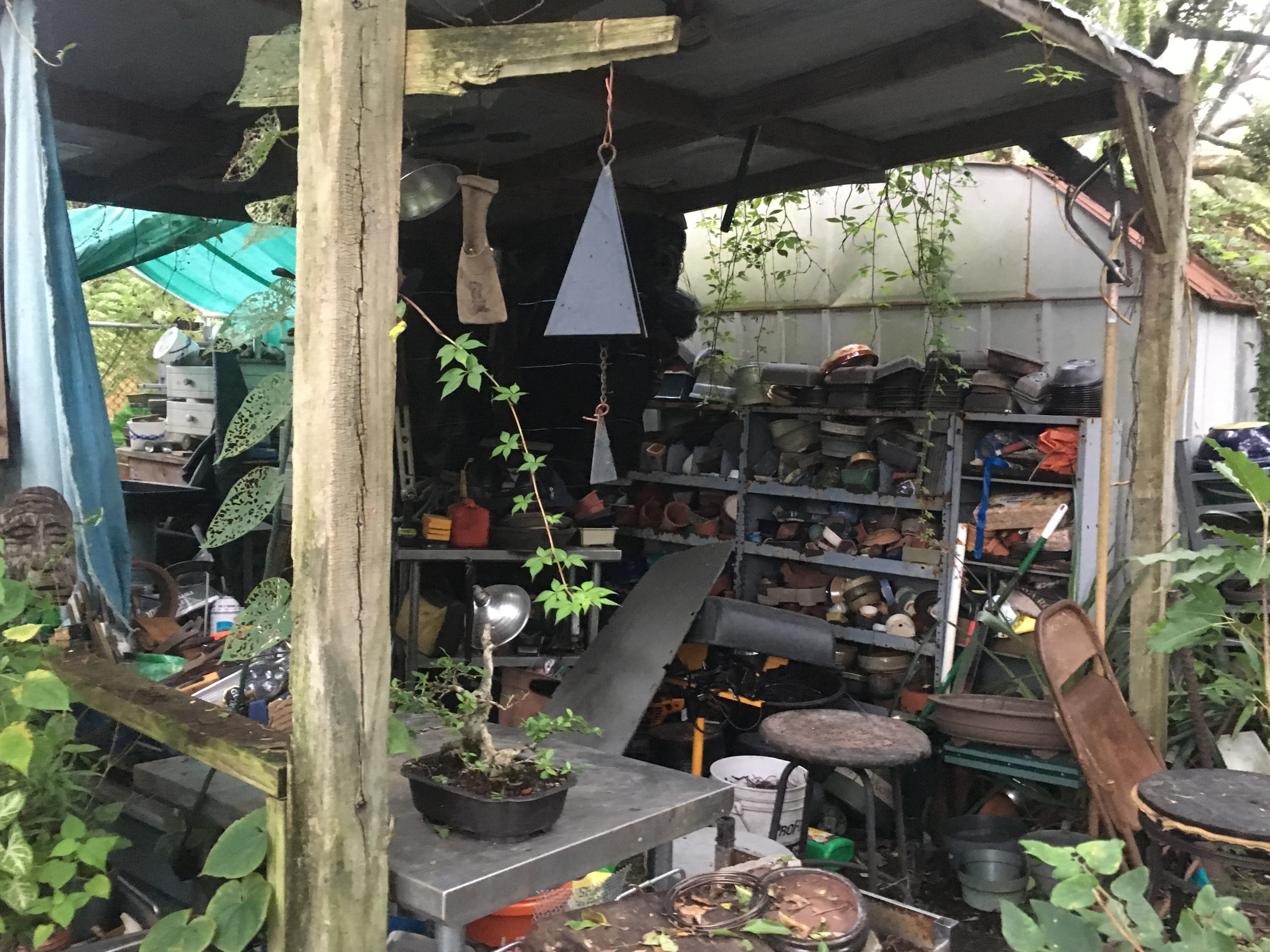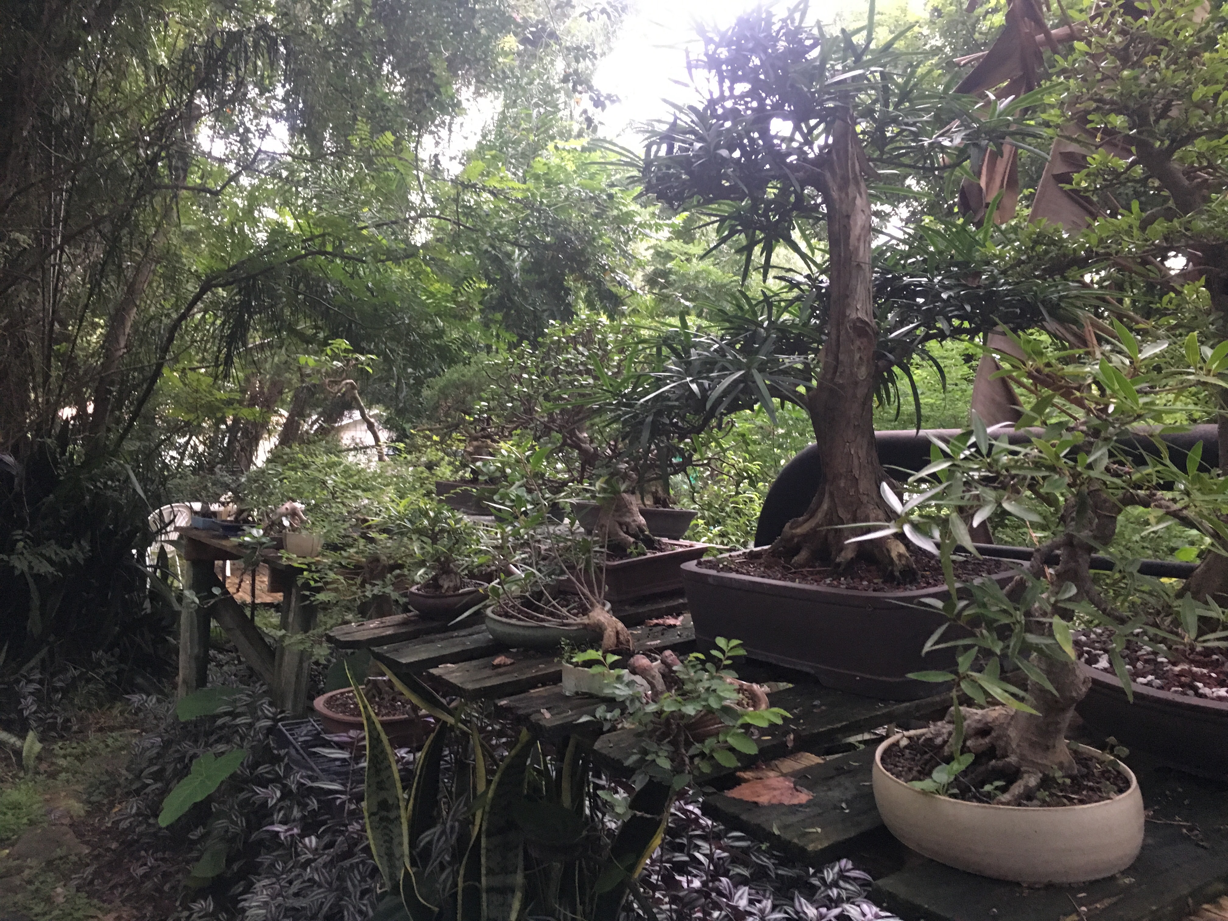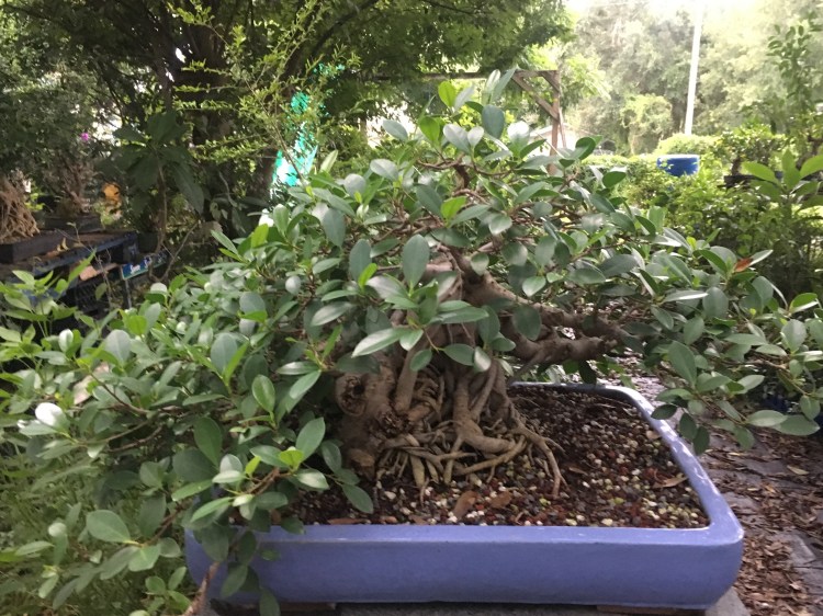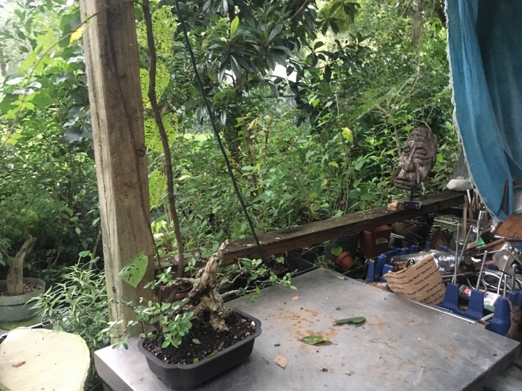 They’re good when the sun is baking the nursery (it’s a half truth that bonsai need full sun. Some do, like pines and juniper, which those “serious” bonsai people believe are the only “real” bonsai. But most tropicals and deciduous need summer sun protection. And big trees work. In the summer, the overhead trees have leaves and offer great sun protection. In the winter they’re leafless and give good sun, but I’m thinking that in this hurricane, I’ll have some damage from falling limbs.