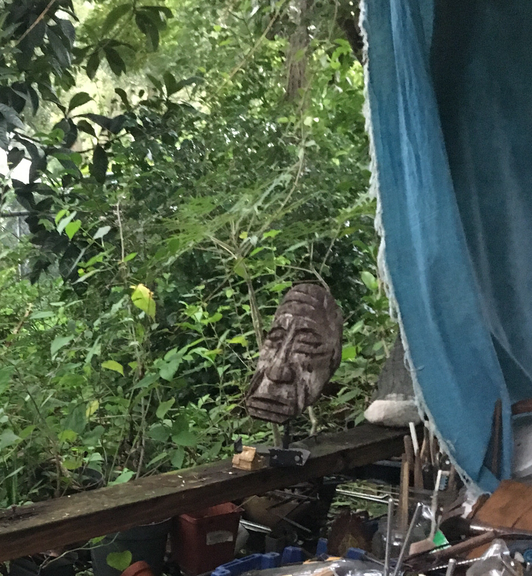 I have some work to do to secure it. Especially the Wall of Pots. I took down my backdrop on the workbench, and the blue backdrop needs to come down too, and there’s that green tarp in the back.