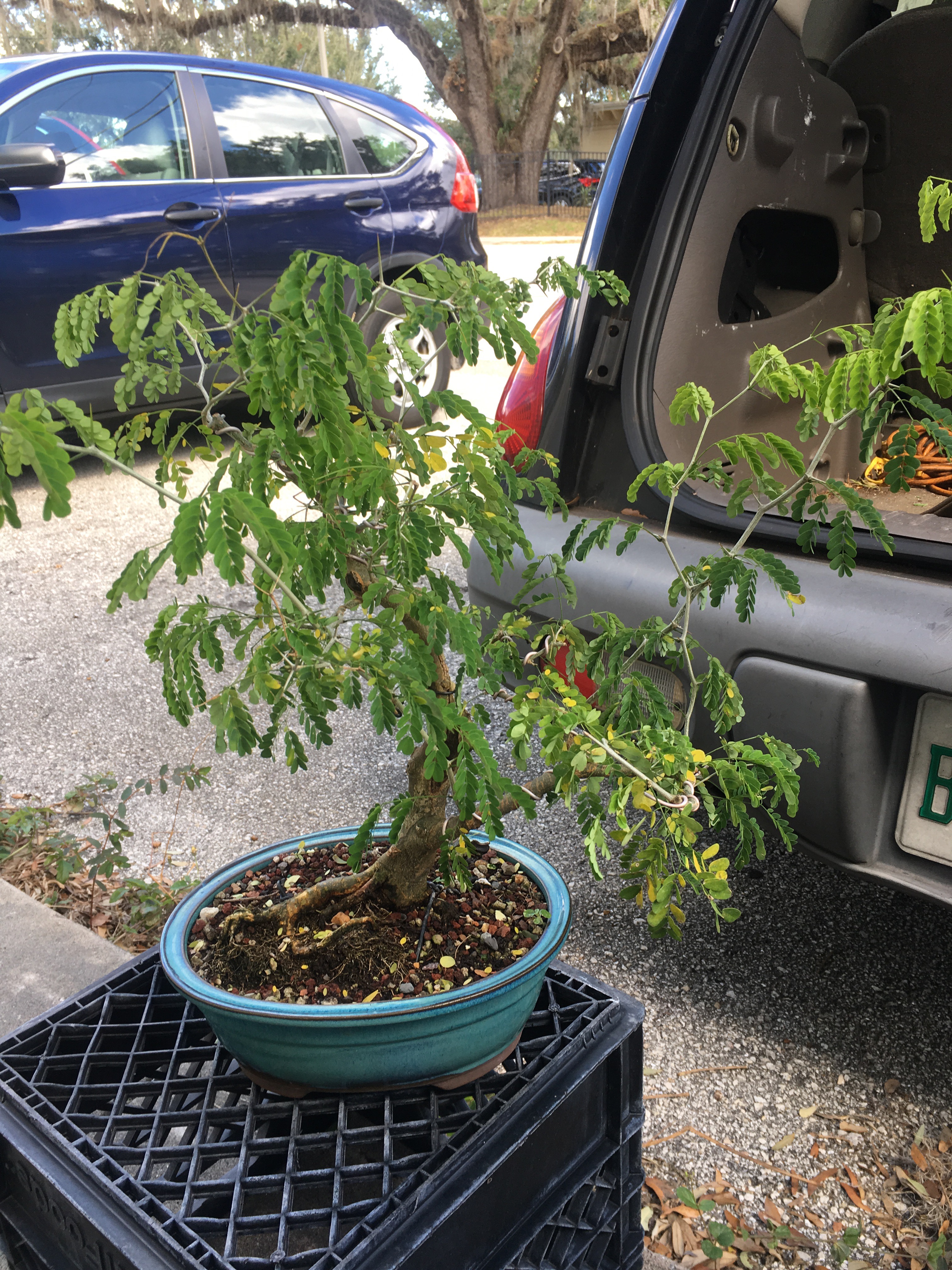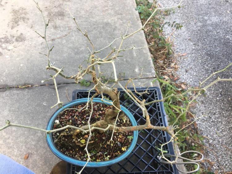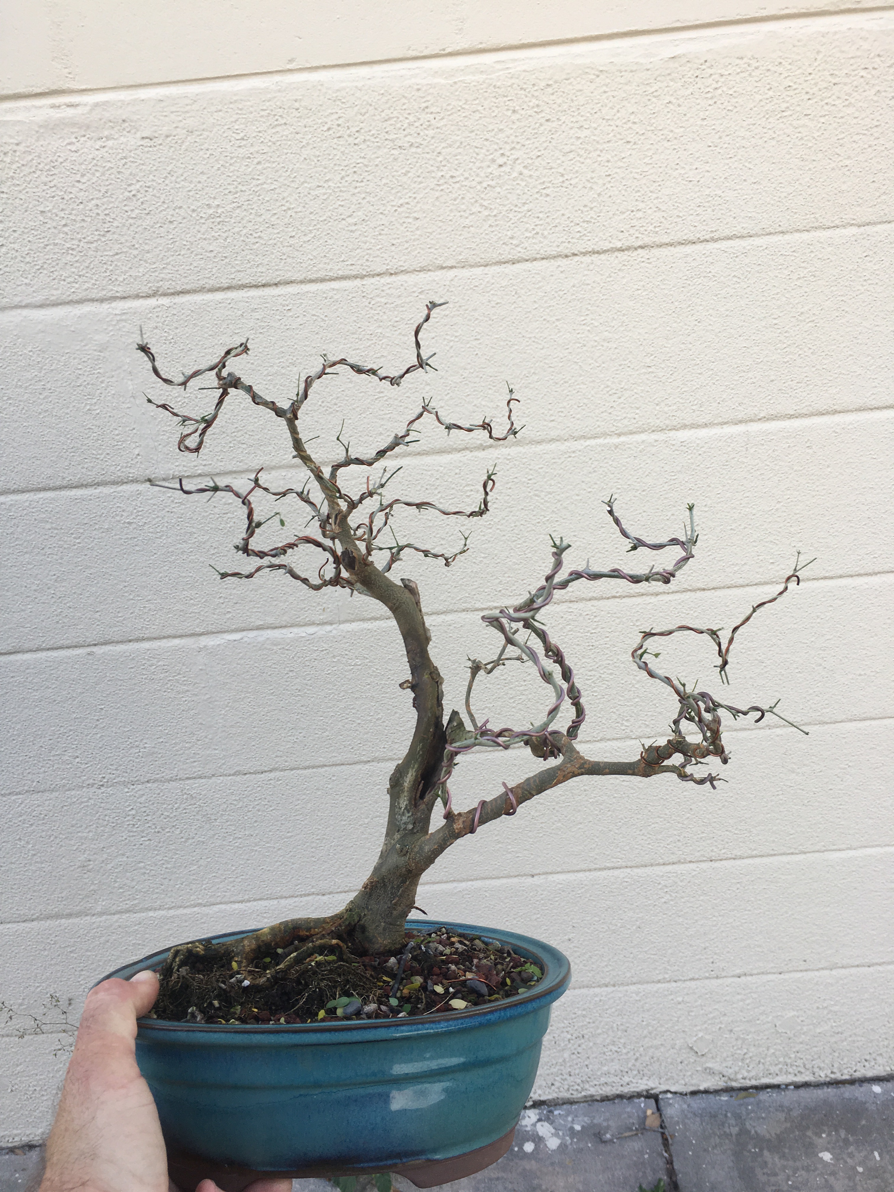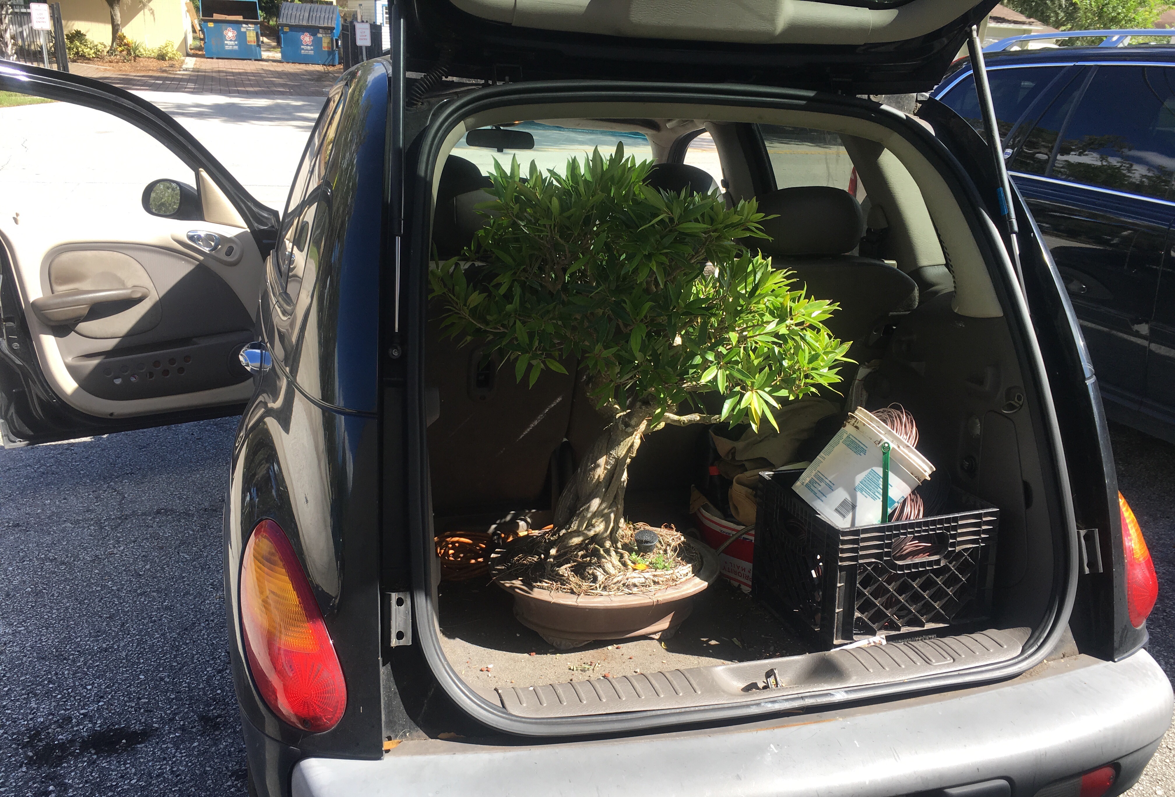 I got the tree in a Central Florida Bonsai Club auction back in June. It was originally designed, and then donated, by Donnie and Bill, who are members of both the CFBC and the Bonsai Society of Brevard (they’re overachievers, I know). But I saw something exciting and unique in the tree, so I put my hand in the air, with my wife beside me giving me the look, and won the bid. I slept on the couch that night.
