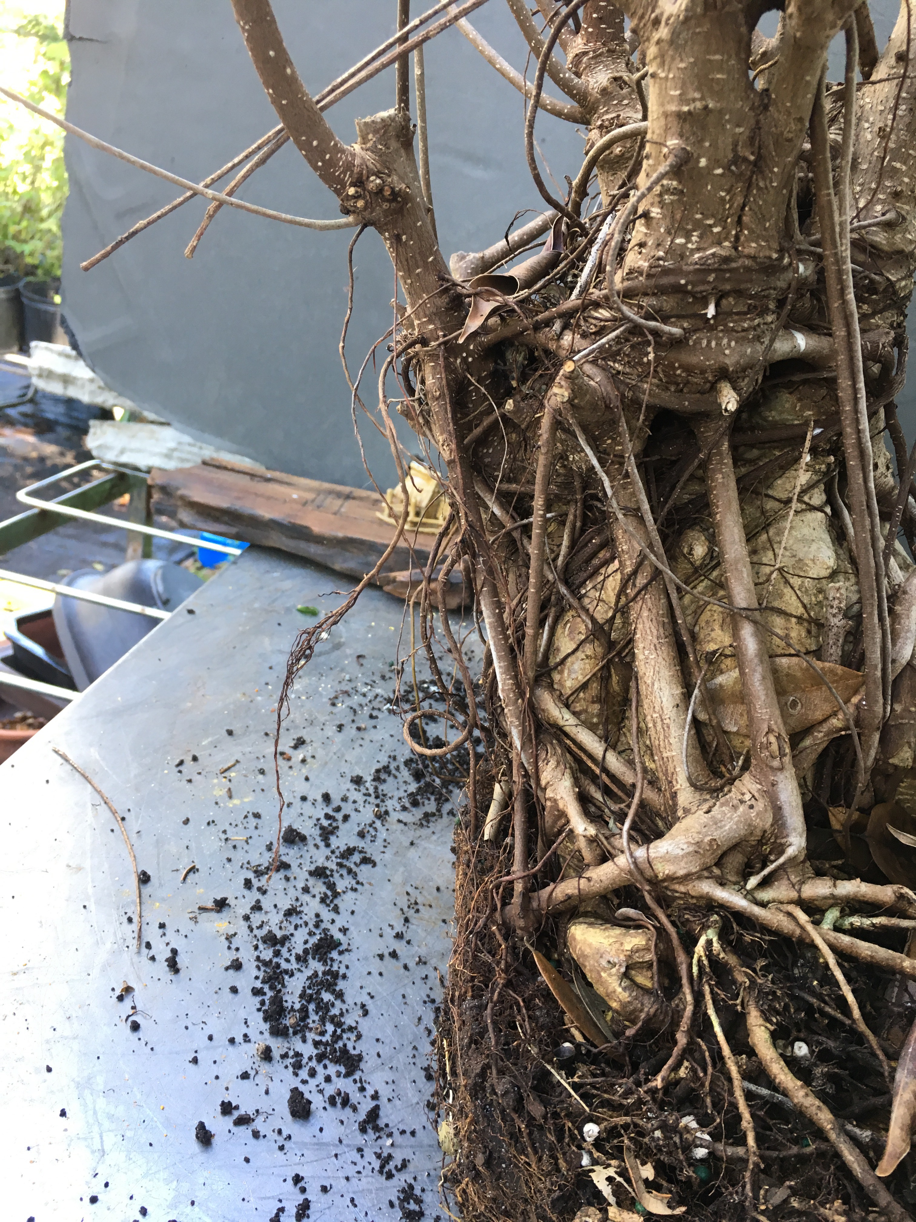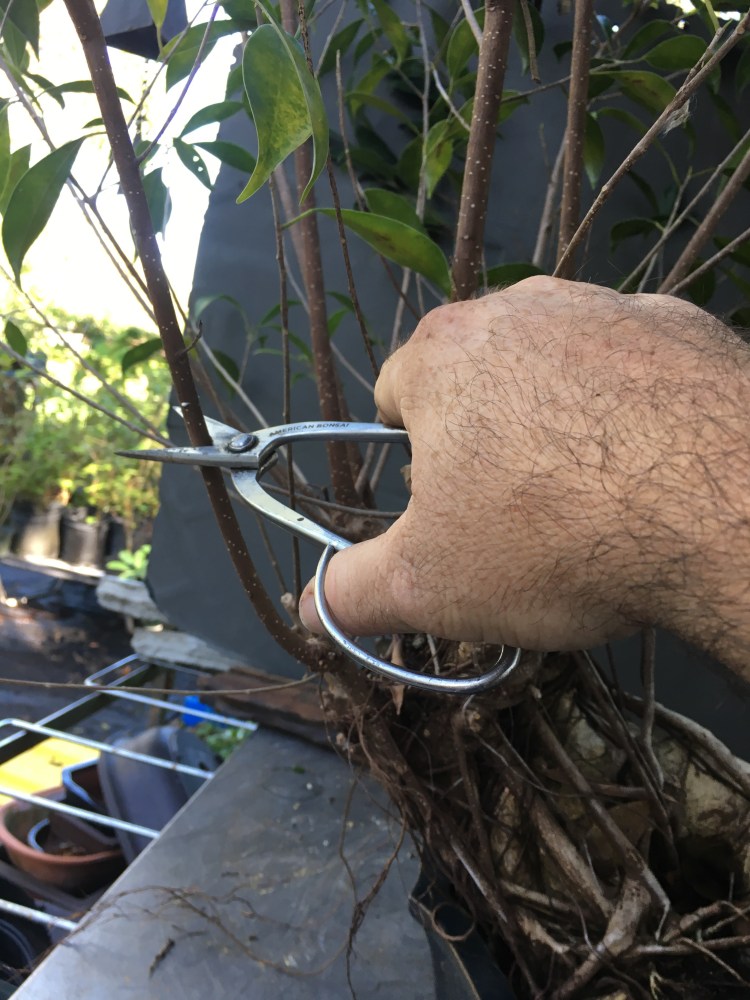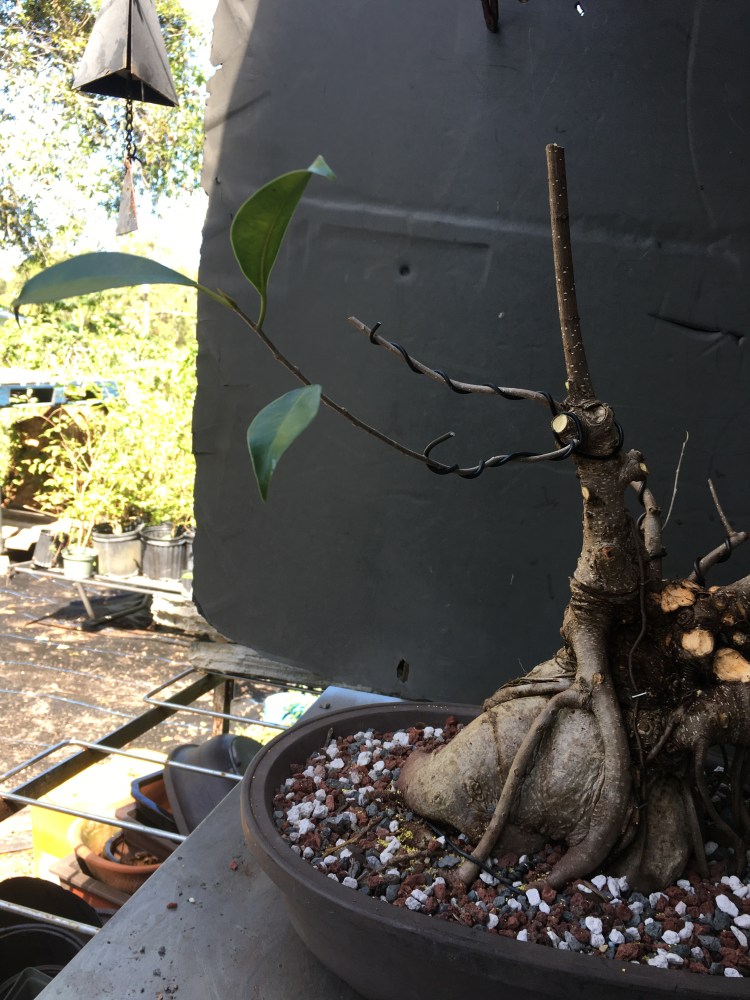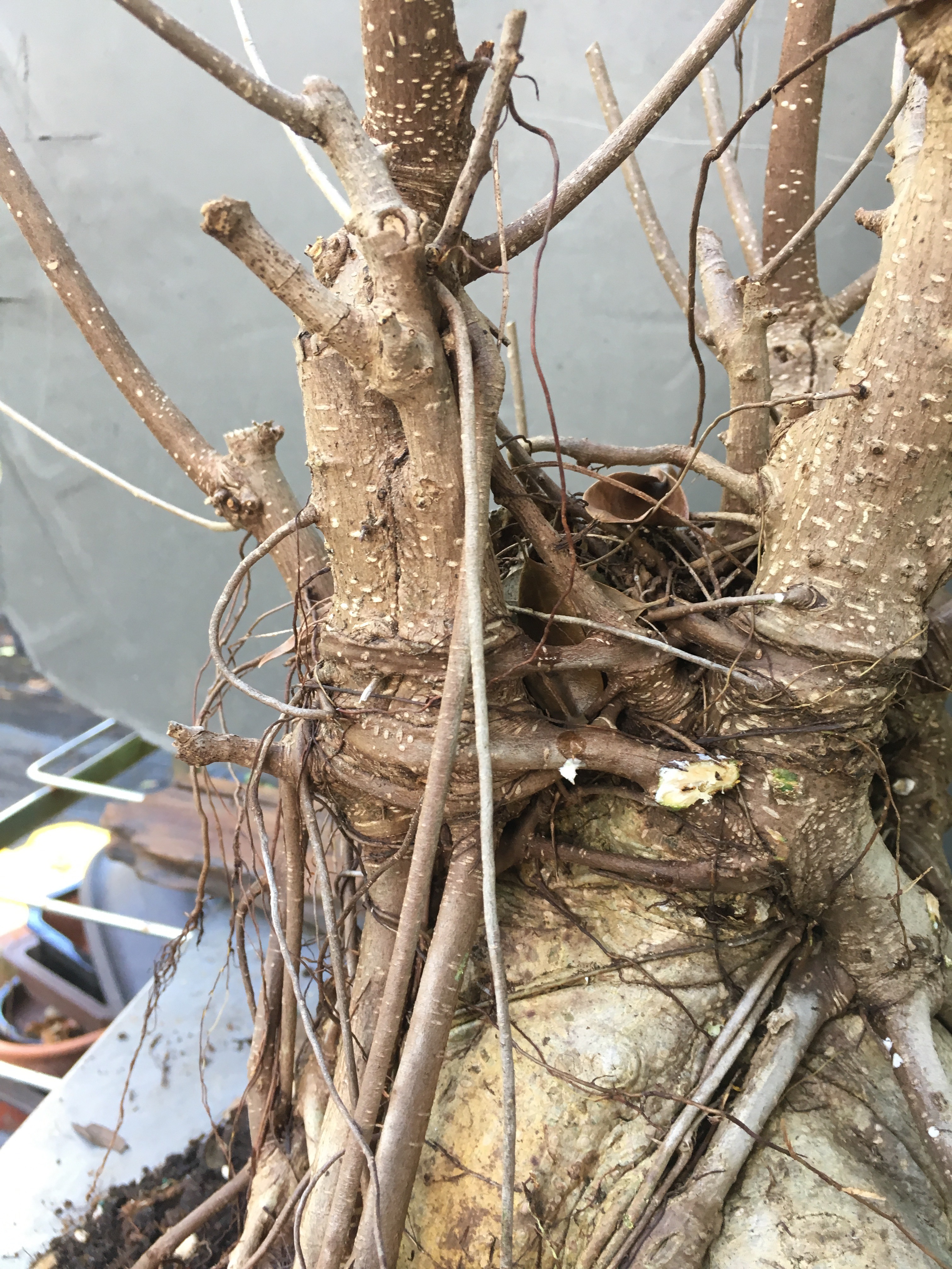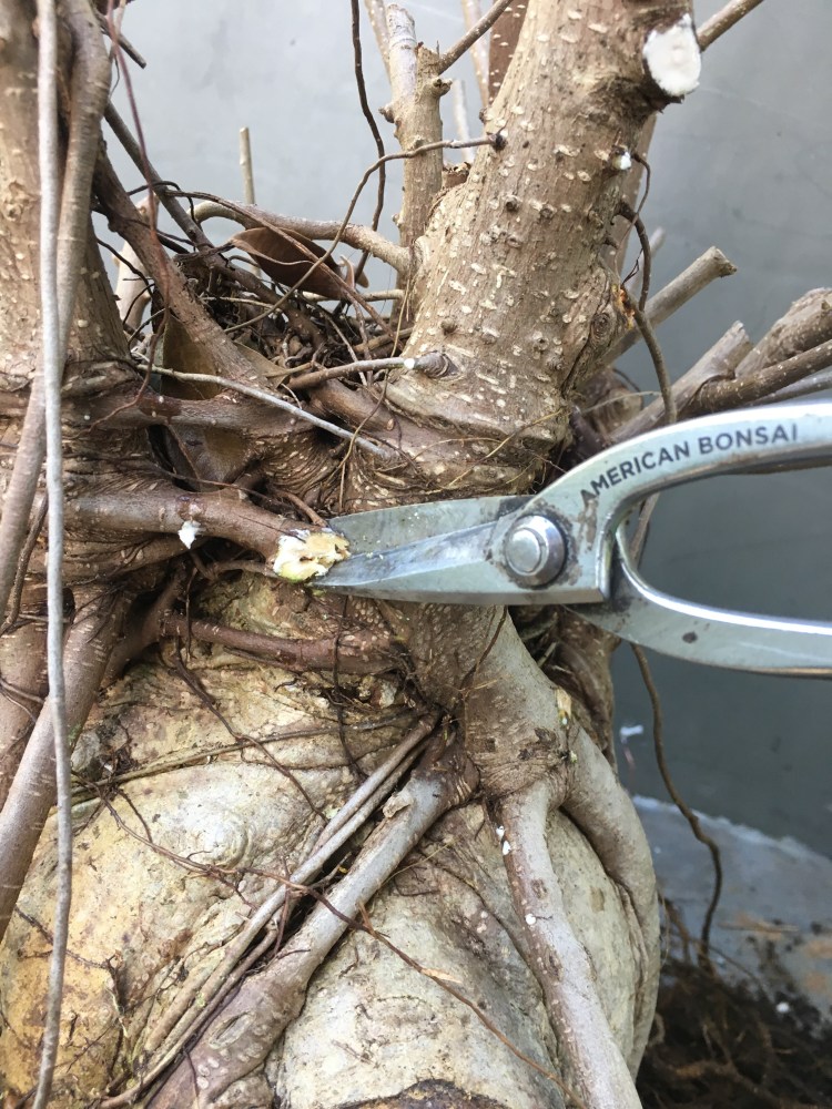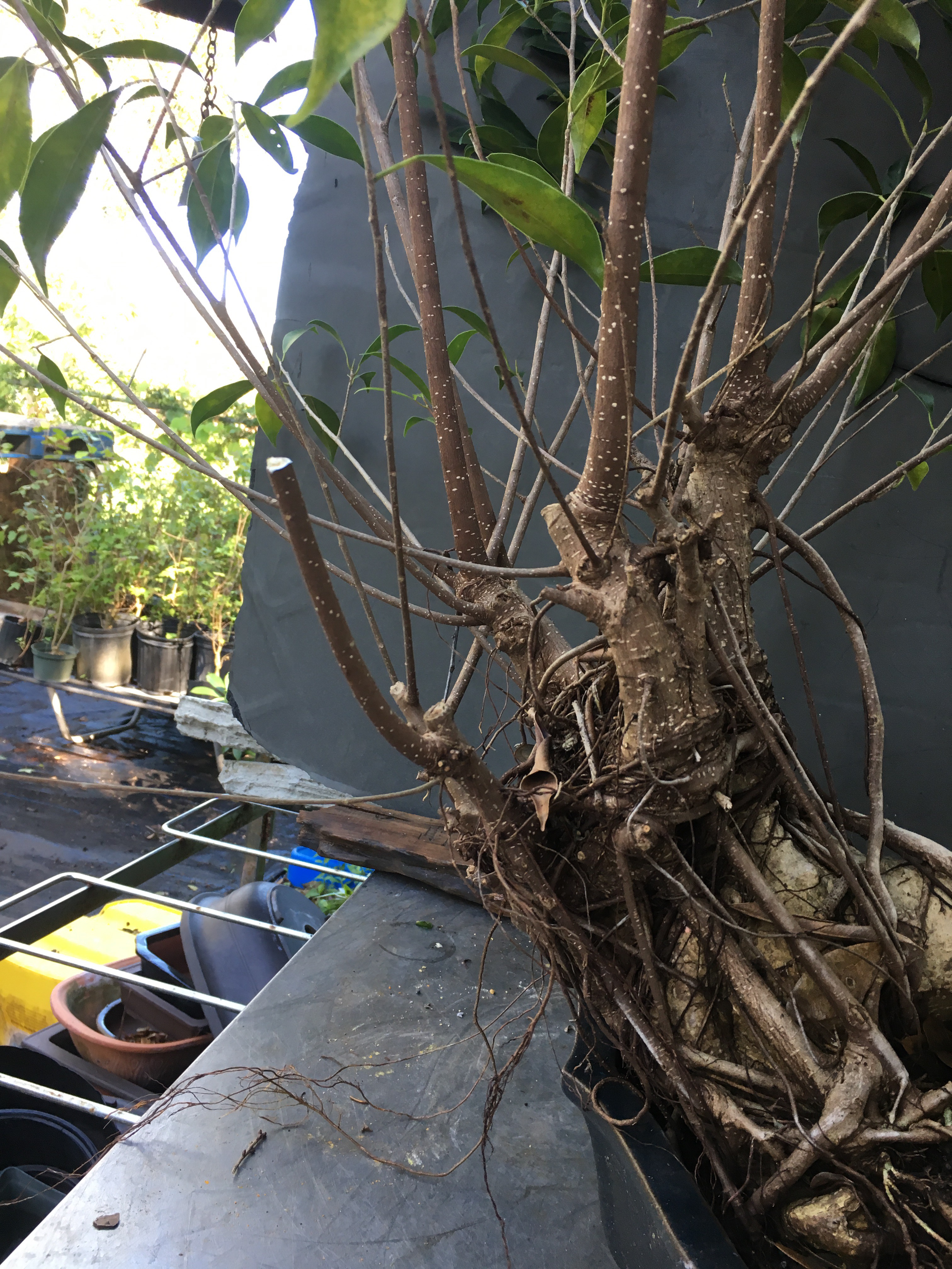 No, seriously. Even though a full grown ficus will have the various types of aerial roots (those that come down from the branches, those that parallel the trunk, and those that shoot off the trunk in a 45 degree angle, downward, from the trunk), it’s not considered “proper” for a bonsai to have them. Even though a bonsai is supposed to be a semi realistic representation of a tree, in miniature. And even though they look cool.