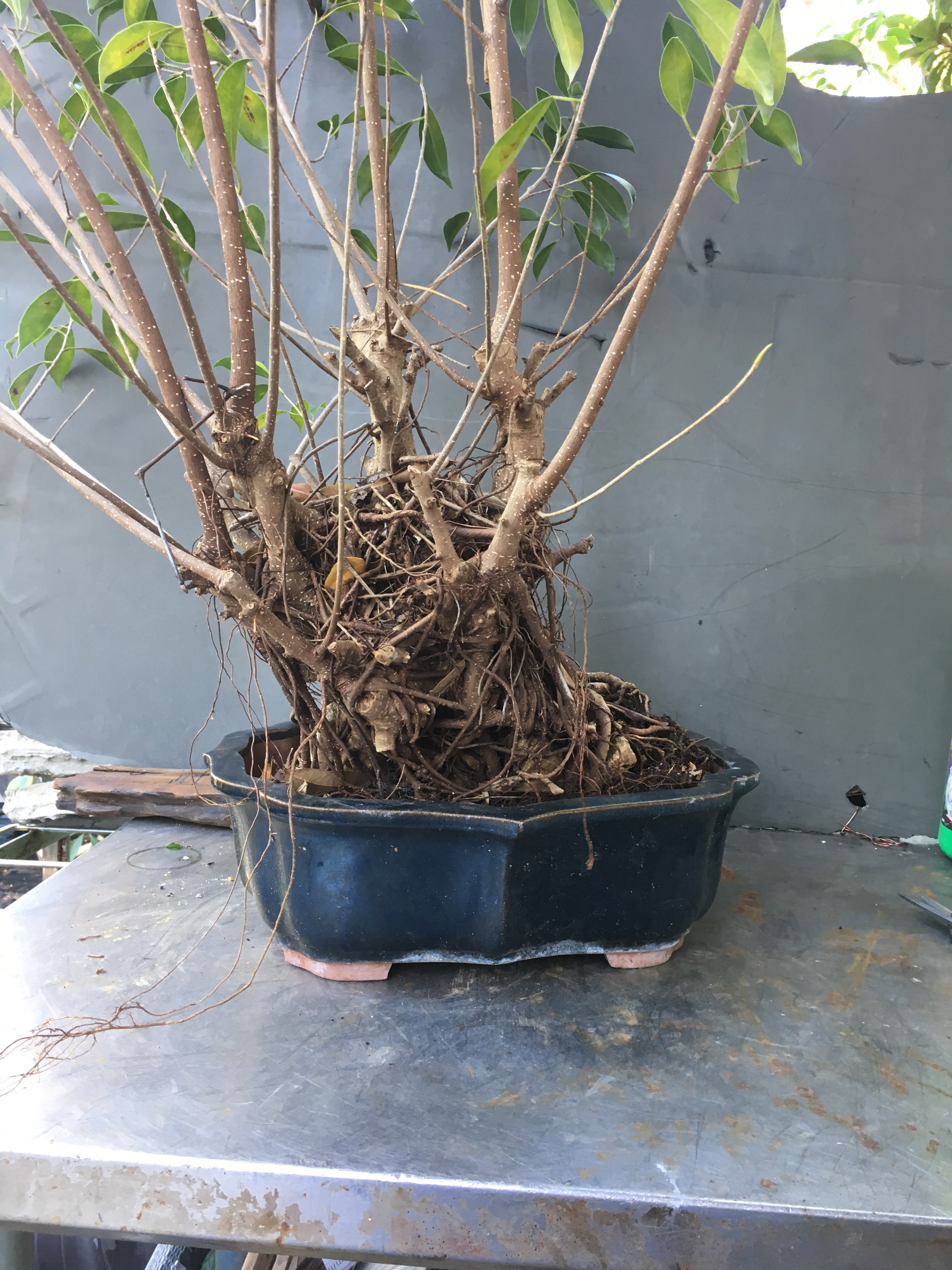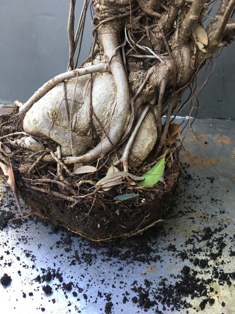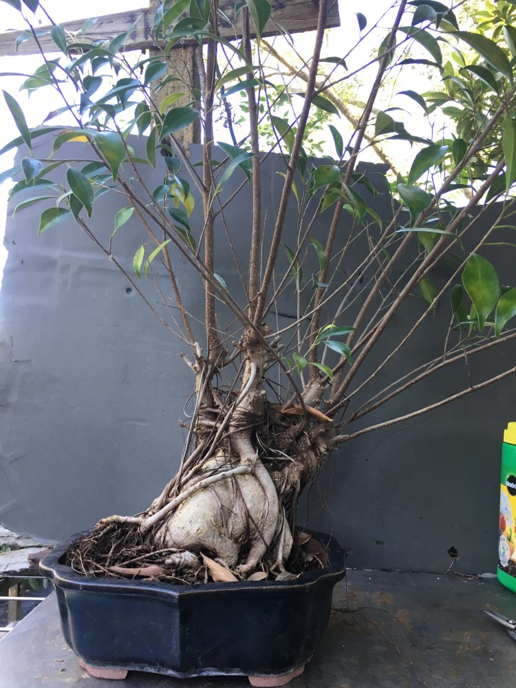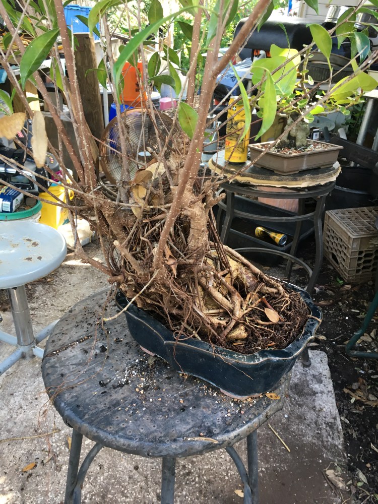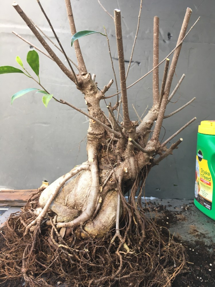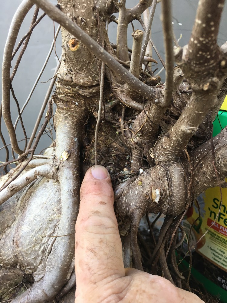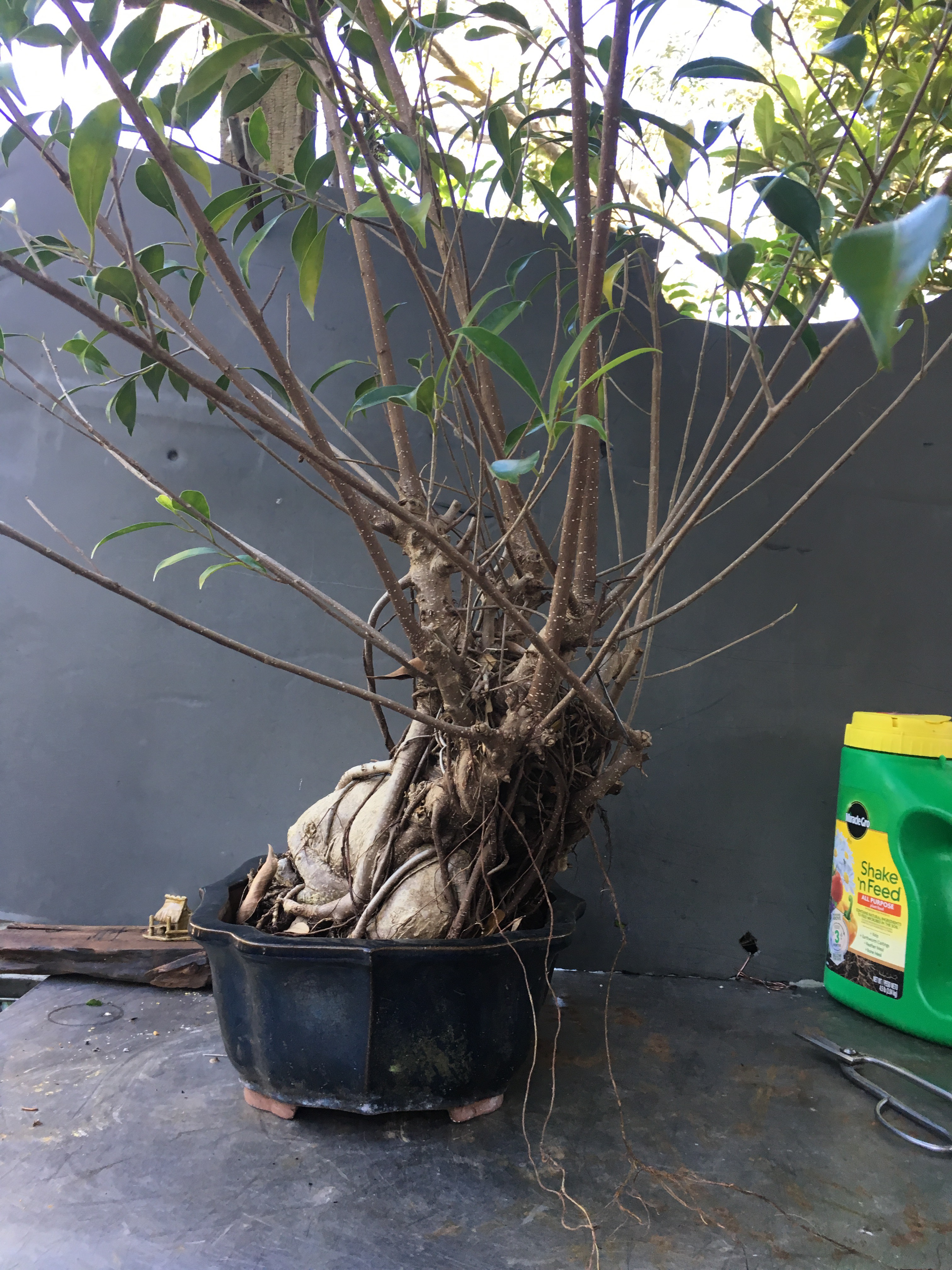 No, seriously. Even though a full grown ficus will have the various types of aerial roots (those that come down from the branches, those that parallel the trunk, and those that shoot off the trunk in a 45 degree angle, downward, from the trunk), it’s not considered “proper” for a bonsai to have them. Even though a bonsai is supposed to be a semi realistic representation of a tree, in miniature. And even though they look cool.
