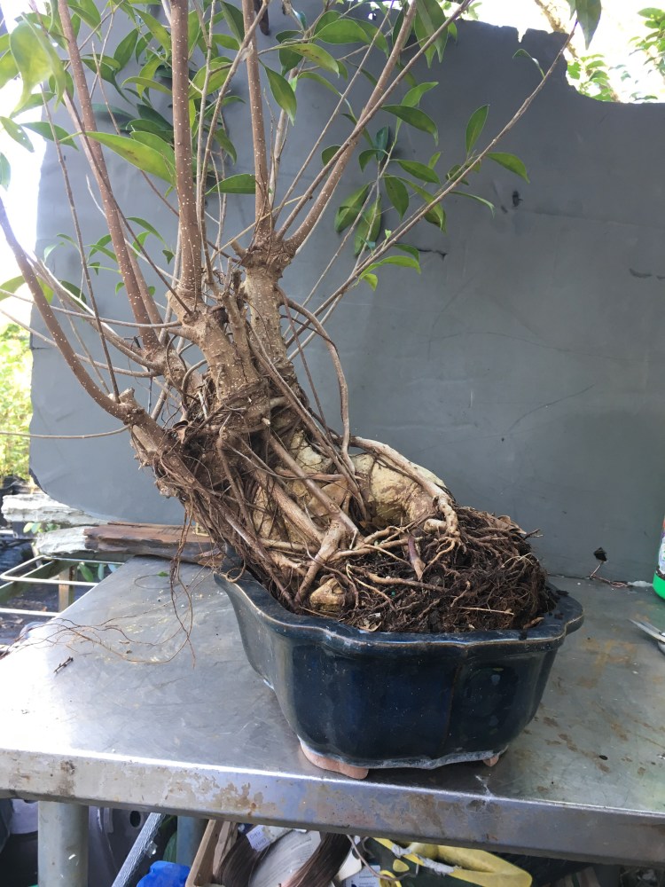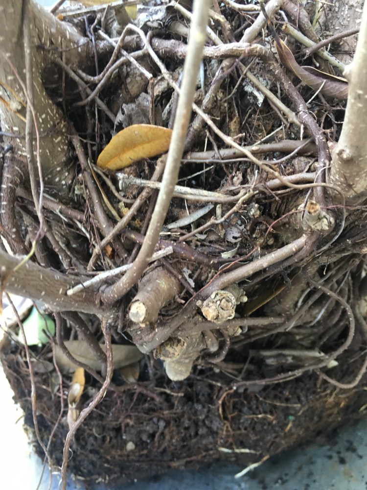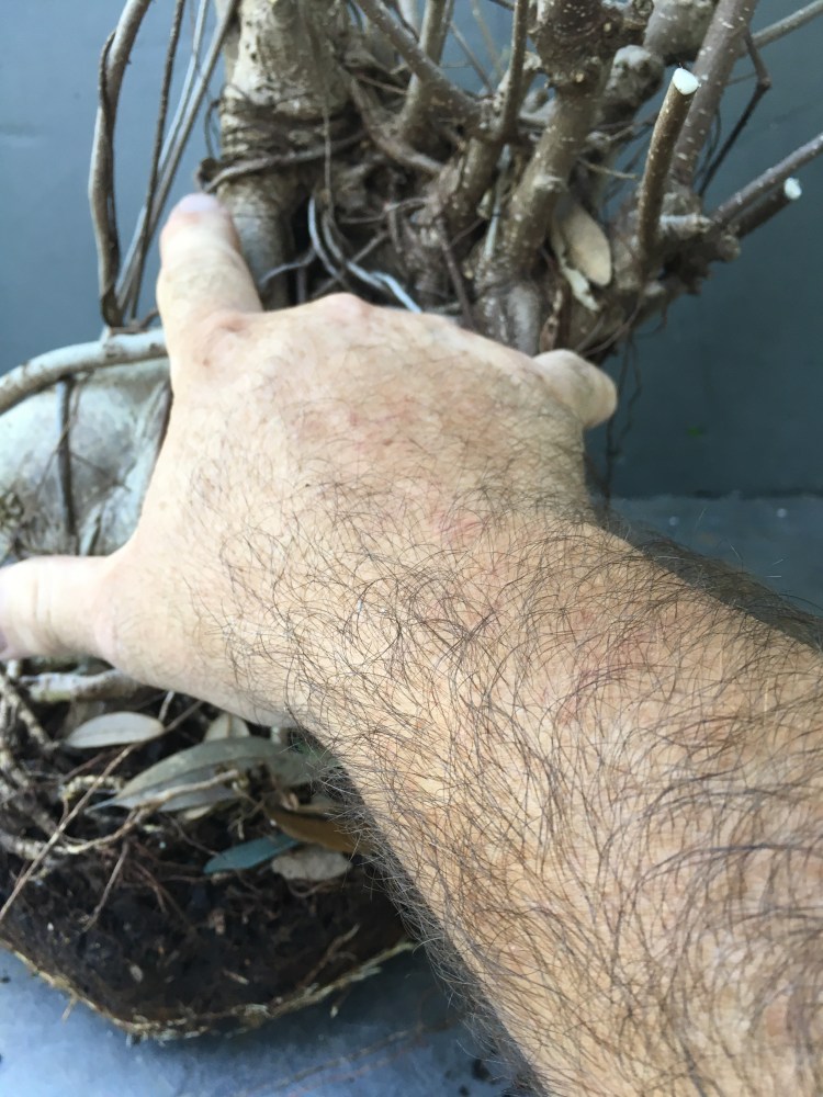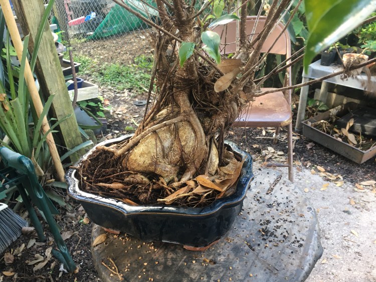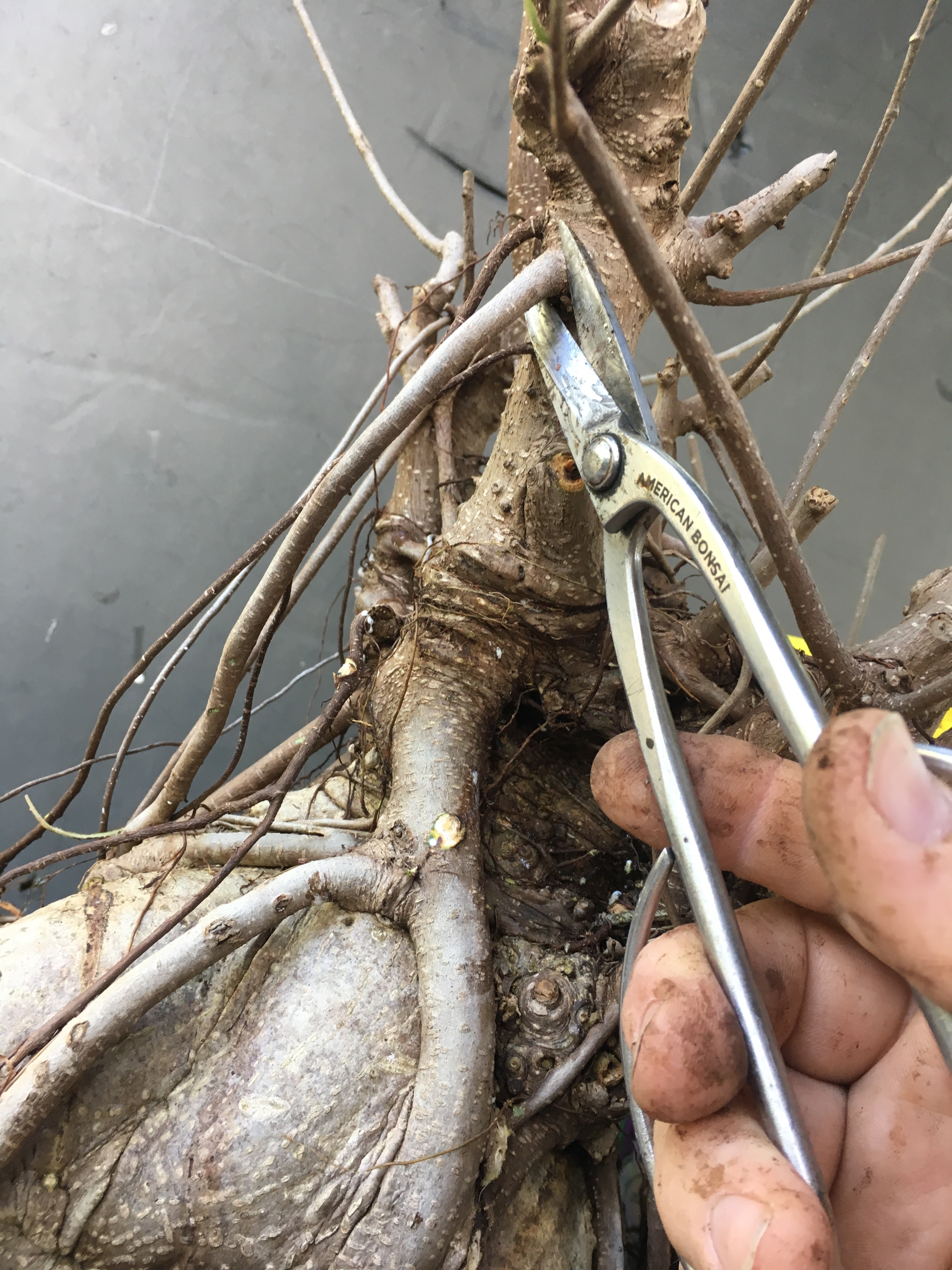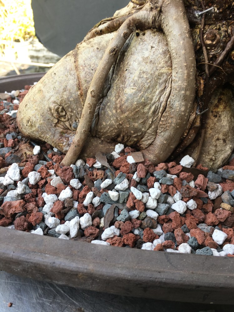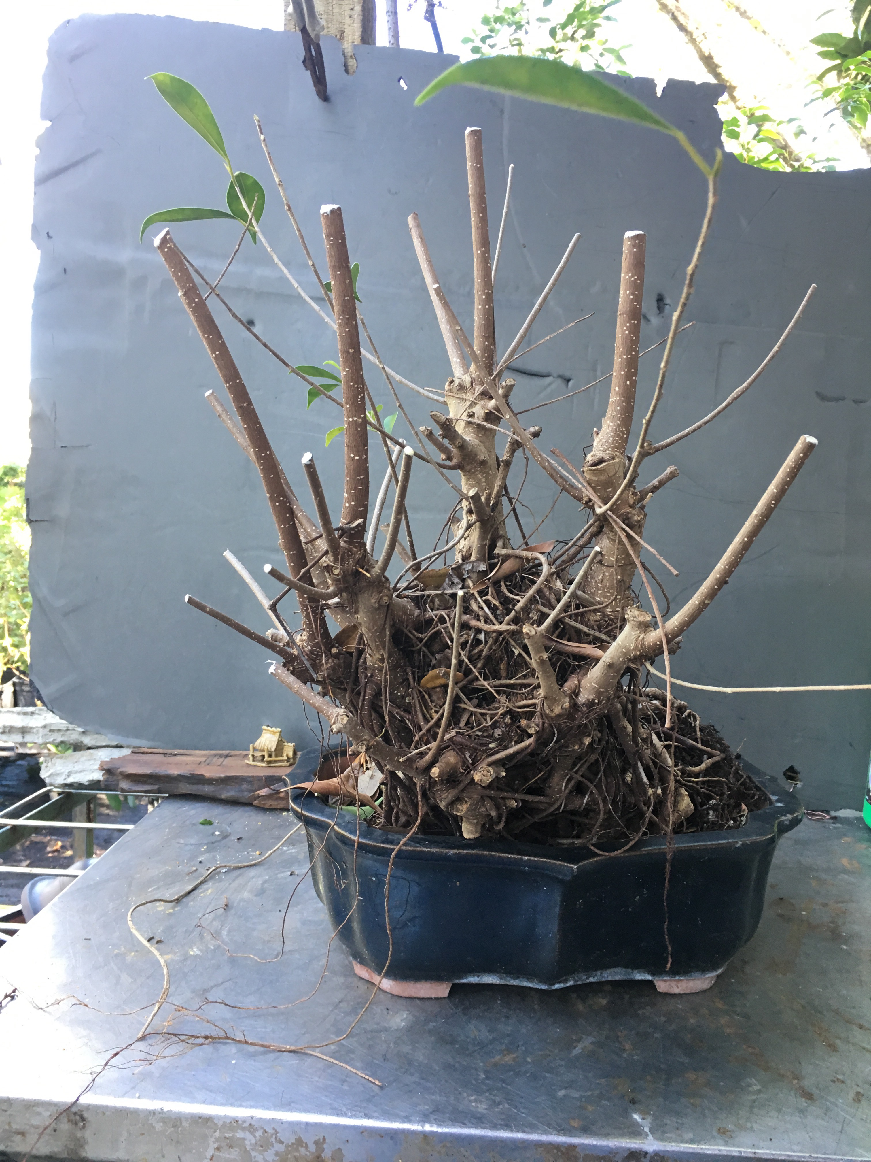 No, seriously. Even though a full grown ficus will have the various types of aerial roots (those that come down from the branches, those that parallel the trunk, and those that shoot off the trunk in a 45 degree angle, downward, from the trunk), it’s not considered “proper” for a bonsai to have them. Even though a bonsai is supposed to be a semi realistic representation of a tree, in miniature. And even though they look cool.