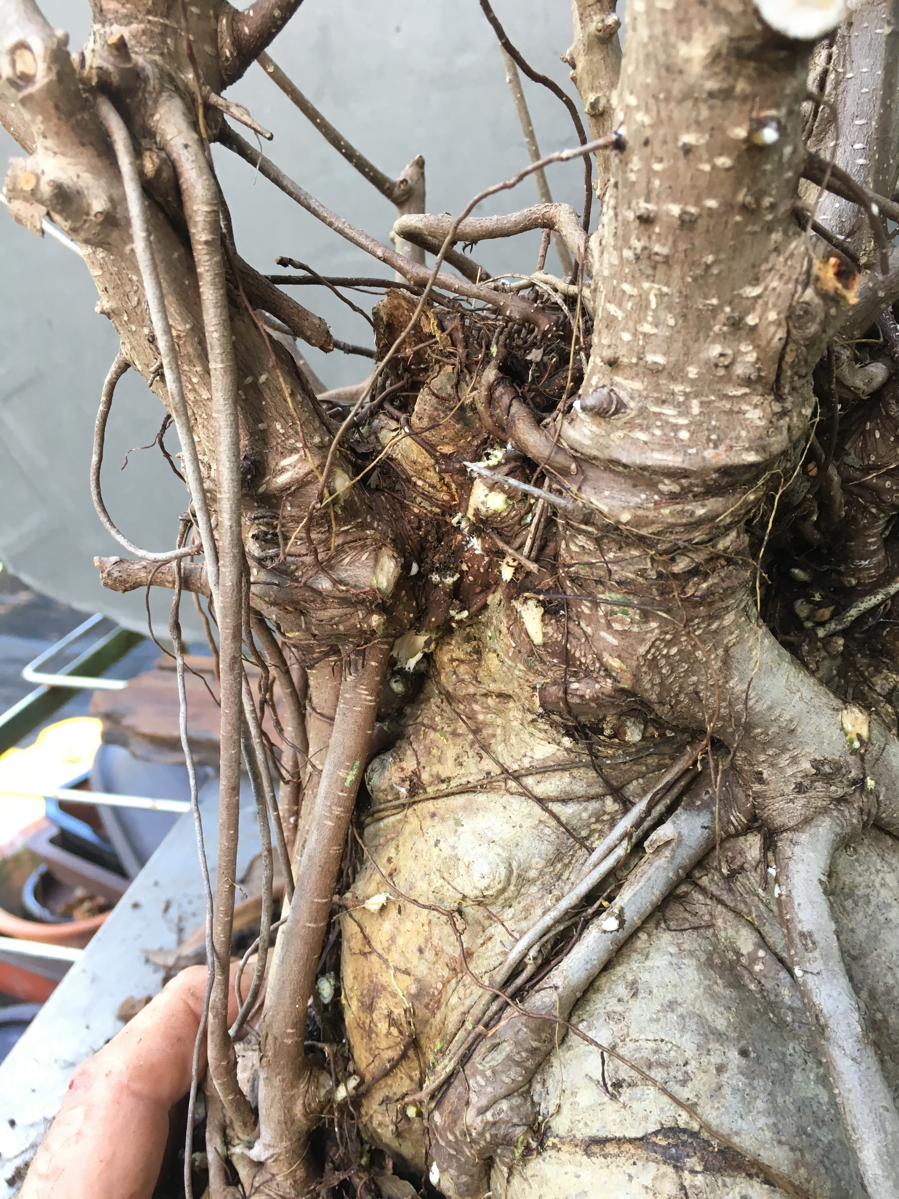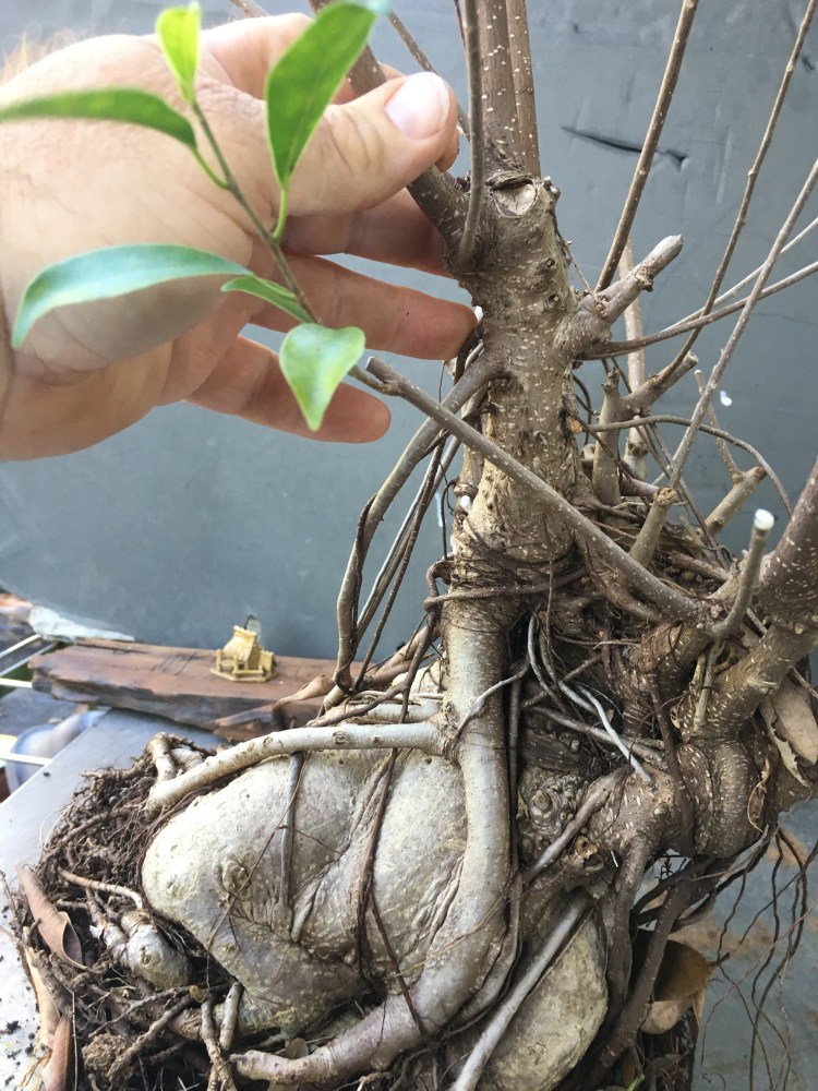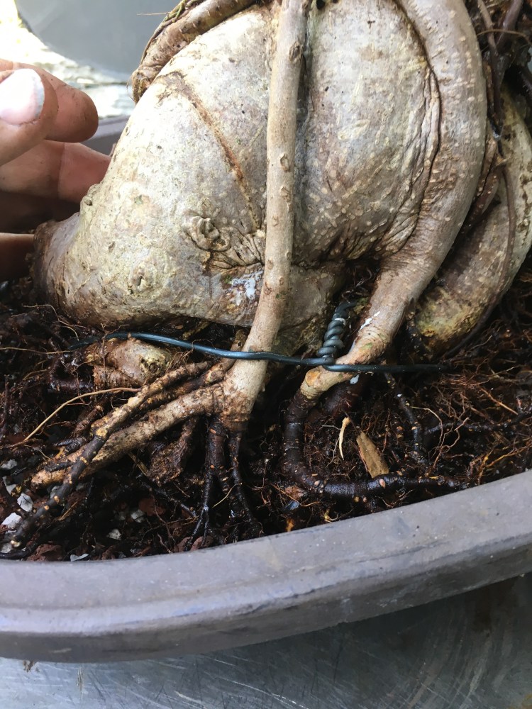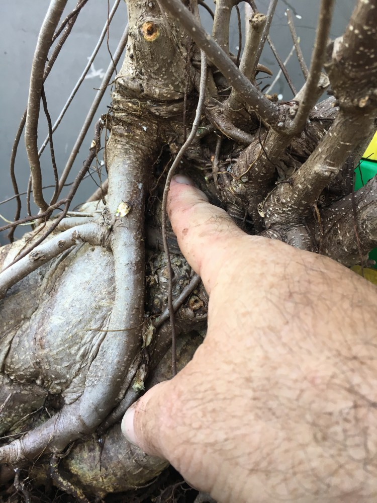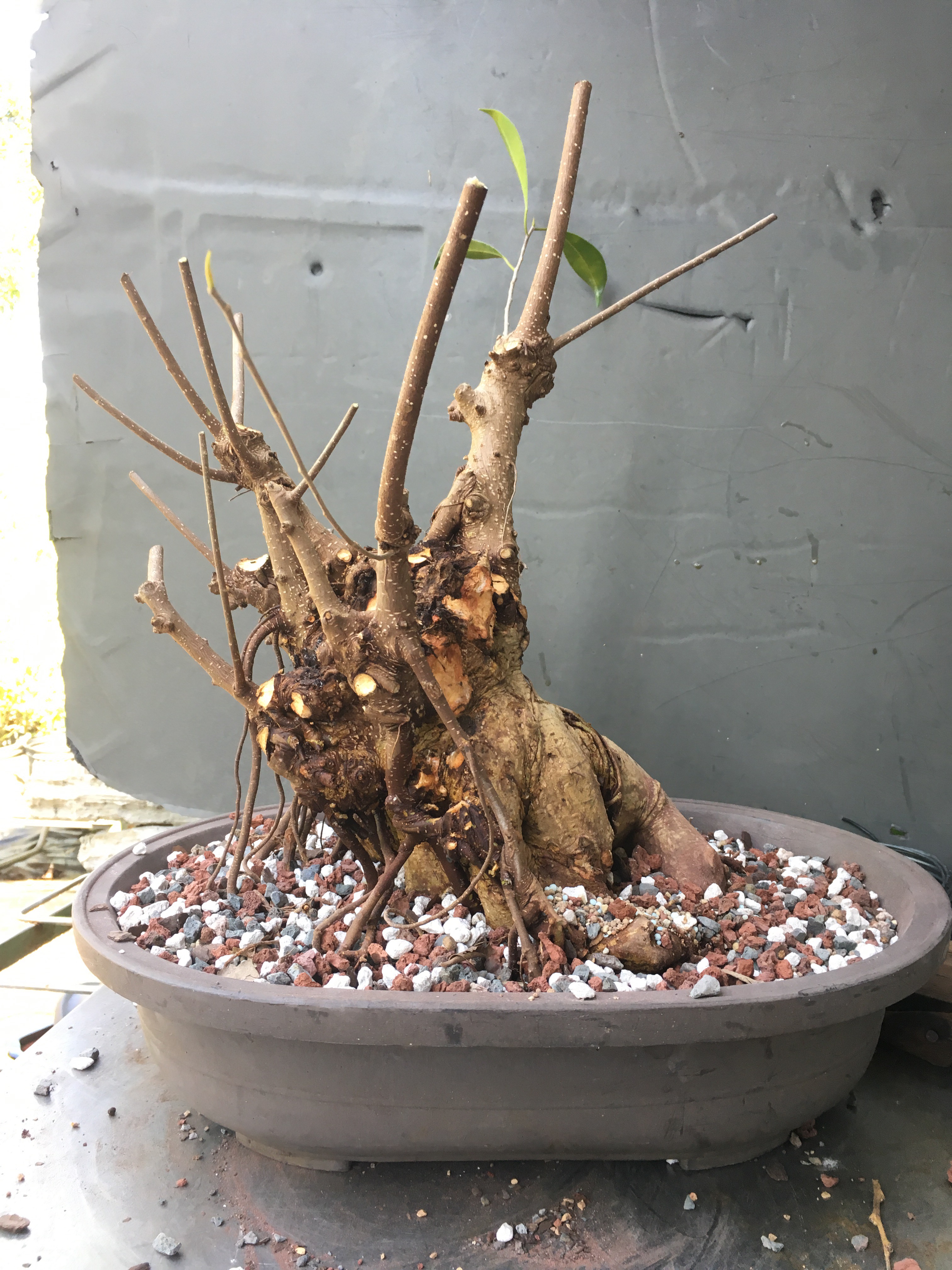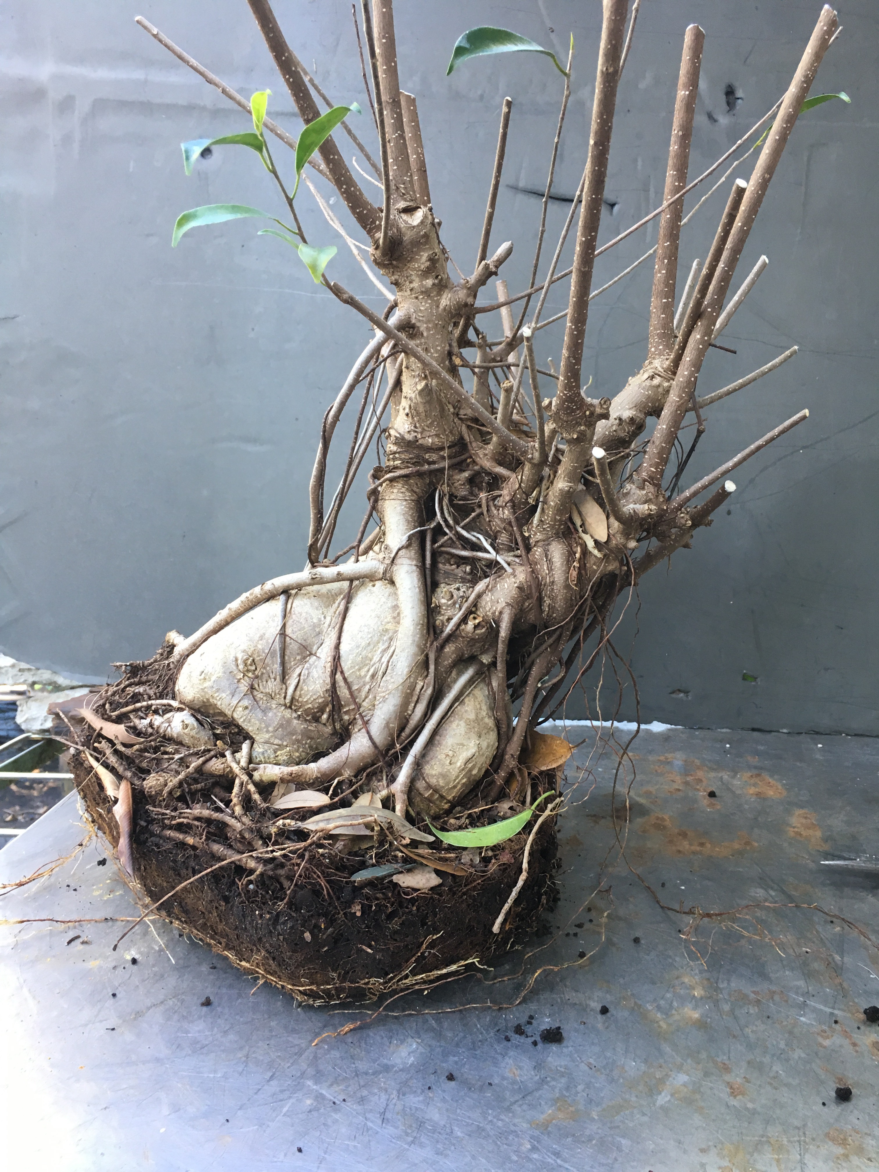 No, seriously. Even though a full grown ficus will have the various types of aerial roots (those that come down from the branches, those that parallel the trunk, and those that shoot off the trunk in a 45 degree angle, downward, from the trunk), it’s not considered “proper” for a bonsai to have them. Even though a bonsai is supposed to be a semi realistic representation of a tree, in miniature. And even though they look cool.