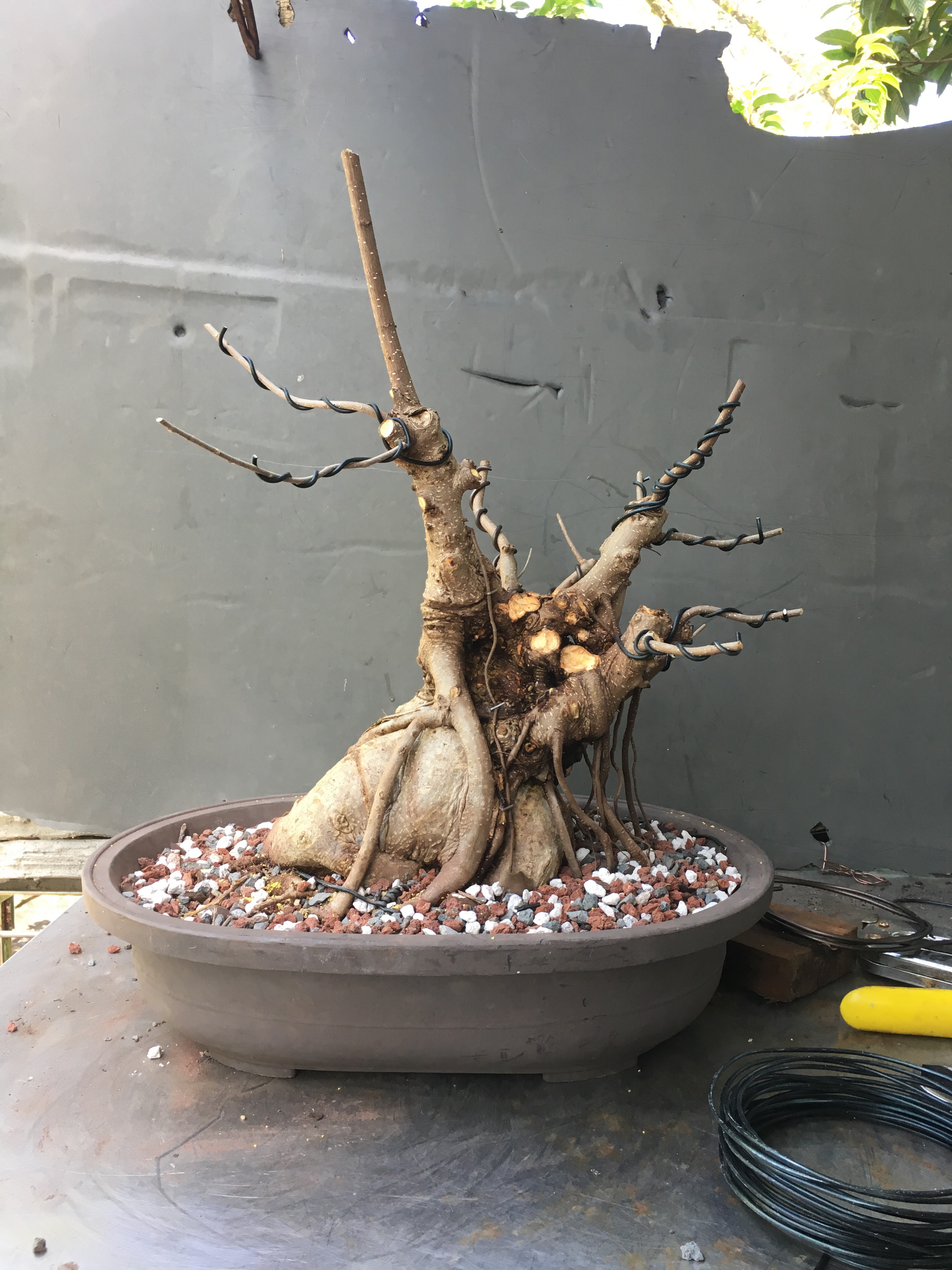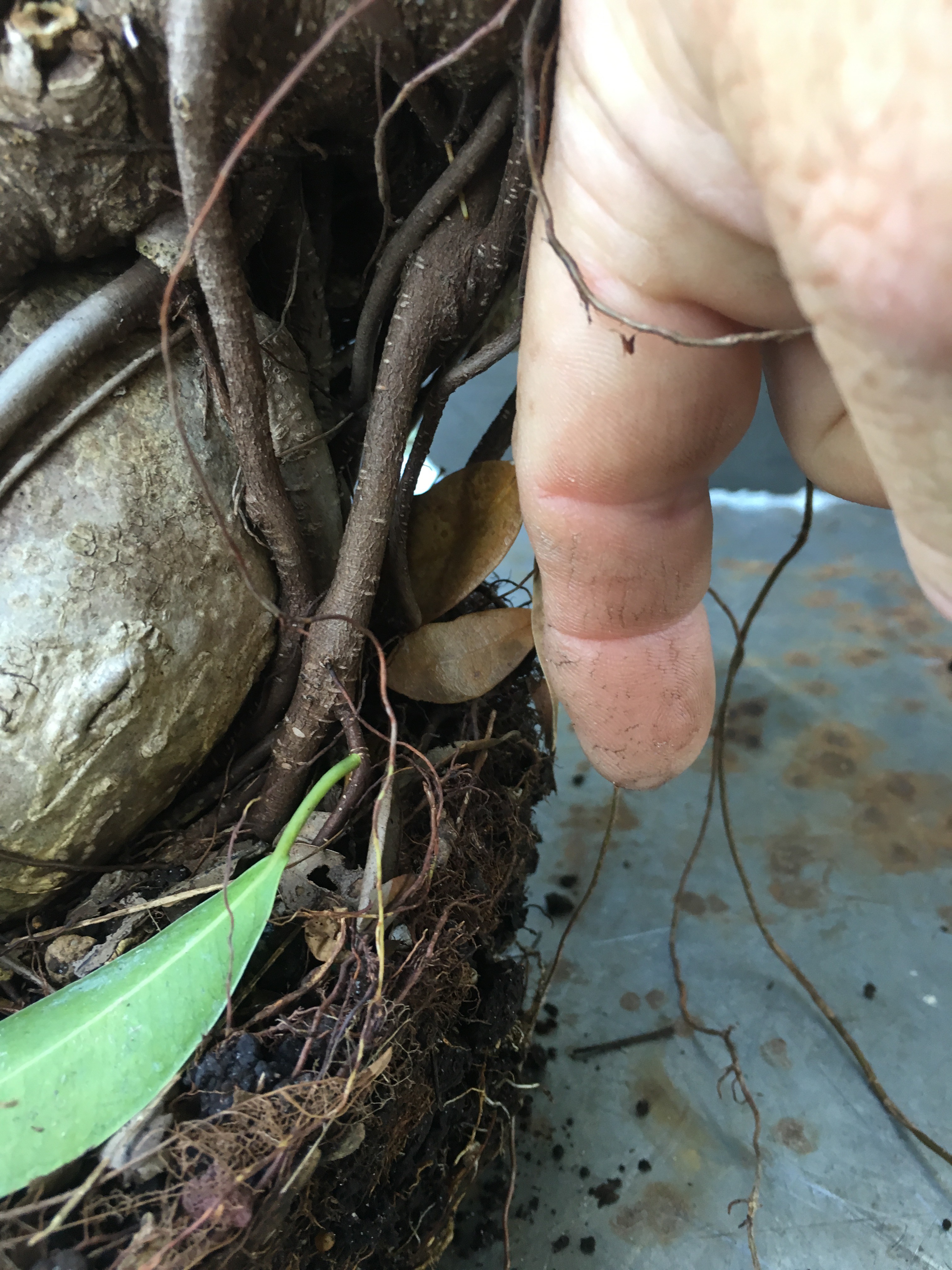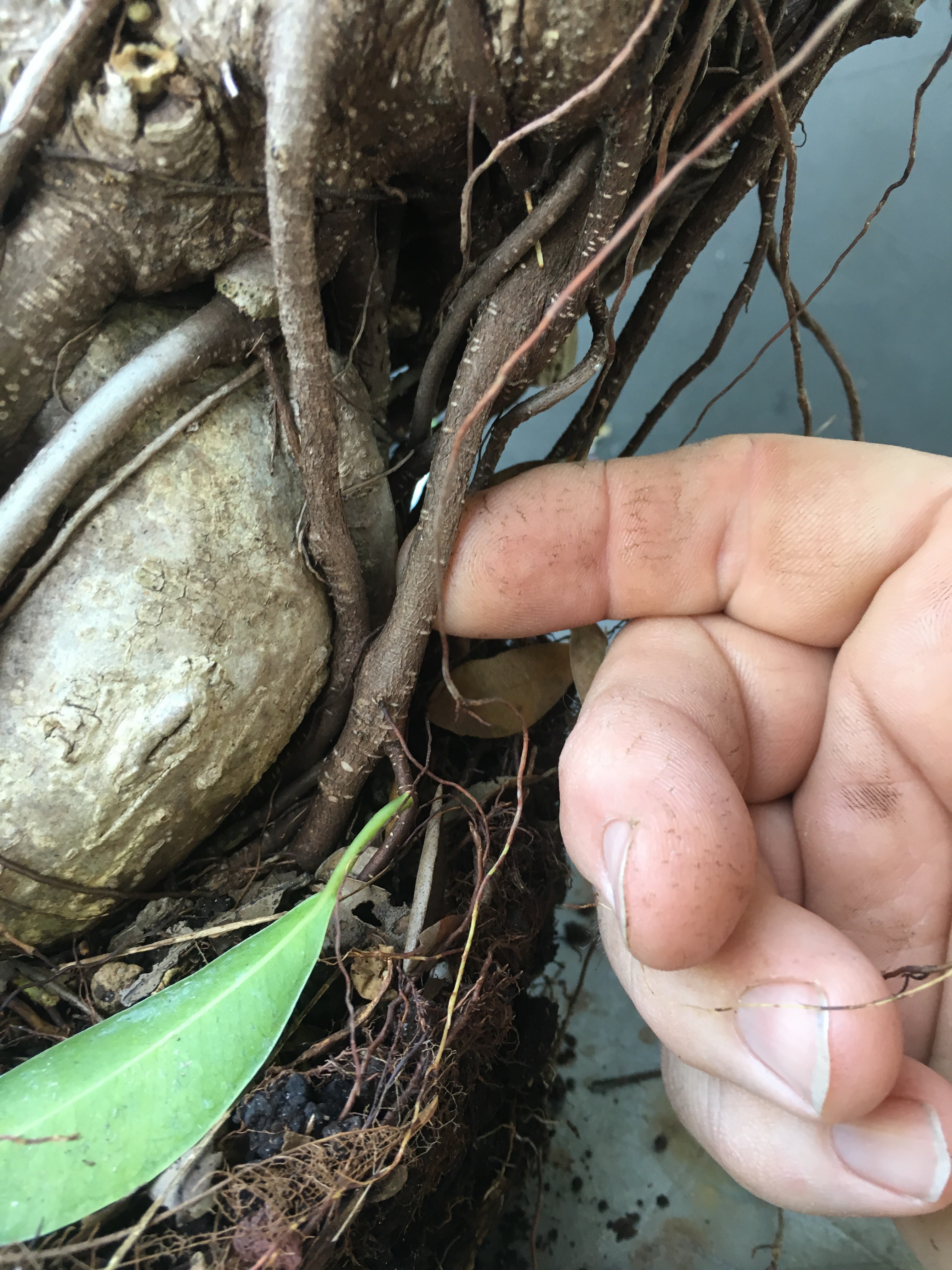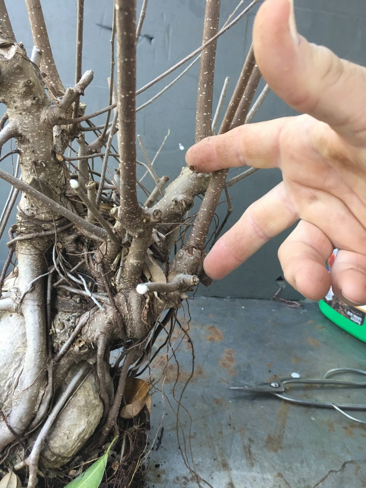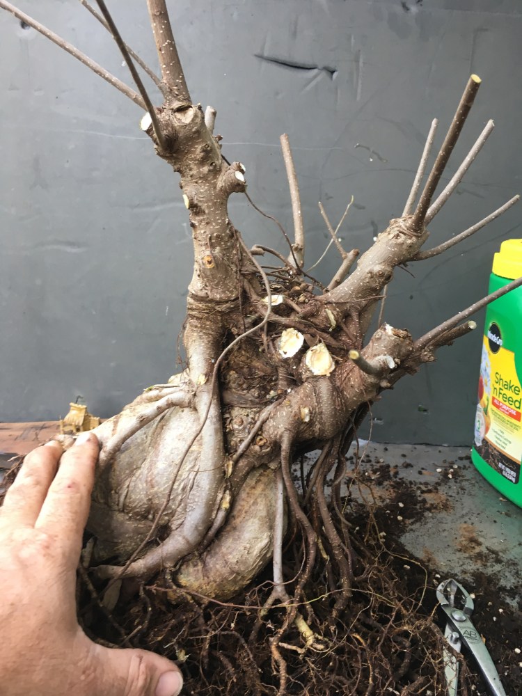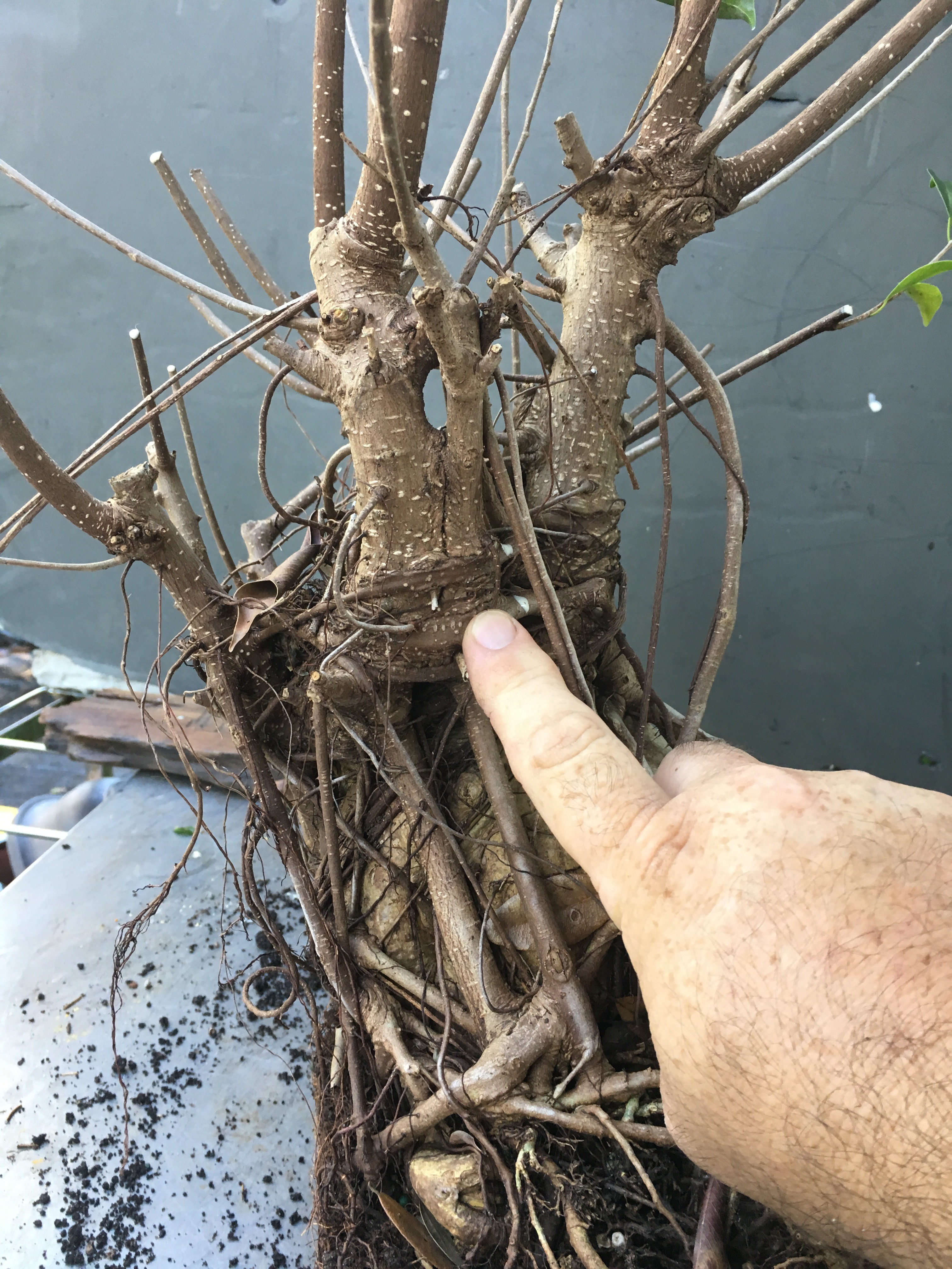 No, seriously. Even though a full grown ficus will have the various types of aerial roots (those that come down from the branches, those that parallel the trunk, and those that shoot off the trunk in a 45 degree angle, downward, from the trunk), it’s not considered “proper” for a bonsai to have them. Even though a bonsai is supposed to be a semi realistic representation of a tree, in miniature. And even though they look cool.