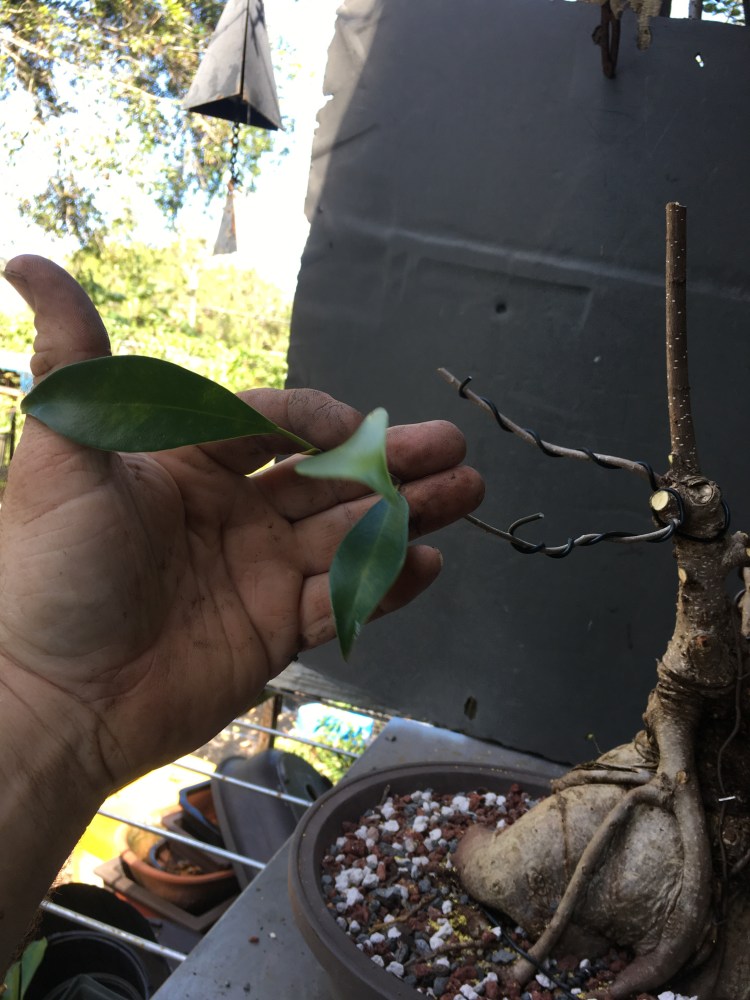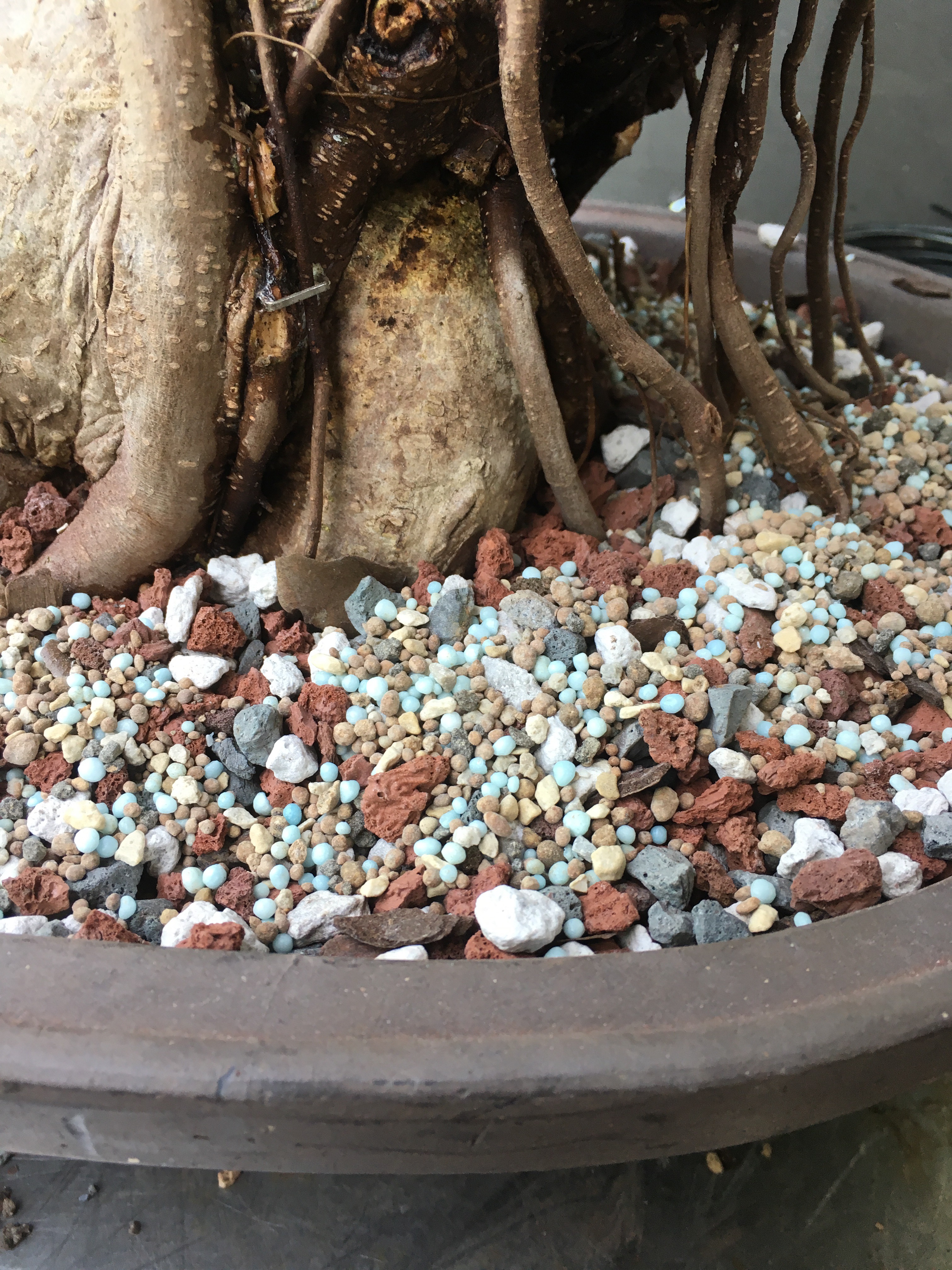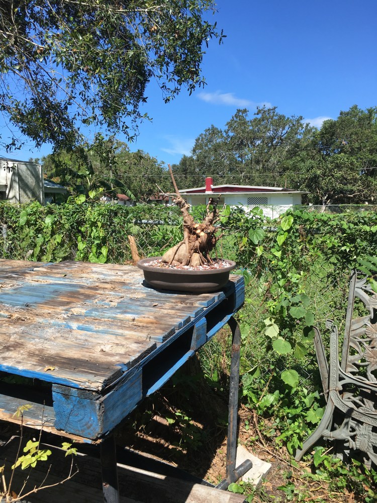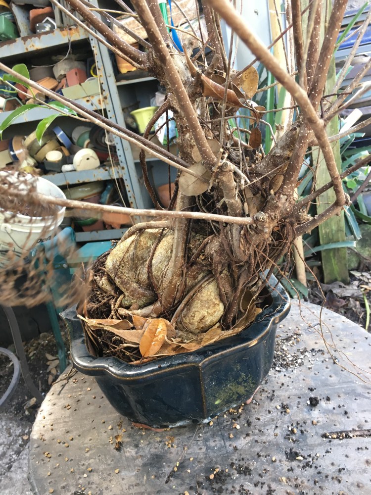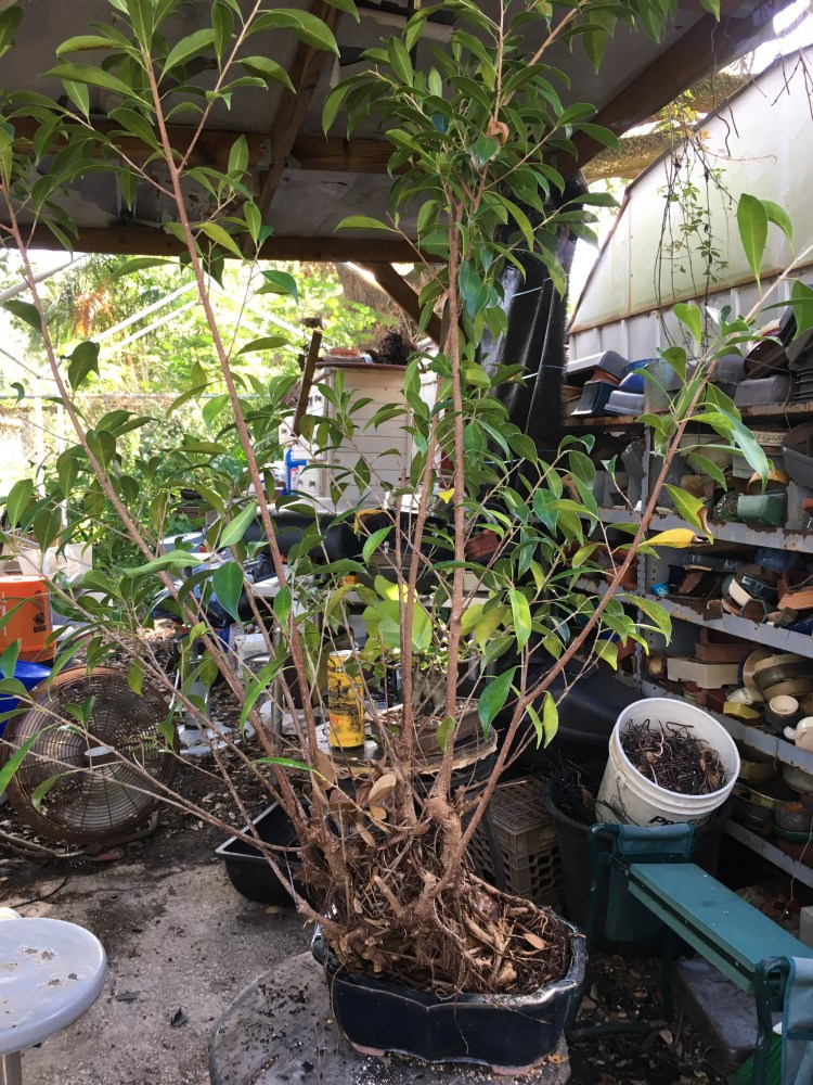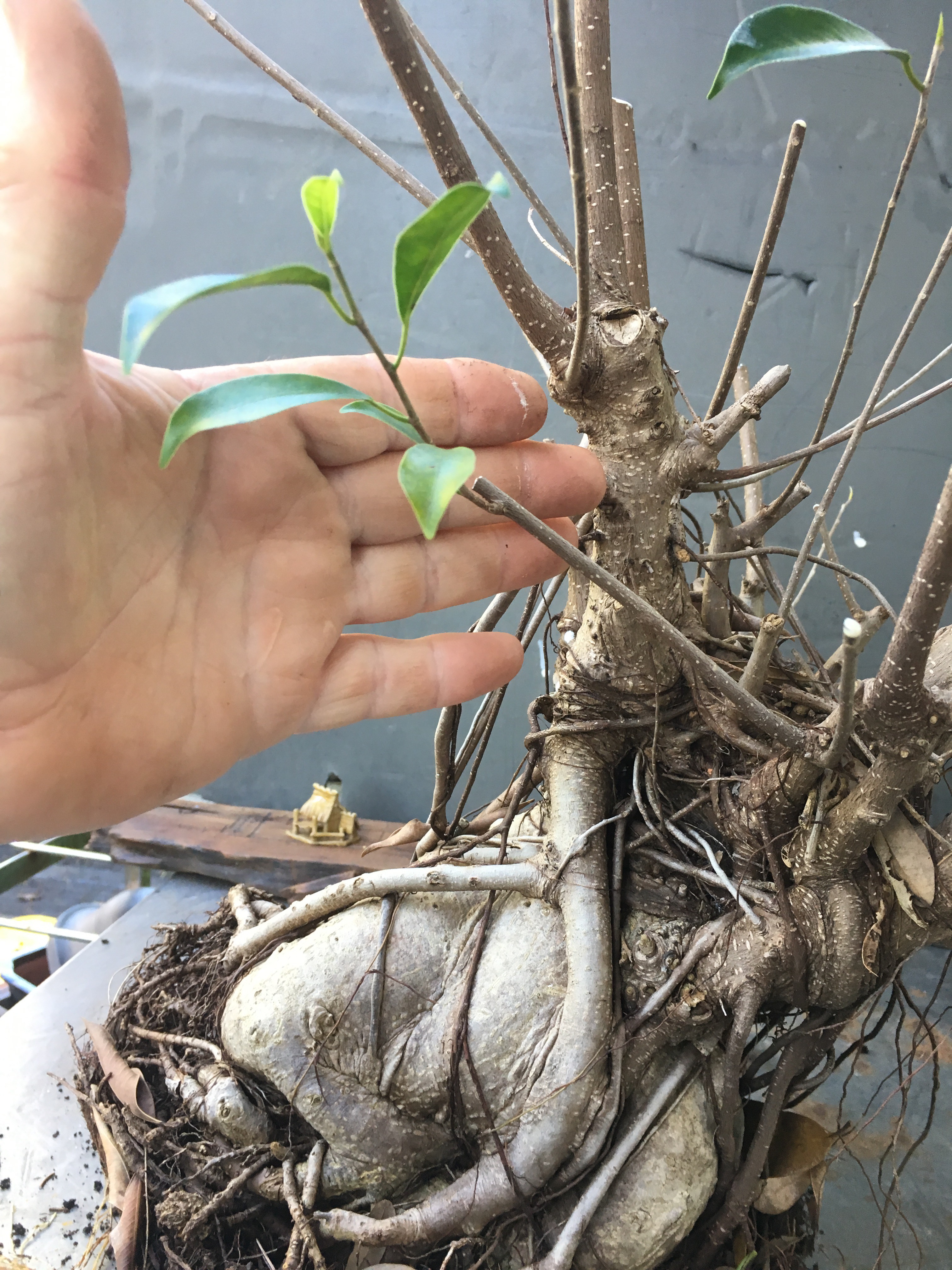 No, seriously. Even though a full grown ficus will have the various types of aerial roots (those that come down from the branches, those that parallel the trunk, and those that shoot off the trunk in a 45 degree angle, downward, from the trunk), it’s not considered “proper” for a bonsai to have them. Even though a bonsai is supposed to be a semi realistic representation of a tree, in miniature. And even though they look cool.