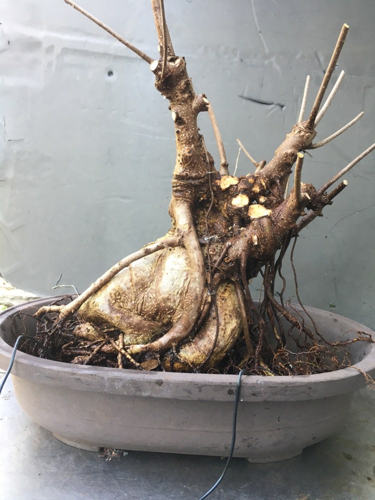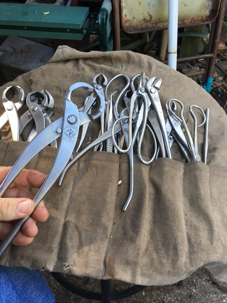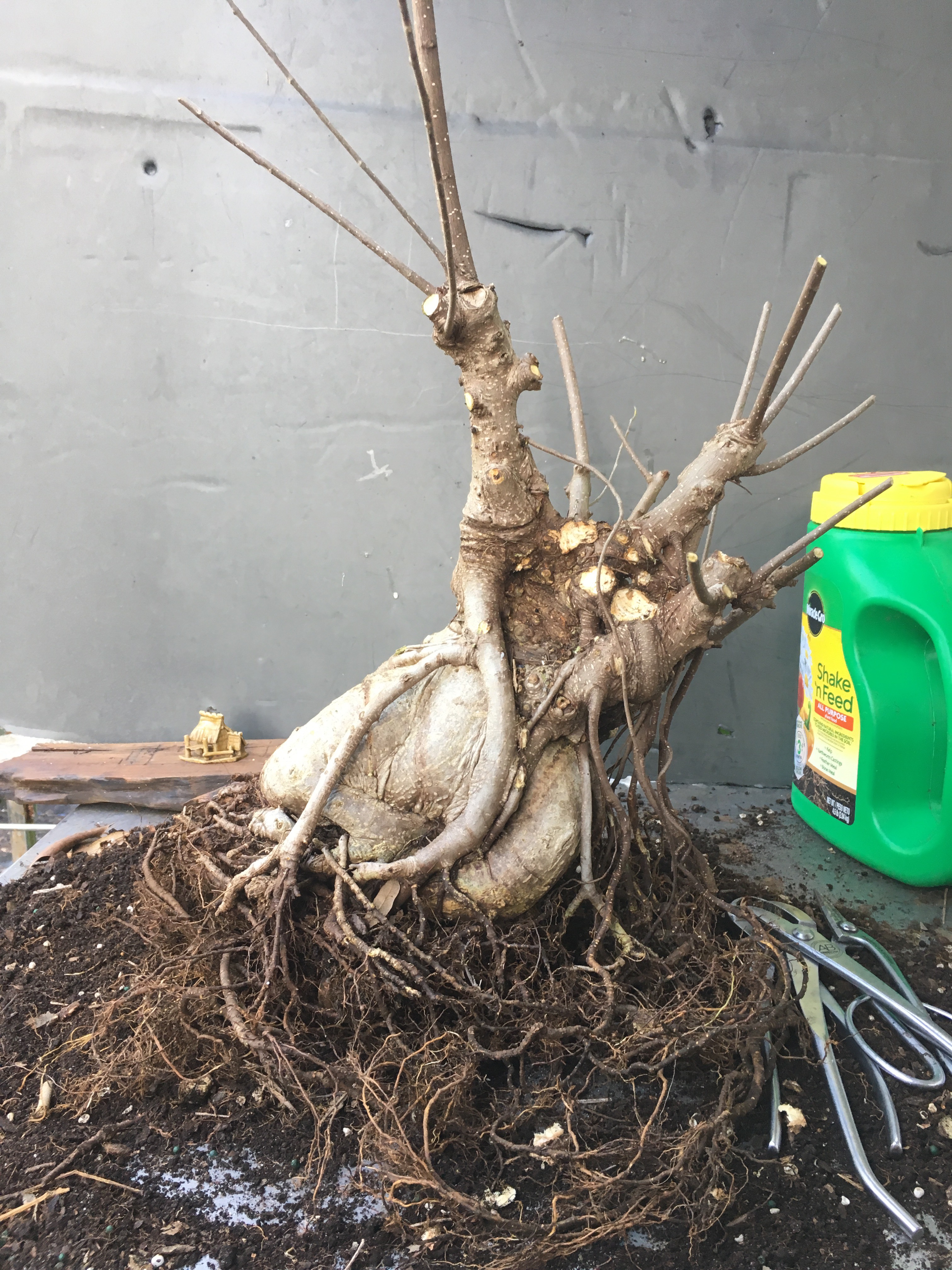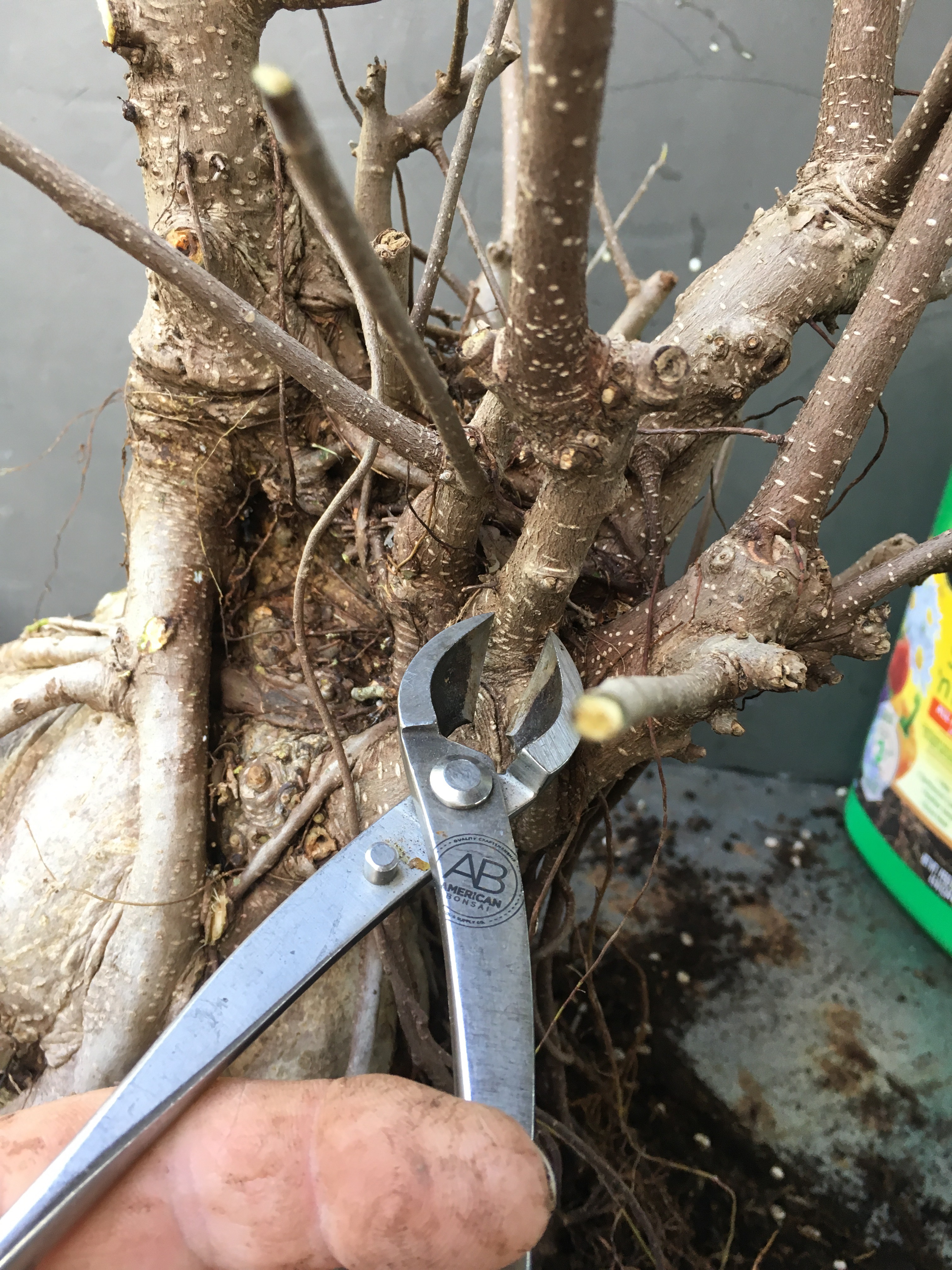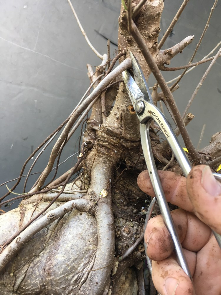 Let me explain the idea of a front, for those that don’t know. First, even though a bonsai is a three dimensional art, you’ll hear most seasoned bonsai people talk about “The Front” all the time as though that’s the one and only true vision for viewing a tree. They are kind of, mostly, right, as many of the design principles and tricks for making a small tree look big work best when viewed from one angle. And often the pruning scars or evidence of certain growing techniques are hidden when viewed from that fixed angle. But the “front” tends to be a little more complex than that one chopstick stuck in the soil by the master du jour at your local clubs byot workshop. In my view, the front is about a 45 degree angle, starting from one corner and continuing to the other. As though, amazingly, you are walking past it and you begin looking at the tree as you approach it. Now, what does that mean when selecting the front? It means it’s your job to have something interesting, a focal point or a certain feature, like the root base or a hollow trunk or Jin, anything that will arrest that dude walking by your tree, in that 45 degree arc of sight. The idea is to have your tree, your art, be looked at, talked about, praised or criticized (I usually go for criticism “what was he thinking of? Putting that on his tree!”). Anywho, let’s get back to our “pot of spaghetti”. Gotta get out the full set of tools for this job….