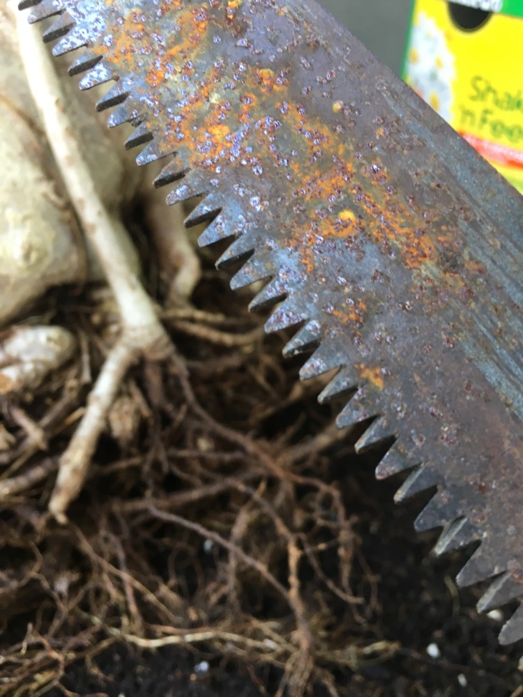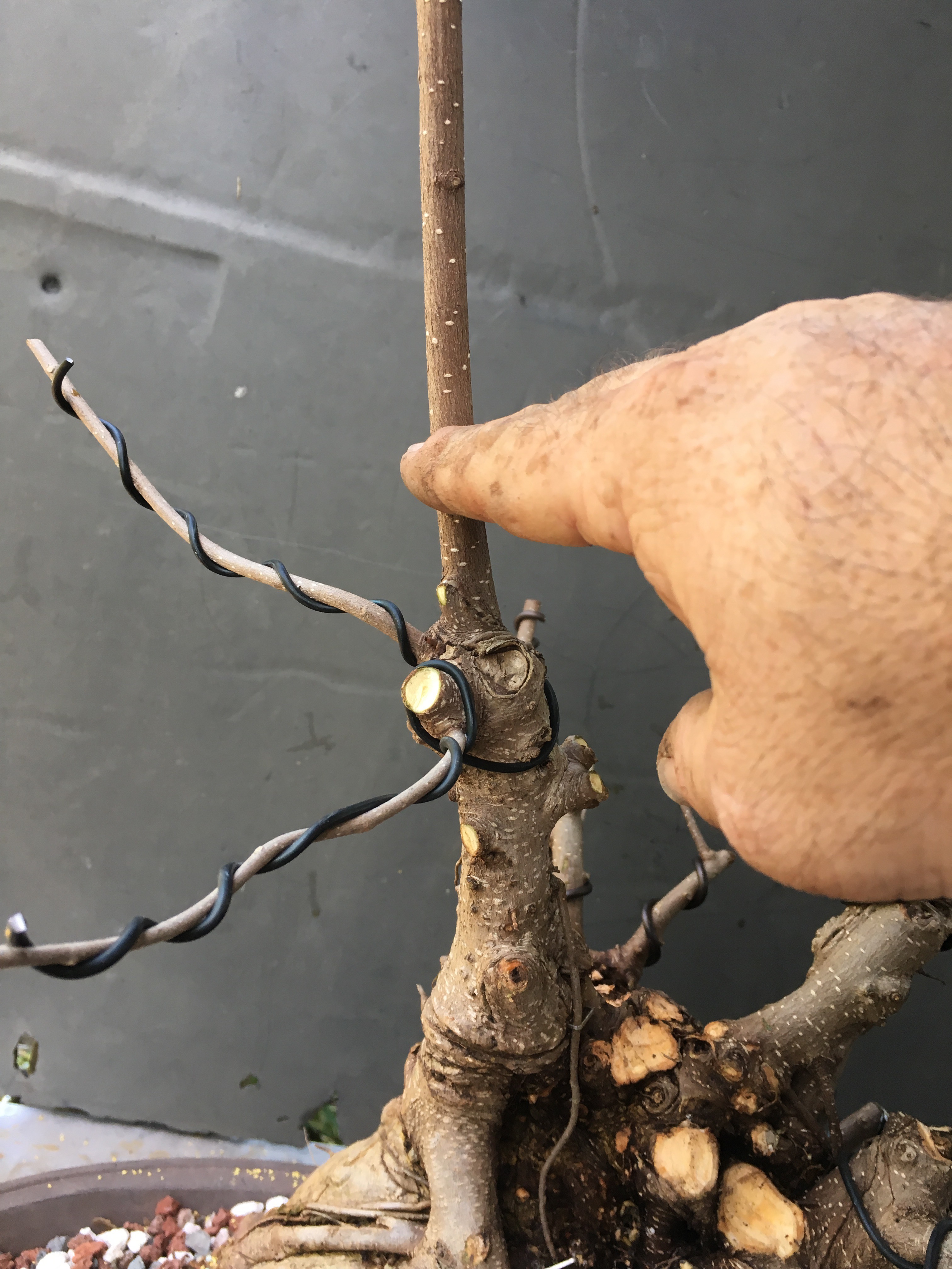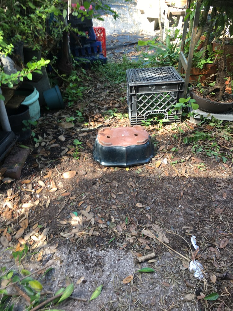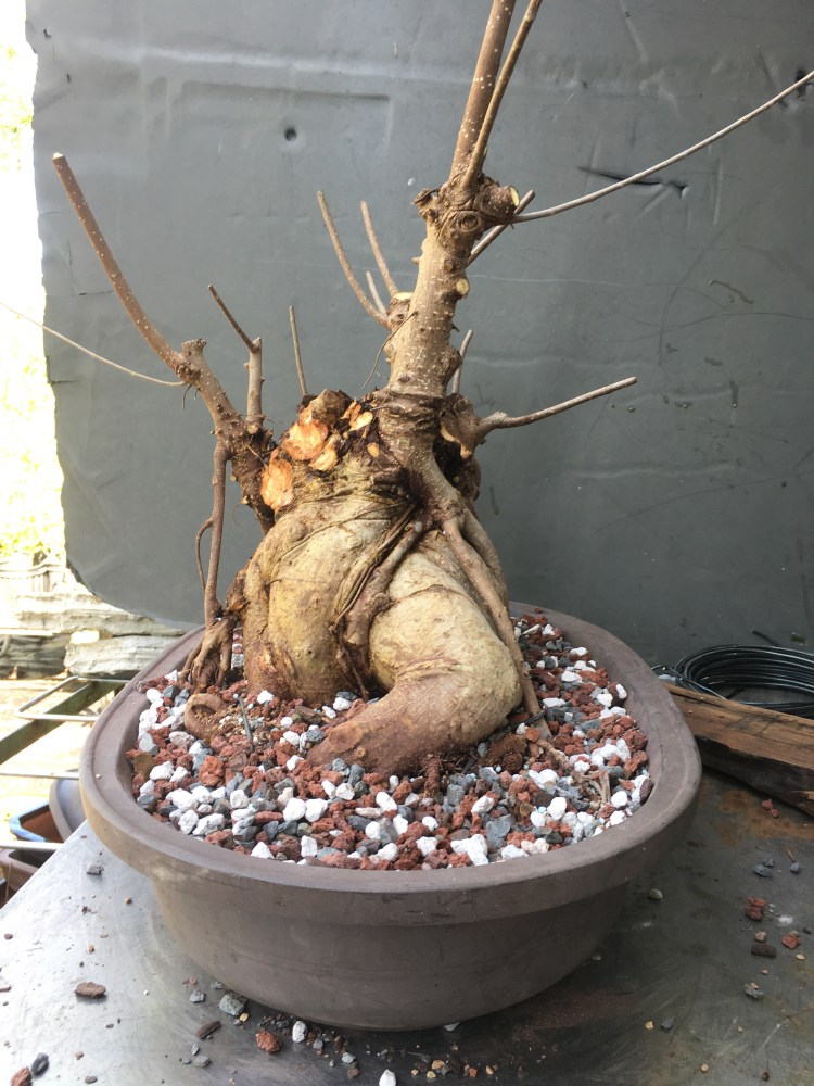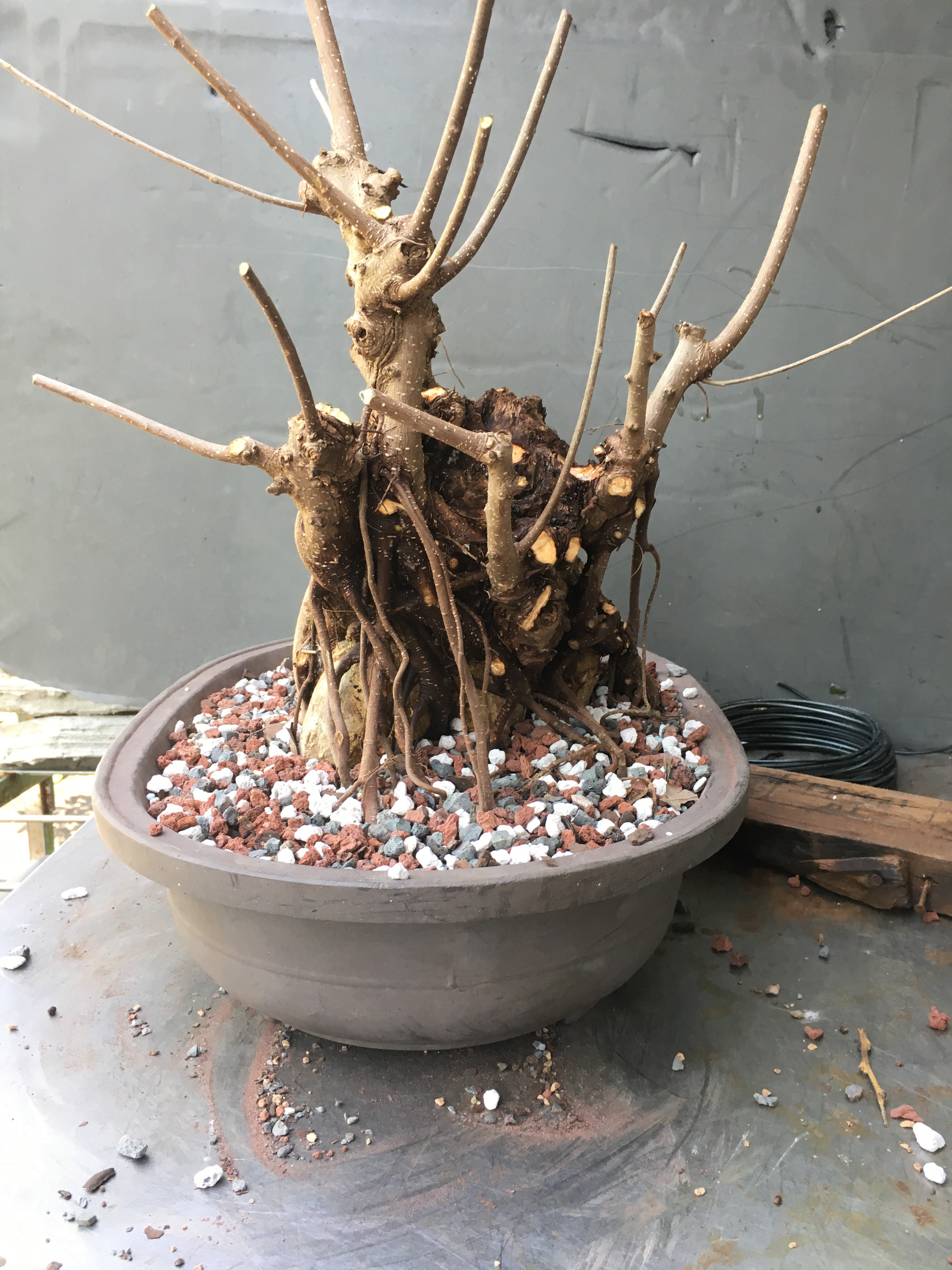 Let me explain the idea of a front, for those that don’t know. First, even though a bonsai is a three dimensional art, you’ll hear most seasoned bonsai people talk about “The Front” all the time as though that’s the one and only true vision for viewing a tree. They are kind of, mostly, right, as many of the design principles and tricks for making a small tree look big work best when viewed from one angle. And often the pruning scars or evidence of certain growing techniques are hidden when viewed from that fixed angle. But the “front” tends to be a little more complex than that one chopstick stuck in the soil by the master du jour at your local clubs byot workshop. In my view, the front is about a 45 degree angle, starting from one corner and continuing to the other. As though, amazingly, you are walking past it and you begin looking at the tree as you approach it. Now, what does that mean when selecting the front? It means it’s your job to have something interesting, a focal point or a certain feature, like the root base or a hollow trunk or Jin, anything that will arrest that dude walking by your tree, in that 45 degree arc of sight. The idea is to have your tree, your art, be looked at, talked about, praised or criticized (I usually go for criticism “what was he thinking of? Putting that on his tree!”). Anywho, let’s get back to our “pot of spaghetti”. Gotta get out the full set of tools for this job….