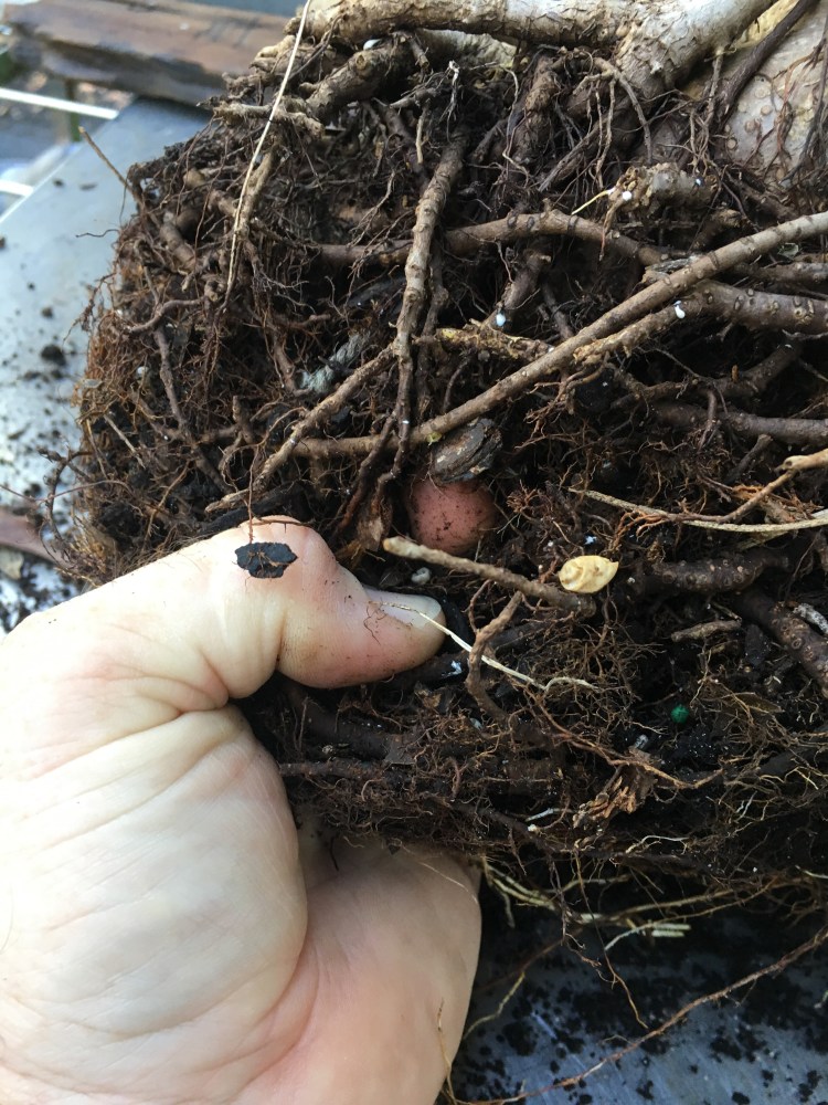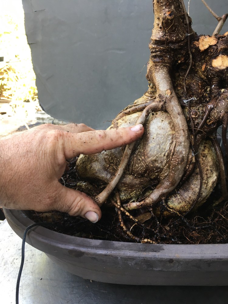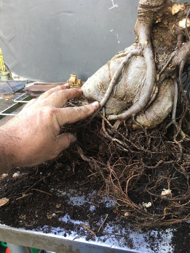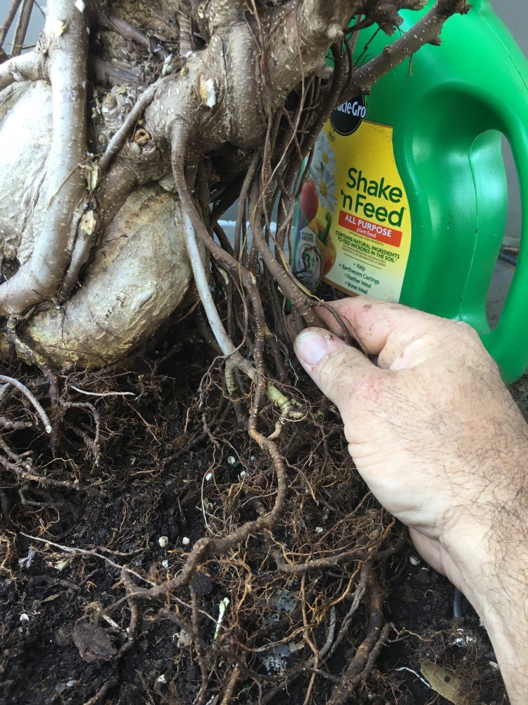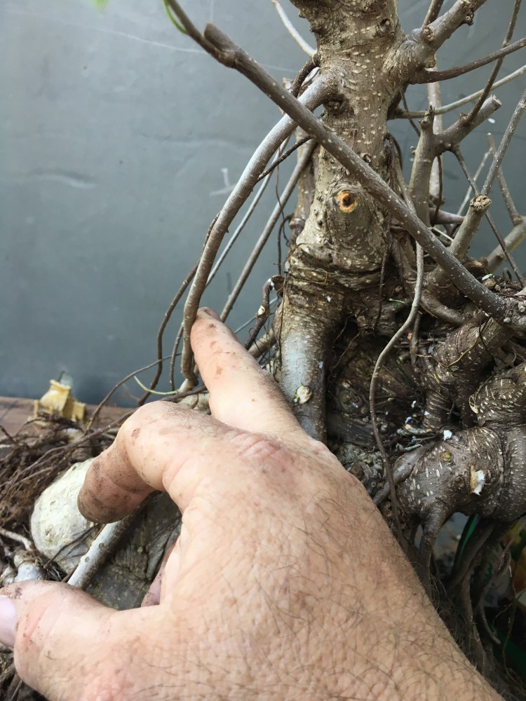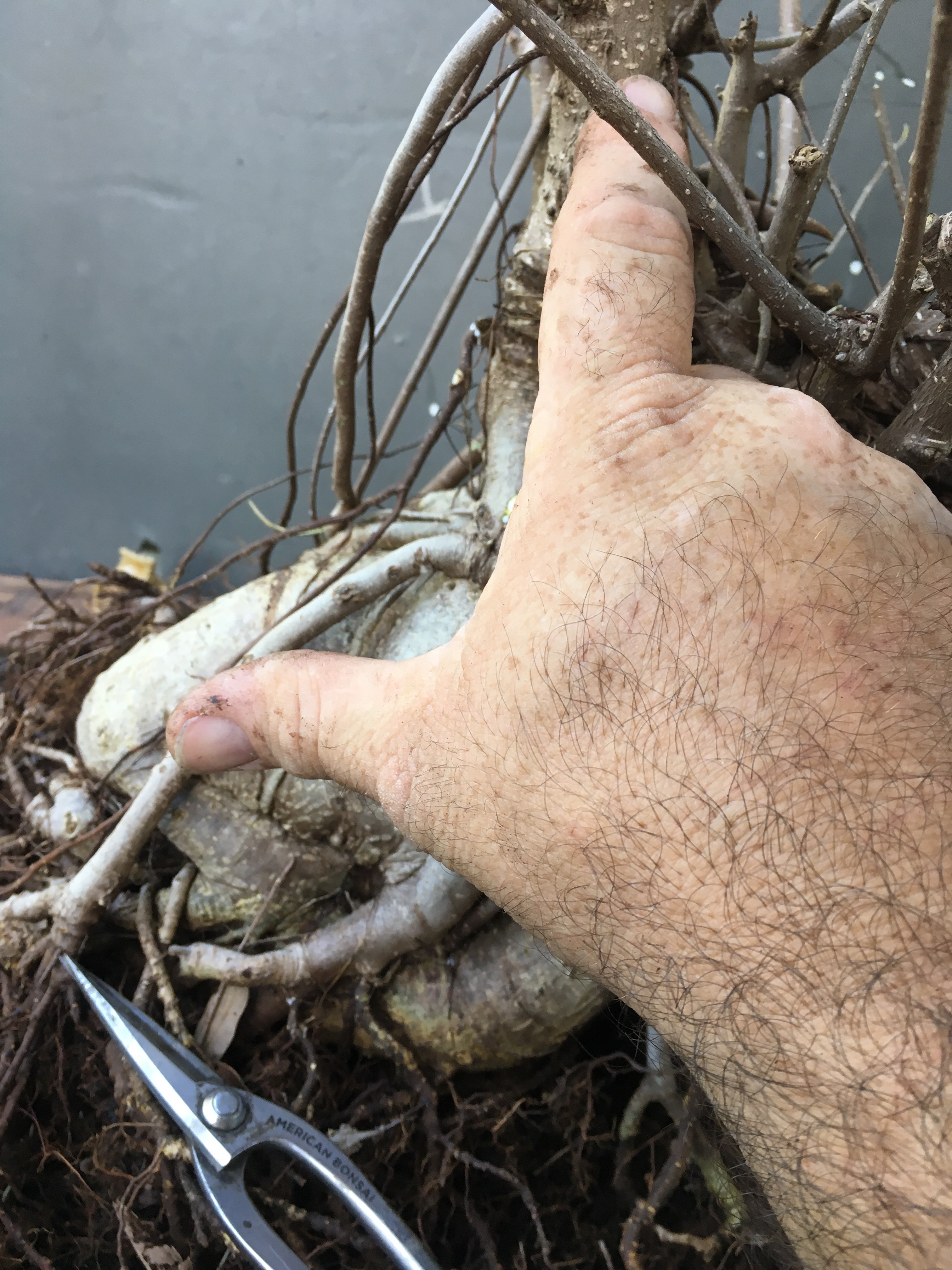 But, before I put the tree into the pot, I need to take care of those last roots. First, I’ll use this tiny one to fill in that hole I pointed out earlier.