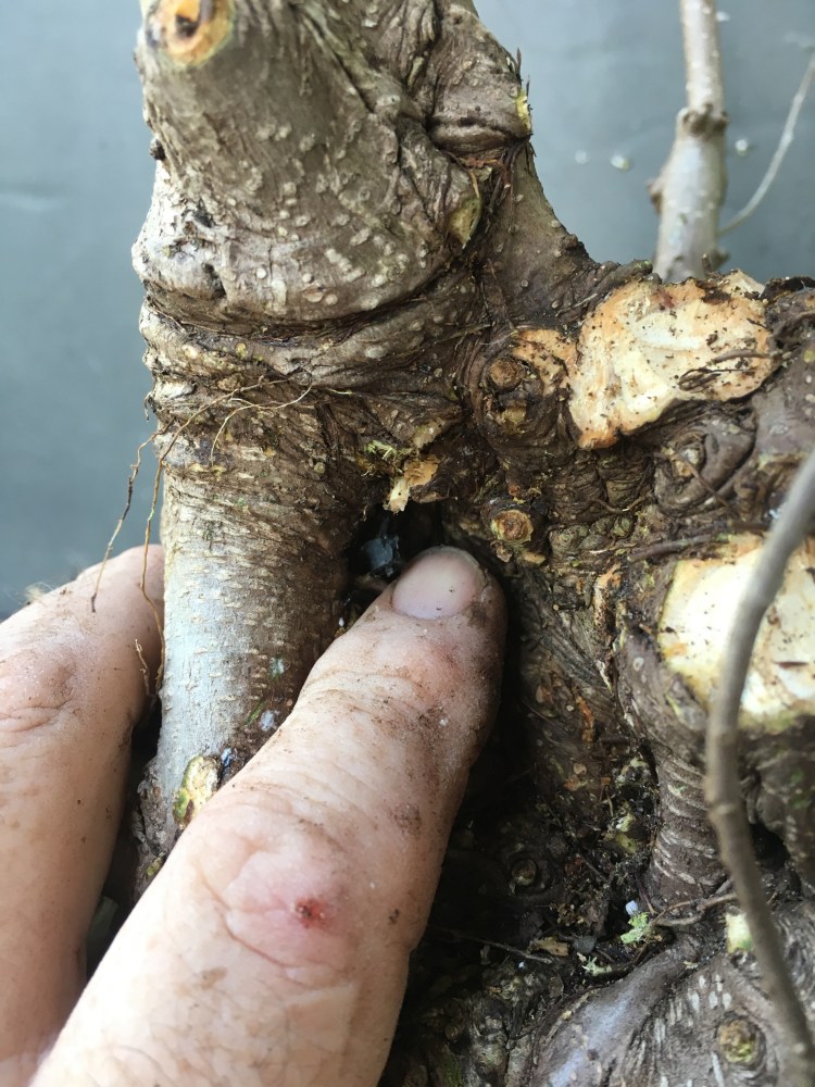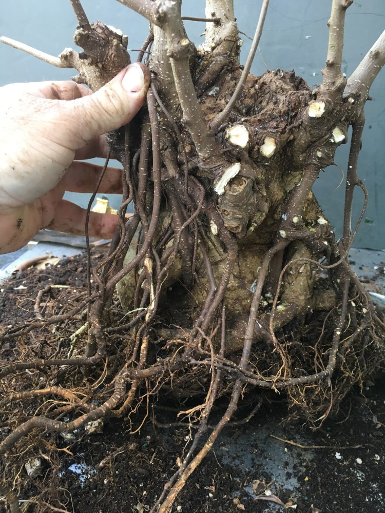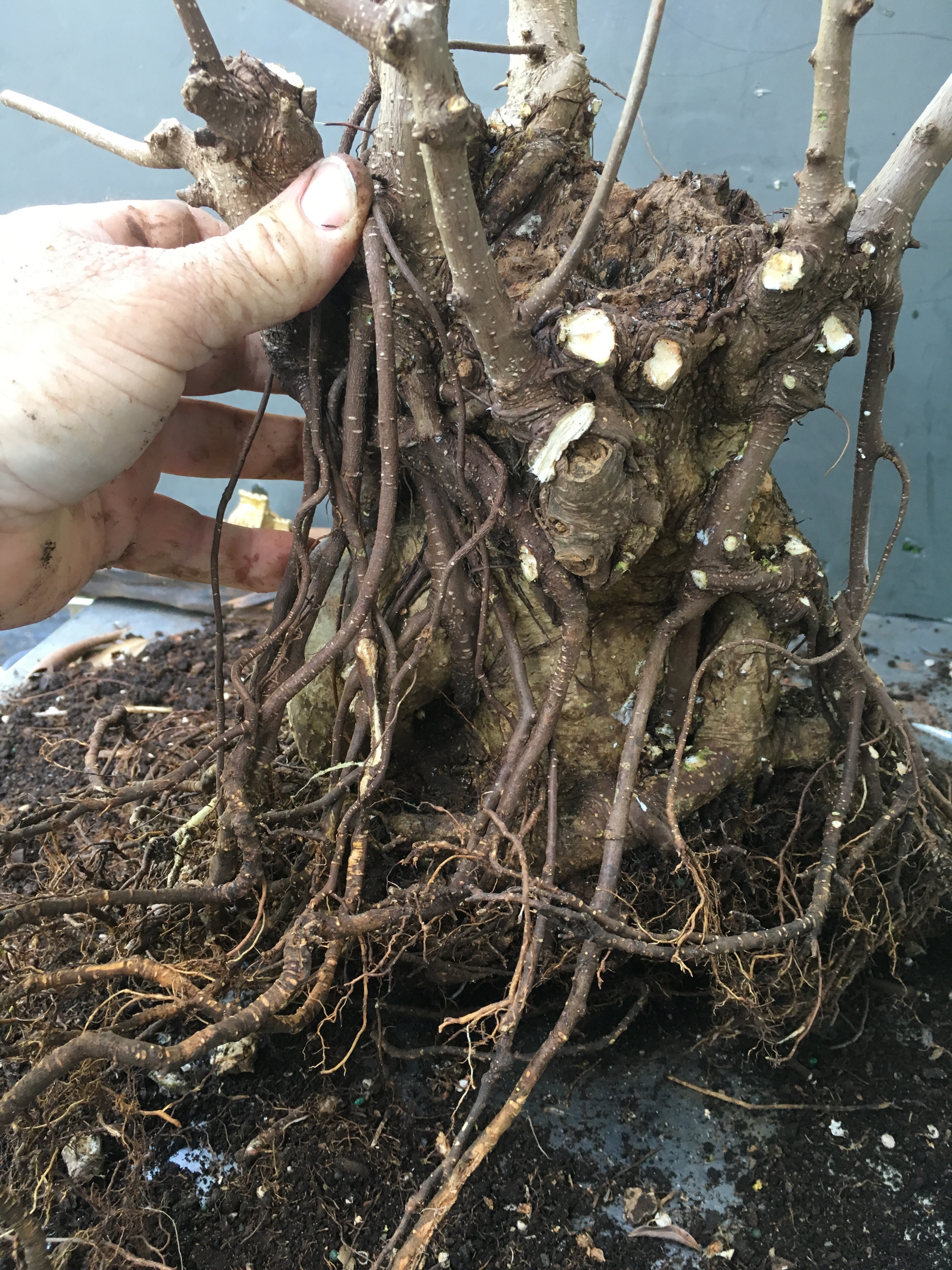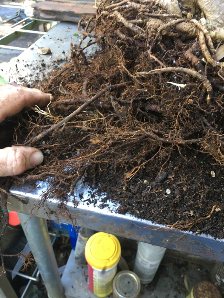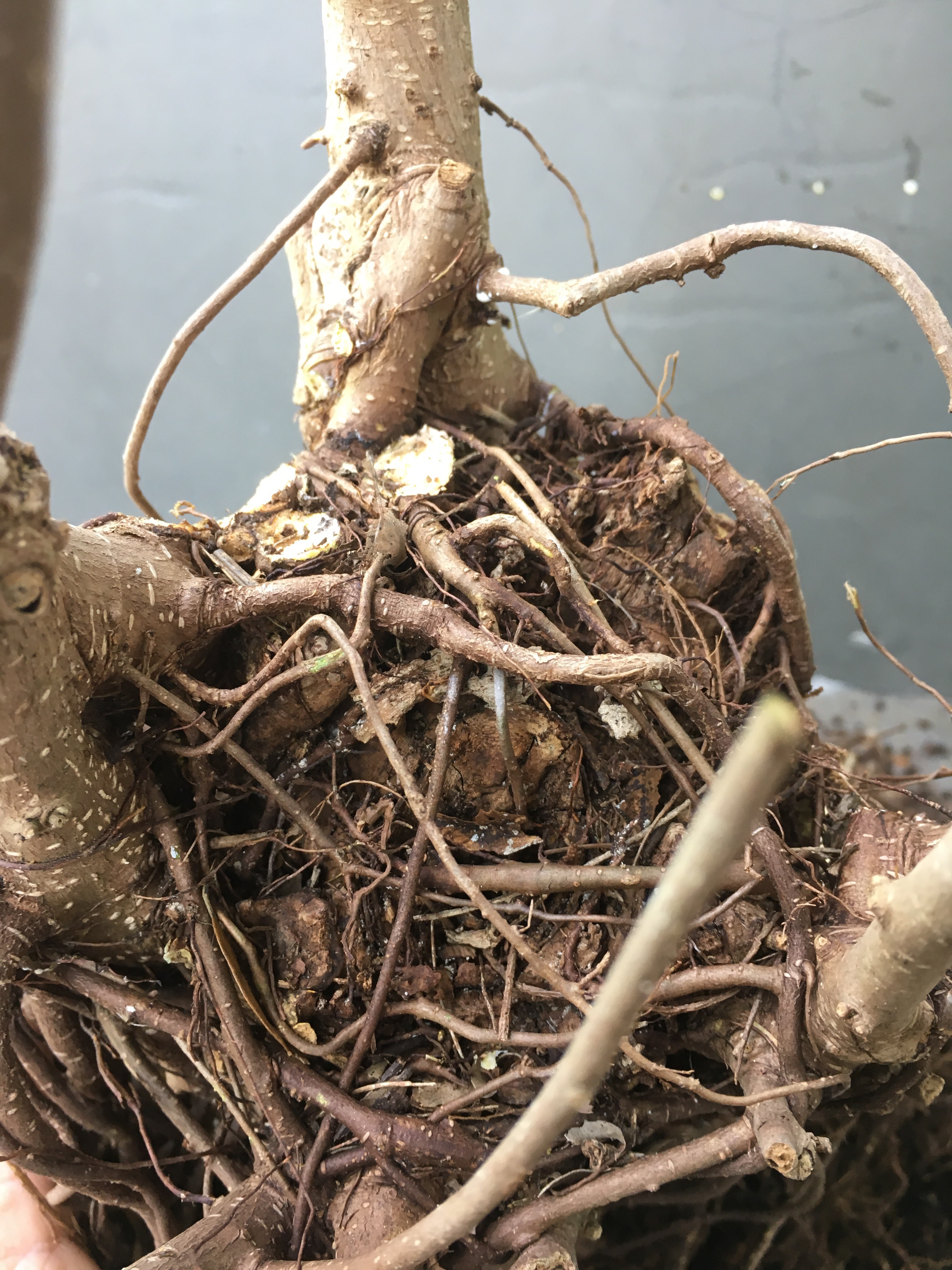But, before I put the tree into the pot, I need to take care of those last roots. First, I’ll use this tiny one to fill in that hole I pointed out earlier.