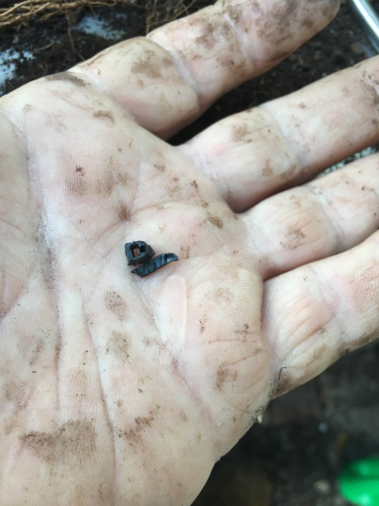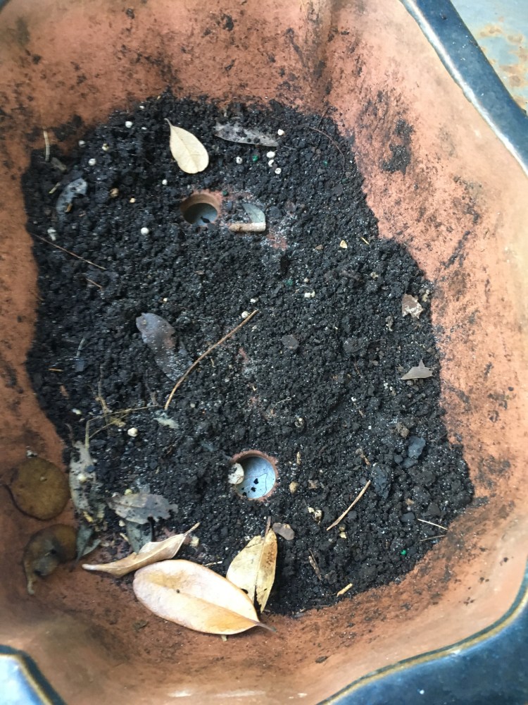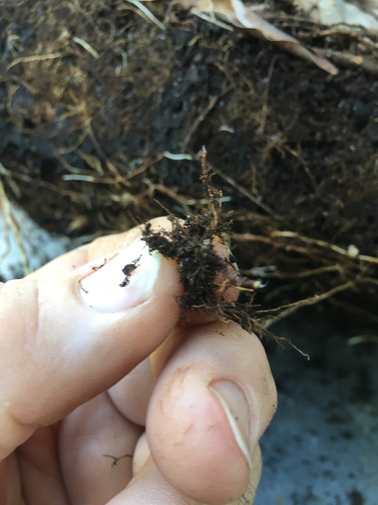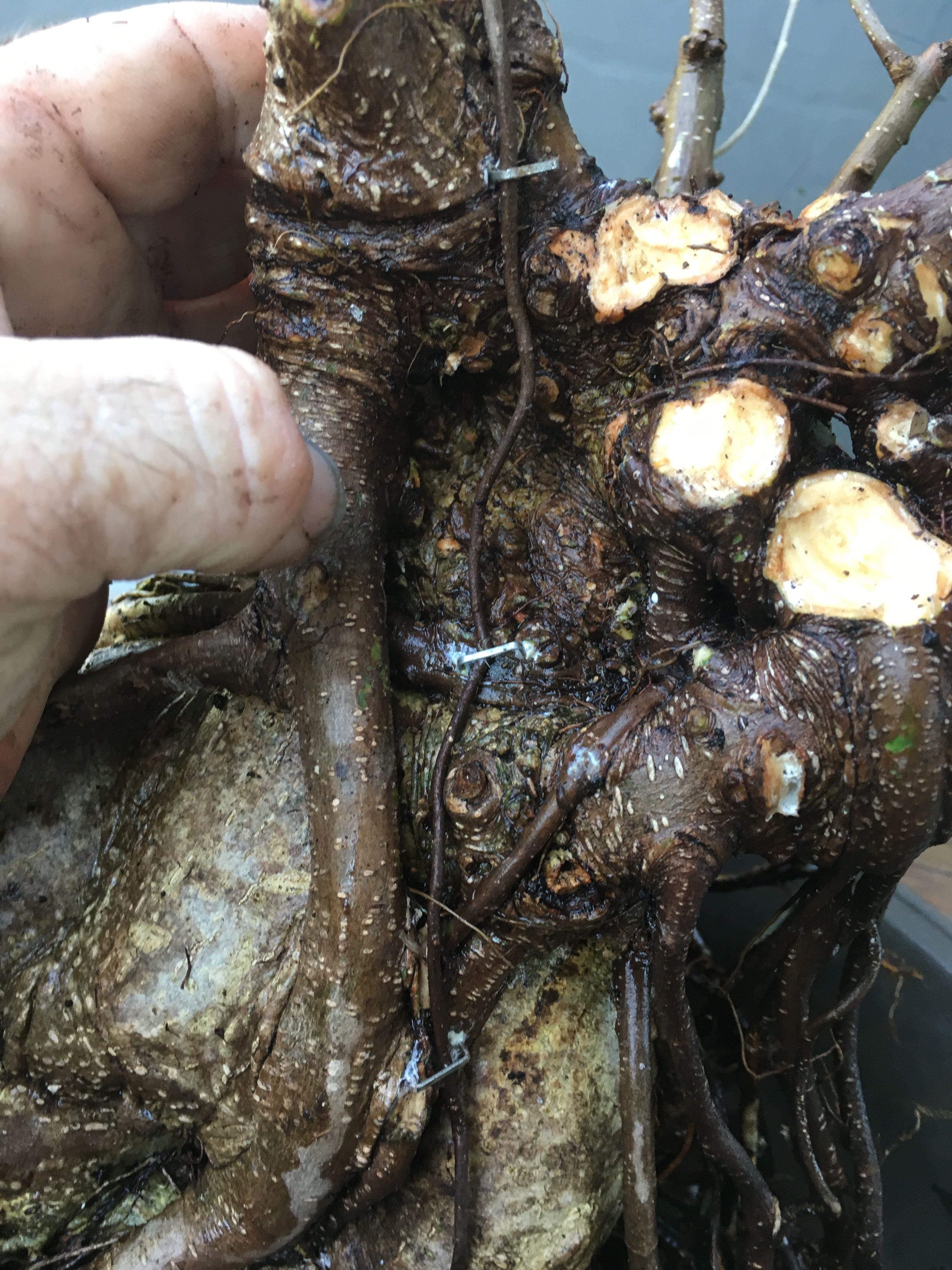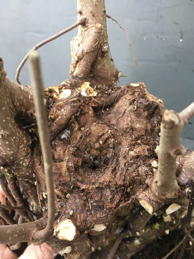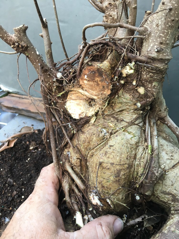 But, before I put the tree into the pot, I need to take care of those last roots. First, I’ll use this tiny one to fill in that hole I pointed out earlier.