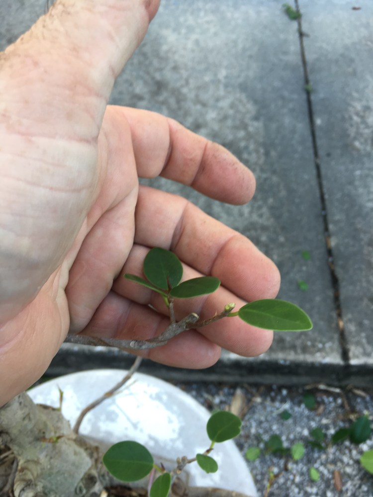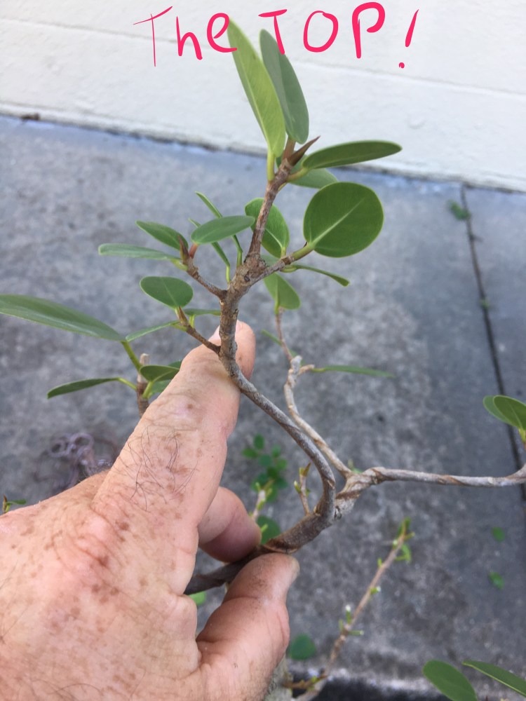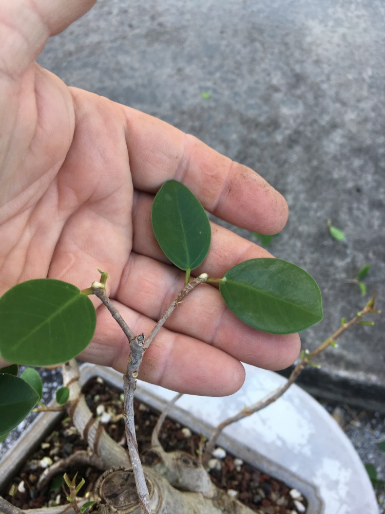 You’ll notice that I leave a leaf (great band name) on those branches where I cut back for taper or backbudding. The reason is that the green island ficus microcarpa (as well as the green mound variety) are not very apically dominant. What that means is that they are more bush like and not tree like (this could explain why most junipers need to be treated the same way, they’re bushes, not trees….hmmmmmnnn) they want to grow sideways, not up. By leaving green, we are giving the branch indication that it is still viable and alive (the cells have within them two genes that are turned on or off, by hormones, so that they will either grow one way or another. Like if it’s cold, it won’t grow or if it’s arid the cell won’t divide. The same cell, but differing actions. Cool, and we just learned of it this year too. It pays to read and continue to learn, ain’t it?).
