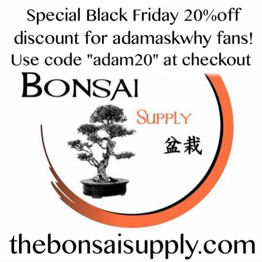 Before I go, I have entered into a partnership with The Bonsai Supply, and they are offering an exclusive, adamaskwhy.com 20% discount for Black Friday, Shop Small Saturday, and Cyber Monday, on their pots, soil, tools, etc., to my blog readers, Instagram followers and Facebook friends. The code is valid from November 24-27th. To take advantage of it, go here https://thebonsaisupply.com/discount/ADAM20