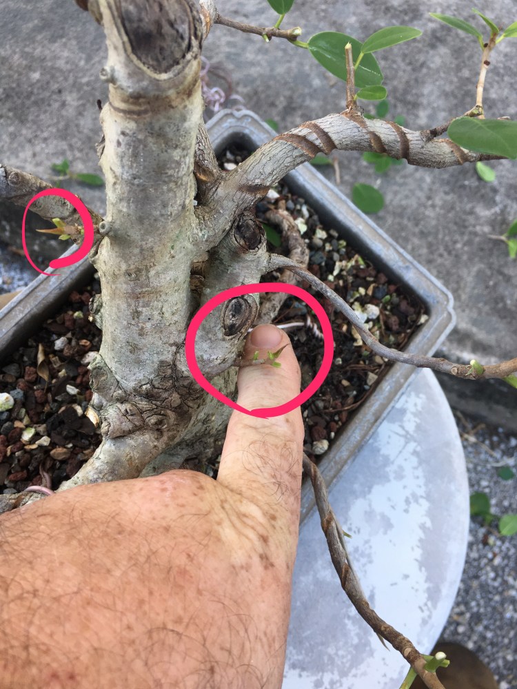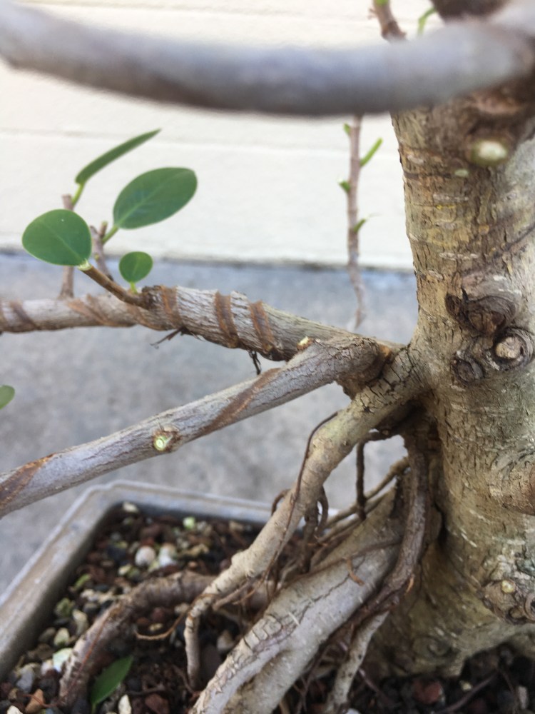 Contrary to common teaching, these scars are necessary and they will grow out. Well, they’re not, per se, needed but the branch generally will pop back up after wire removal, if they don’t scar, on a ficus, as scarring is the result of the branch growing and the purpose of wiring is to make the branch stay were we place it, and that happens when the branch…grows new material. Those that say otherwise are either not long enough into growing ficus or are trained in non tropical species and think that they can apply that knowledge to figs.
