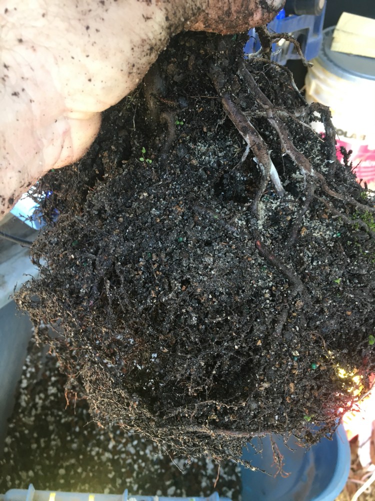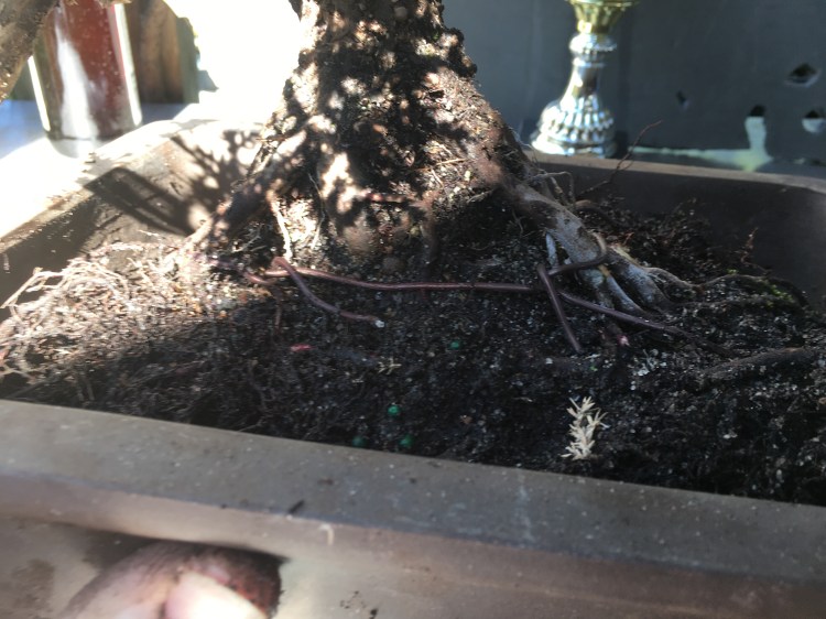 I gently massage the old soil out of the roots (you could consider this an initial potting really, there was only bonsai soil as a top dressing, the rest was regular potting soil).