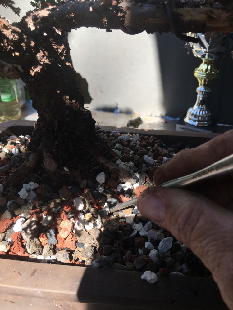 By putting new soil on top and gently pushing it between the roots, that new soil is replacing the old soil, pushing it to the bottom on the sides. When the next repot comes, we will have achieved 100% bonsai soil, if we follow the same repot regimen.